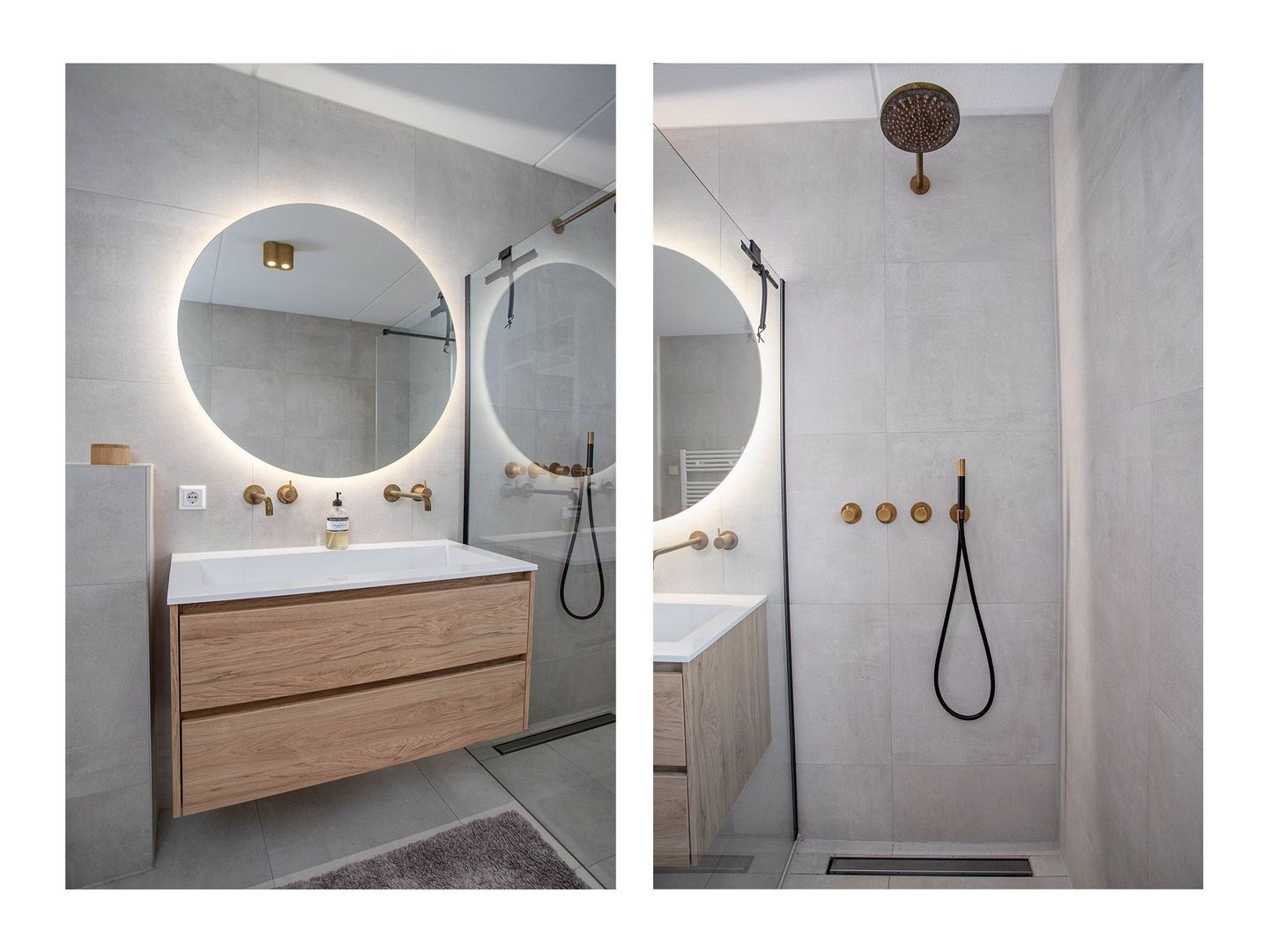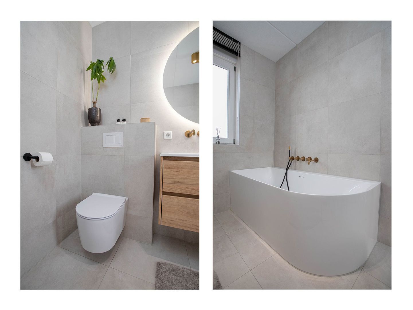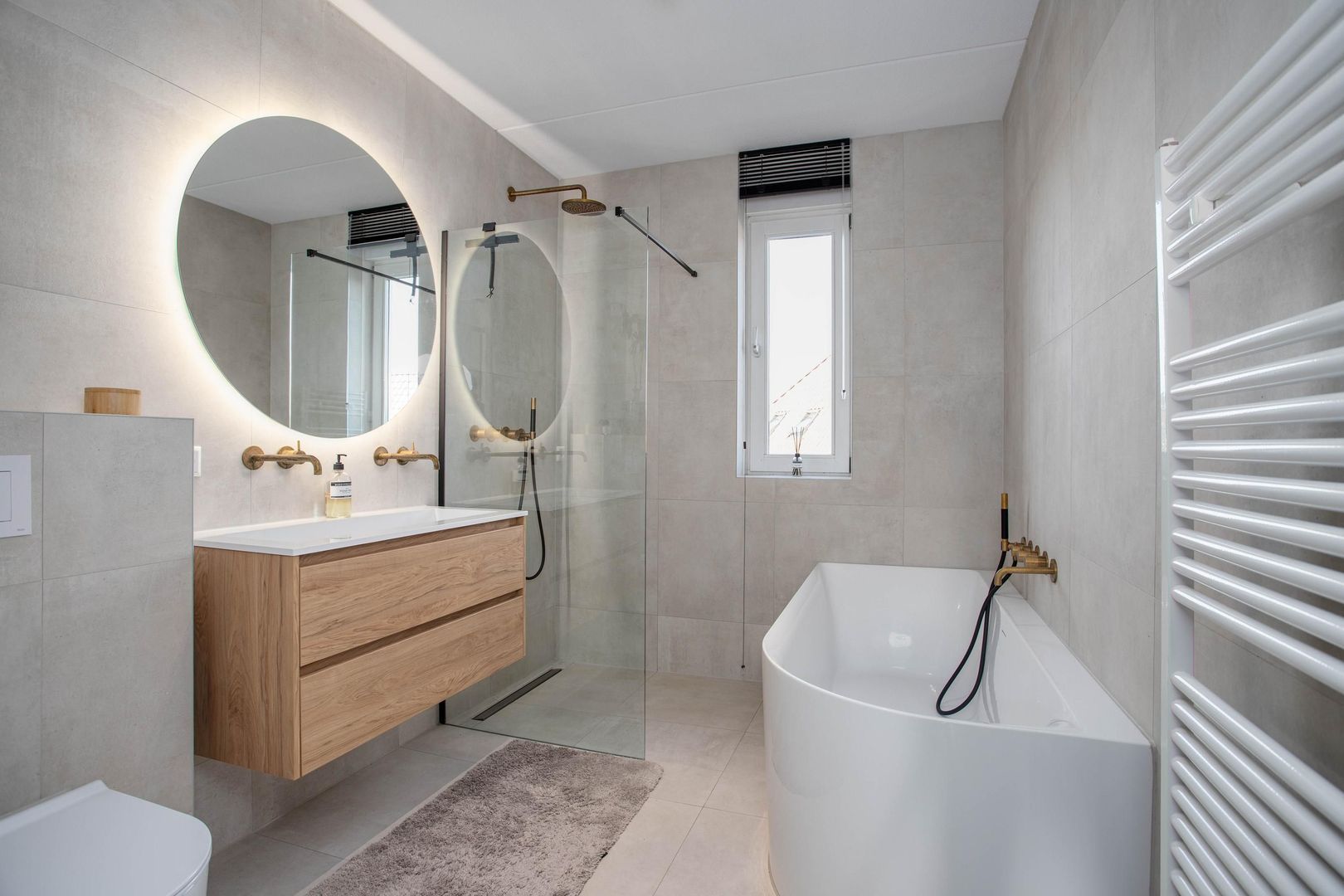 1e Verdieping: custom stalen trapleuningen op maat gemaakt, royale overloop, 3 slaapkamers, allen voorzien van laminaatvloeren. Moderne badkamer voorzien van ligbad met douche, toilet en wastafel.