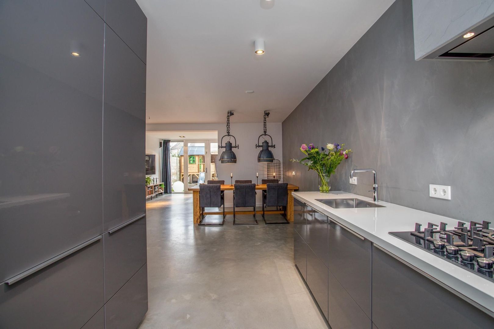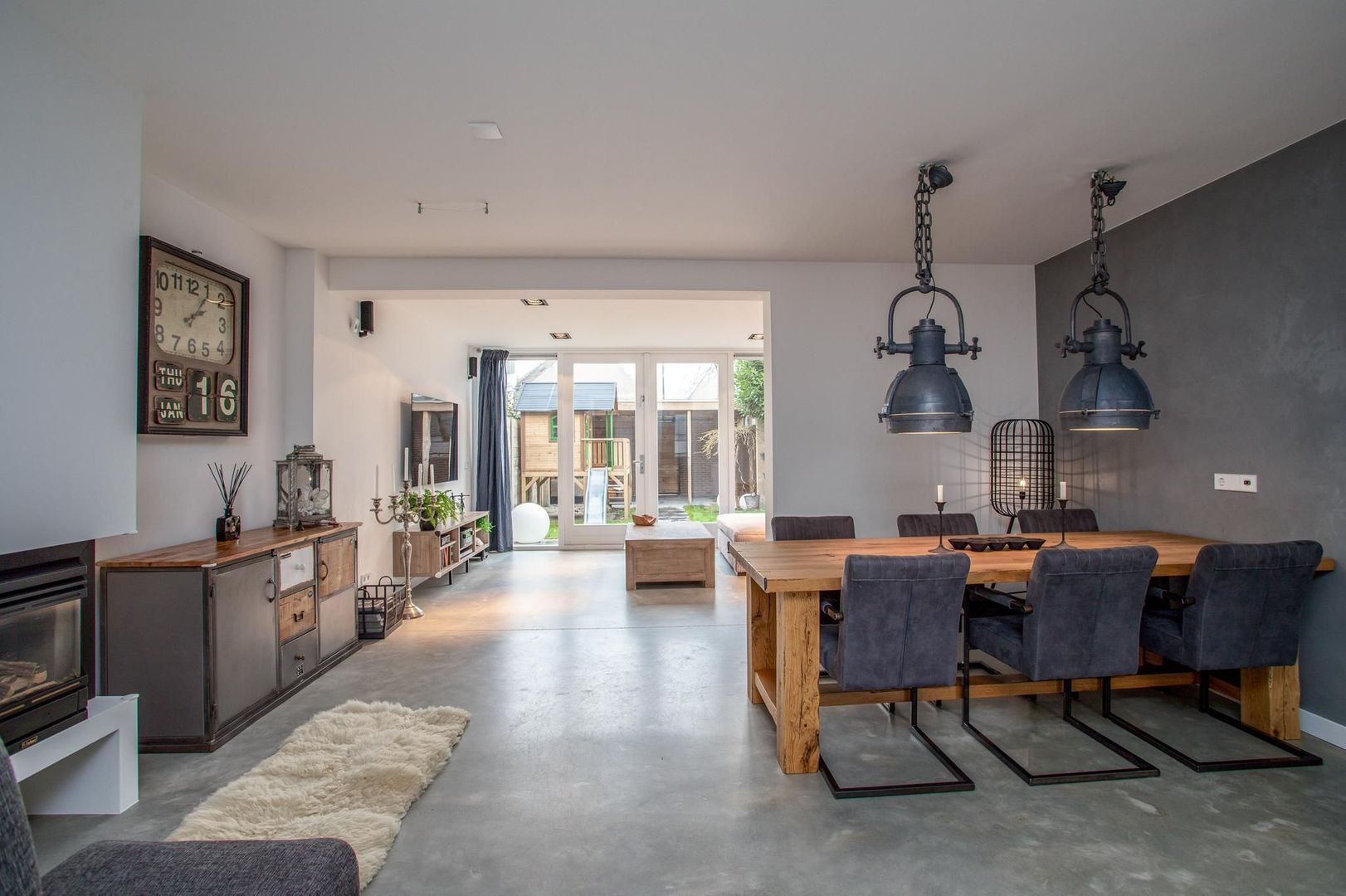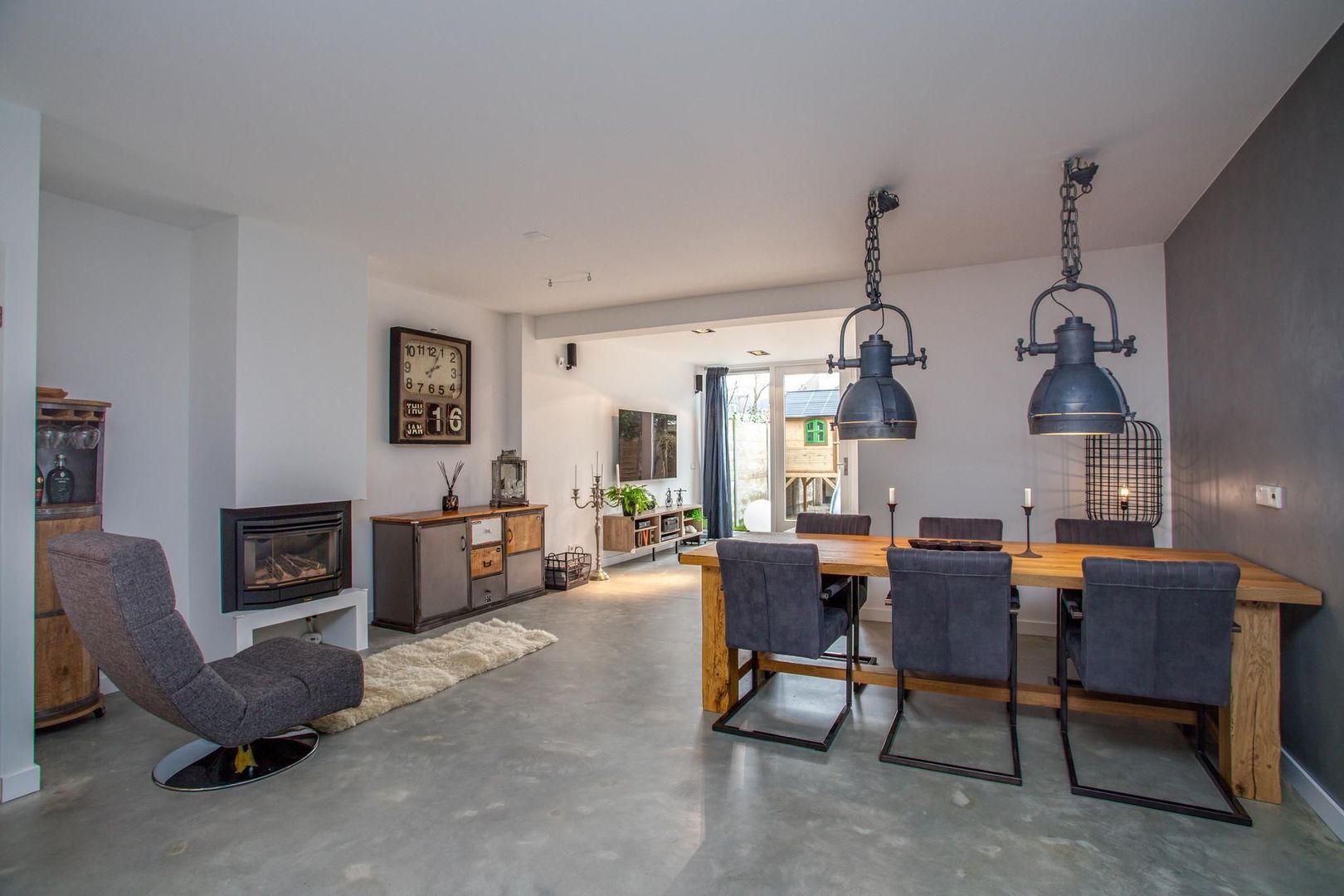 De woning betreed je via je fraai aangelegde voortuin. Bij binnenkomst door de voordeur kom je in de gang, die toegang biedt tot de woon/eetkamer, het toilet, de trapopgang, de trapkast en de meterkast. De vloer op de begane grond is voorzien van vloerverwarming. De ruime eetkamer met open haard biedt voldoende ruimte voor een lange eettafel, waar je heerlijk kunt dineren met uitzicht op de open keuken. De keuken heeft voornamelijk grijstinten, een wit werkblad en zilveren details. Daarnaast is de keuken uitgerust met de volgende inbouwapparatuur: vaatwasser, 5-pits gasfornuis, afzuigkap, oven, magnetron, koelkast, vriezer en Quooker. De woonkamer is gedeeltelijk afgeschermd van de eetkamer, wat een fijne hoek creëert voor het plaatsen van een groot bankstel. Grote raampartijen en openslaande deuren richting de tuin zorgen voor een heerlijke lichtinval in de kamer. De tuin, gelegen op het zuidwesten, heeft zowel tegels als gras, en achterin vind je een grote overkapping met een houtkachel. De tuin is een heerlijke plek om met het hele gezin te genieten van zowel de zon als de schaduw. Via de overkapping kun je achterom, waar zich een eigen parkeerplaats en berging bevinden.