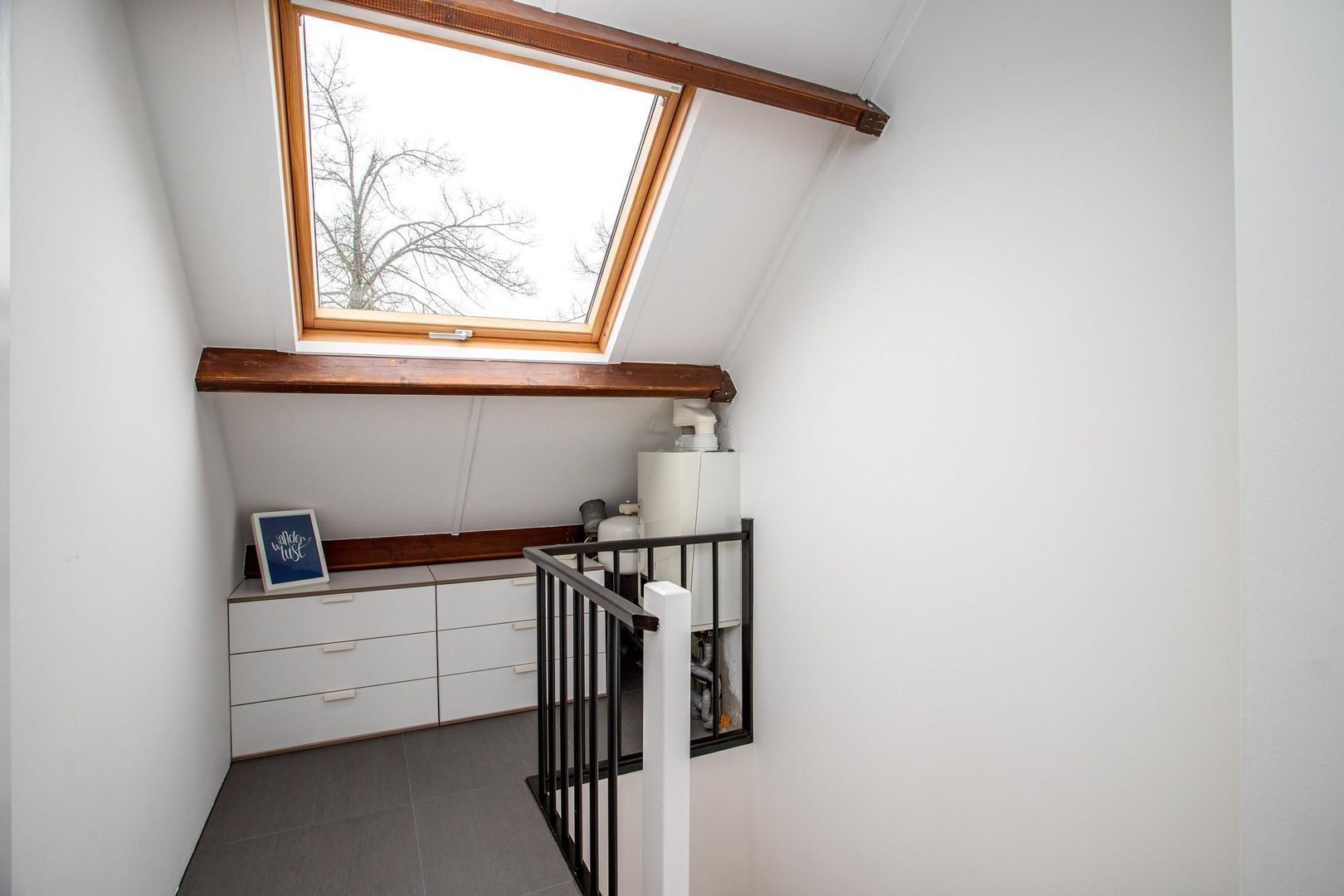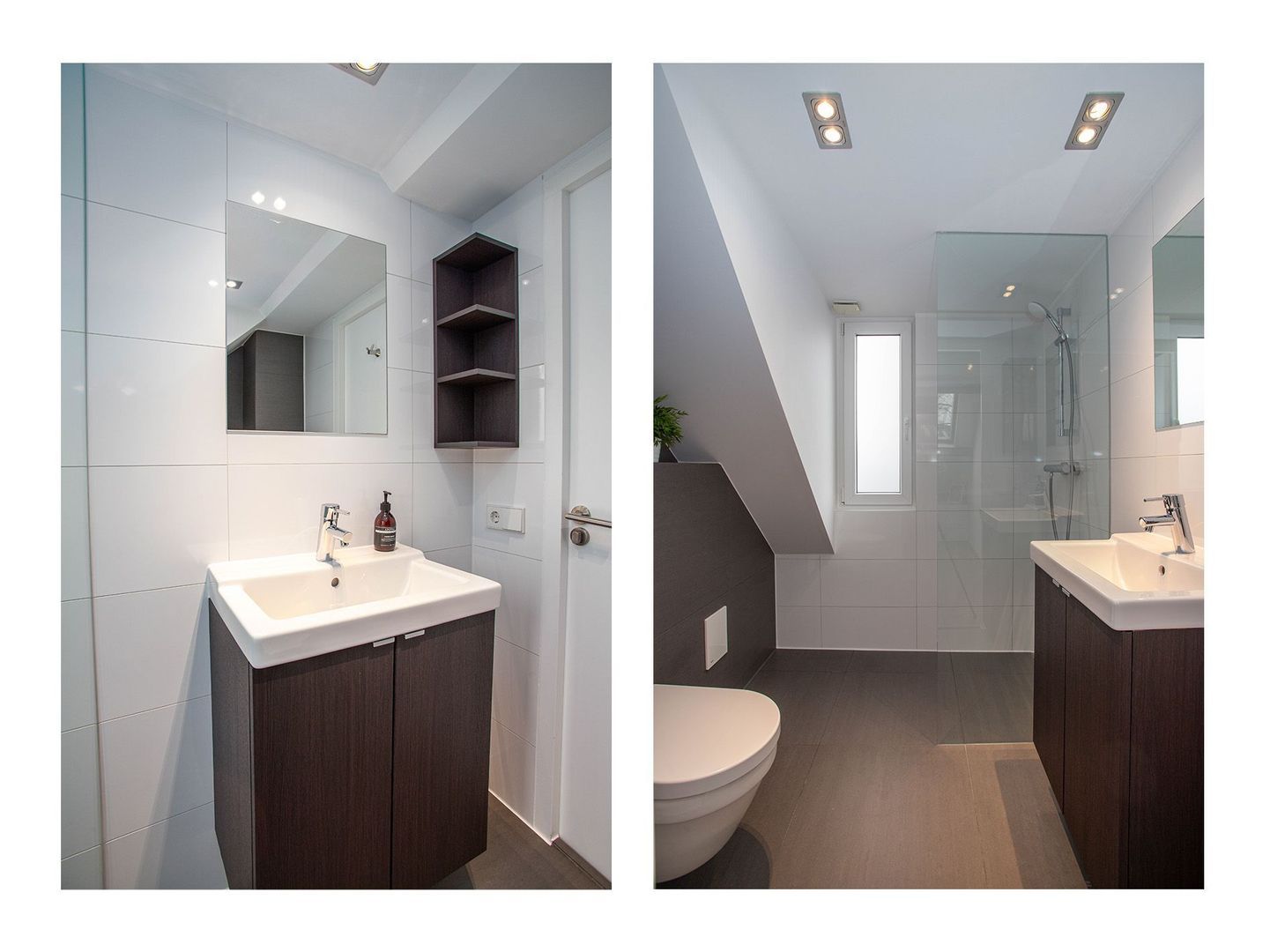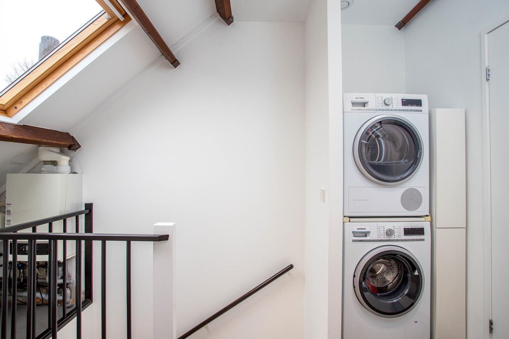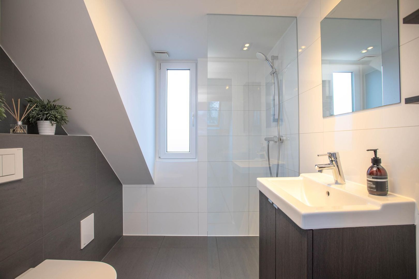 De overloop biedt een fijne opstelplaats voor de witgoedinstallaties en hier bevindt zich ook de cv-ketel. Daarnaast geeft de overloop toegang tot een slaapkamer en de tweede badkamer. De ruime slaapkamer heeft een dakkapel, waardoor je bijna in de hele kamer kunt staan, en wordt momenteel gebruikt als logeer- en werkkamer. De badkamer is erg netjes en voorzien van een toilet, een inloopdouche, een wastafel met wastafelmeubel en vloerverwarming.