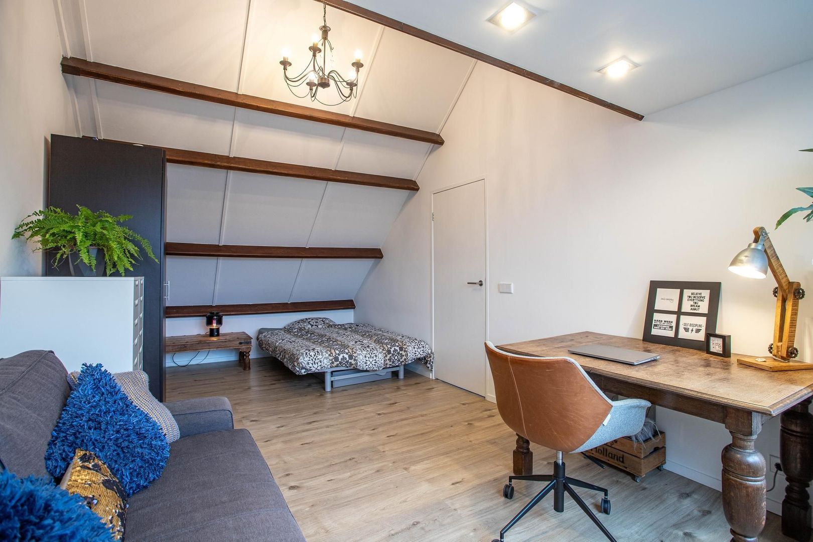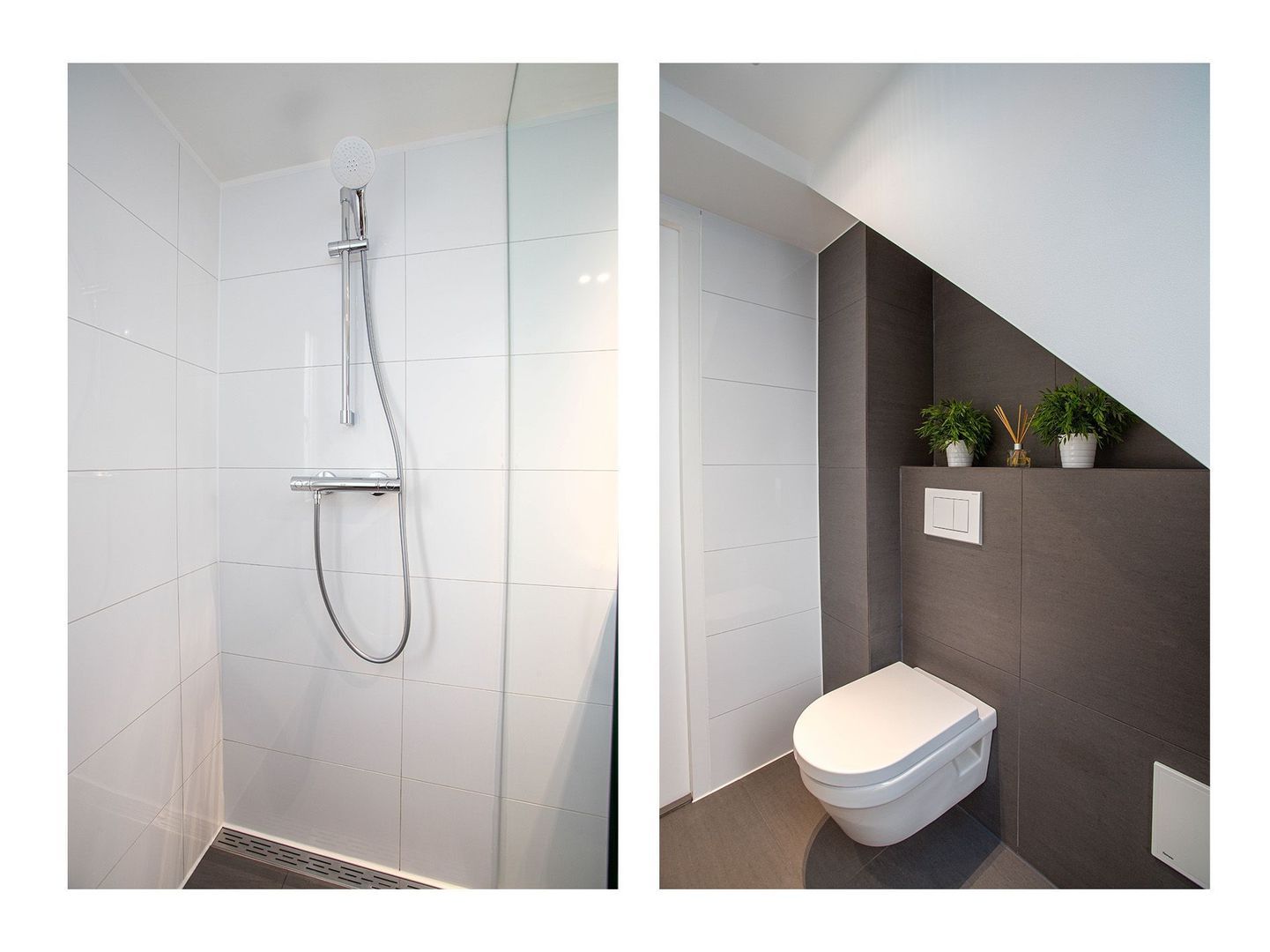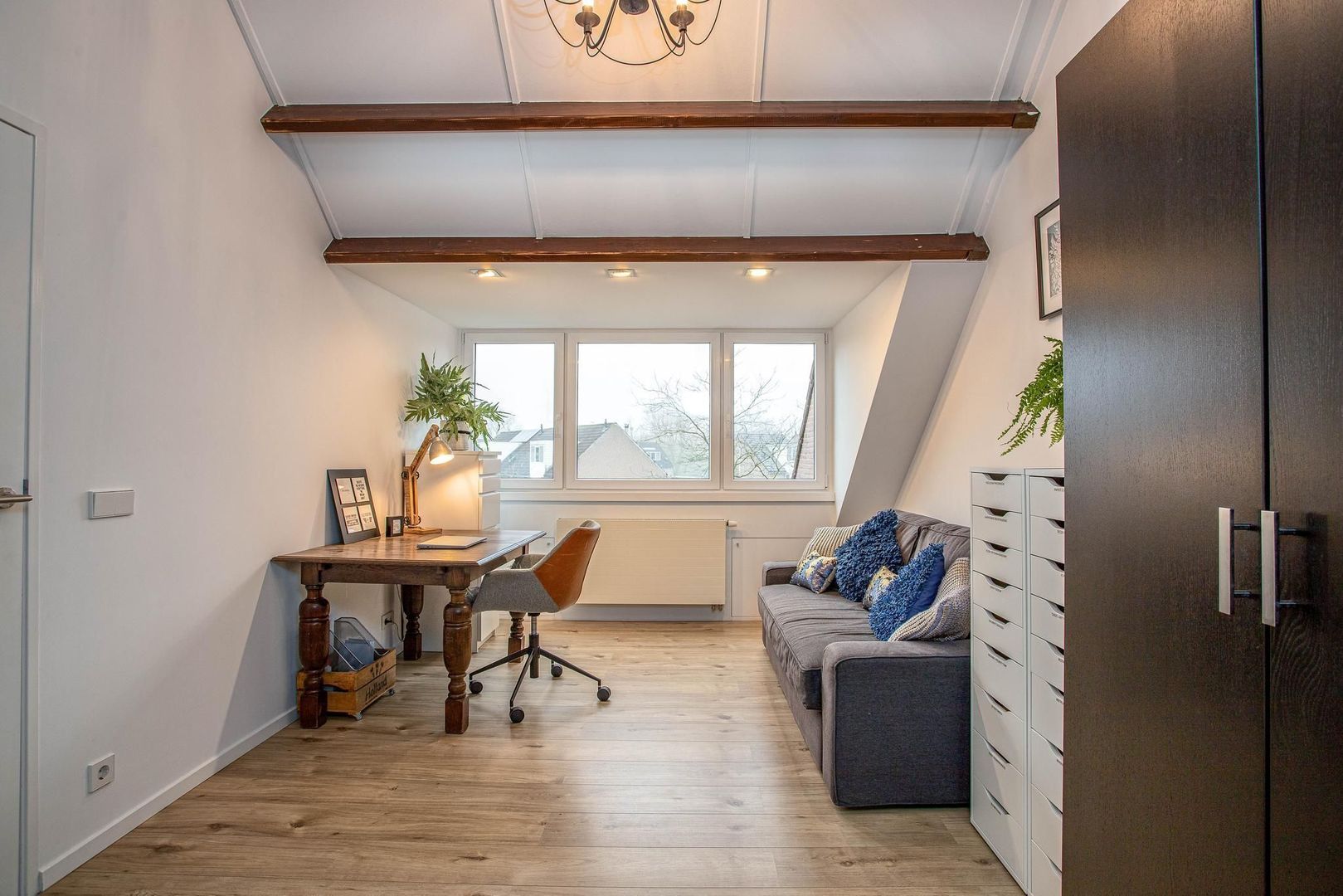 De overloop biedt een fijne opstelplaats voor de witgoedinstallaties en hier bevindt zich ook de cv-ketel. Daarnaast geeft de overloop toegang tot een slaapkamer en de tweede badkamer. De ruime slaapkamer heeft een dakkapel, waardoor je bijna in de hele kamer kunt staan, en wordt momenteel gebruikt als logeer- en werkkamer. De badkamer is erg netjes en voorzien van een toilet, een inloopdouche, een wastafel met wastafelmeubel en vloerverwarming.