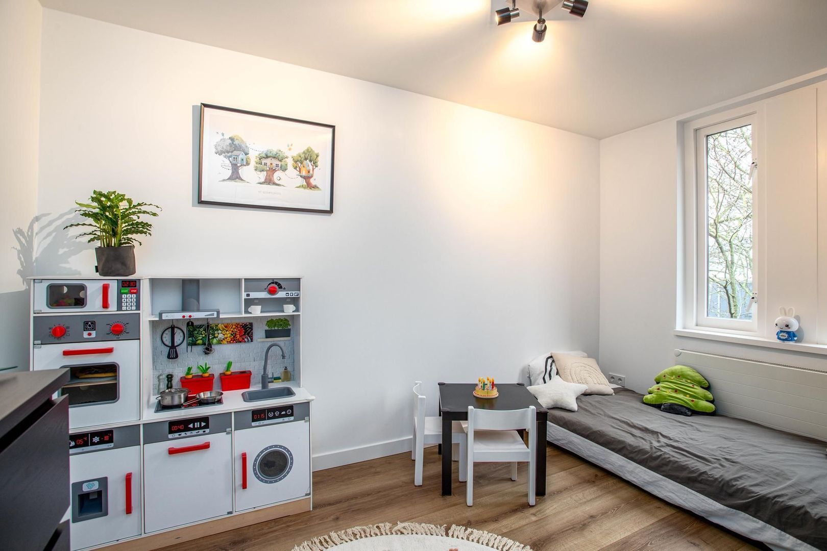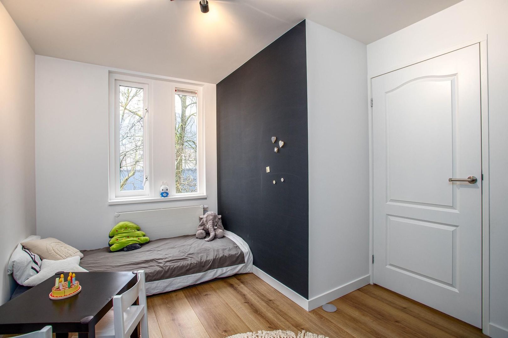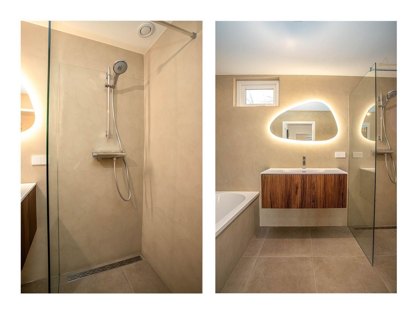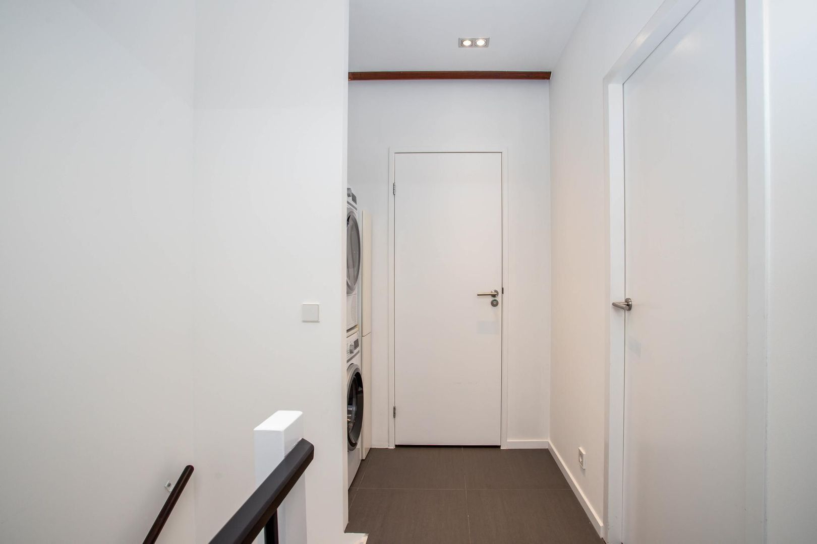De overloop biedt een fijne opstelplaats voor de witgoedinstallaties en hier bevindt zich ook de cv-ketel. Daarnaast geeft de overloop toegang tot een slaapkamer en de tweede badkamer. De ruime slaapkamer heeft een dakkapel, waardoor je bijna in de hele kamer kunt staan, en wordt momenteel gebruikt als logeer- en werkkamer. De badkamer is erg netjes en voorzien van een toilet, een inloopdouche, een wastafel met wastafelmeubel en vloerverwarming.