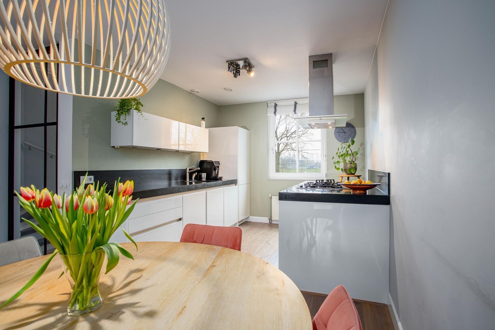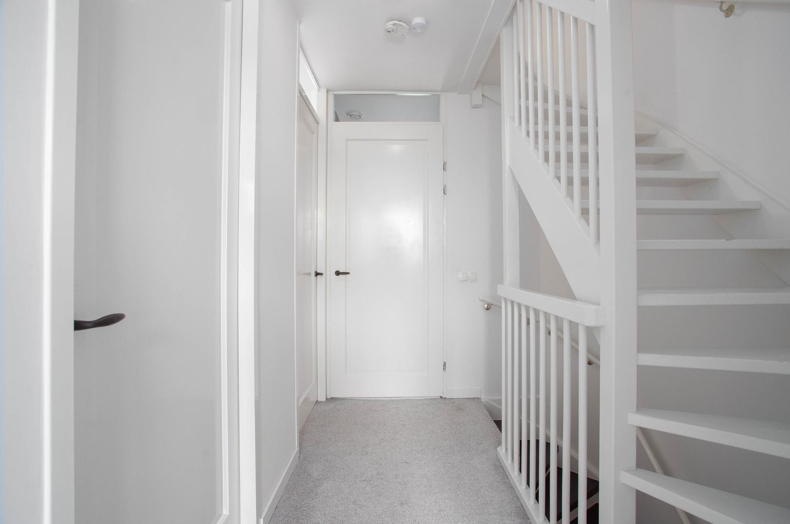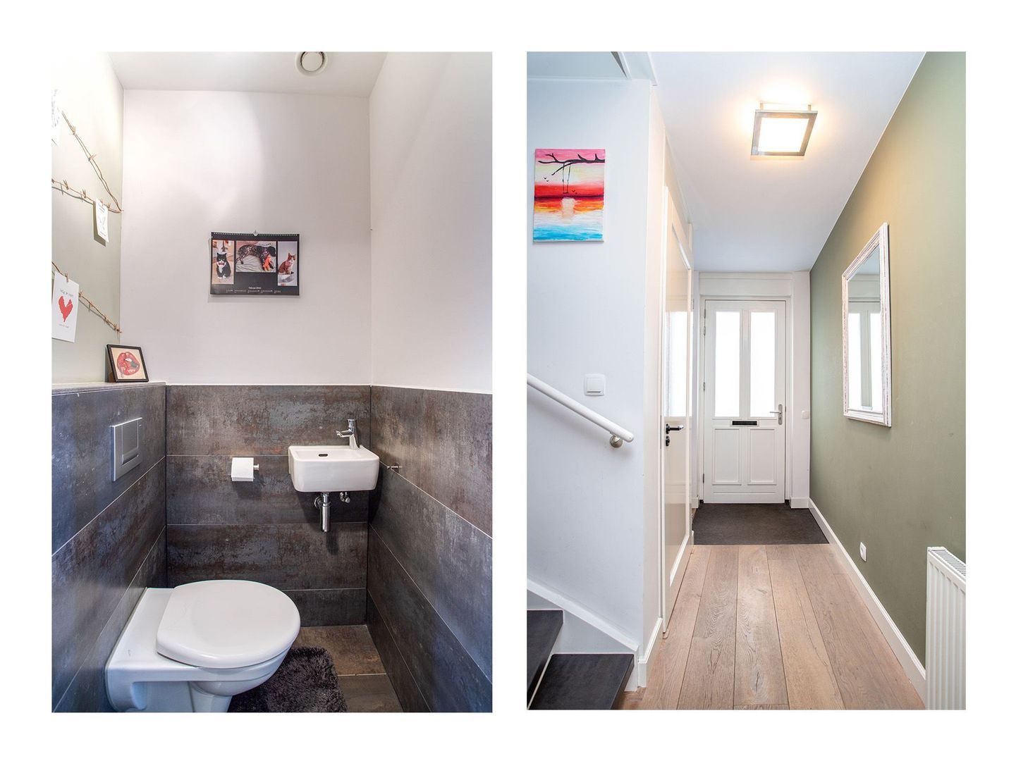 Begane grond: Entree, royale hal met toiletruimte voorzien van hangend sanitair en fonteintje, meterkast en trap naar 1e verdieping. Vanuit de hal treed je via een prachtige stalen deur de kamer binnen. De keuken is strak vormgegeven in hoogglans wit en heeft veel werkruimte door de extra diepe, natuurstenen aanrechtbladen. De keuken is voorzien van 5-pits gaskookplaat, afzuigkap, combimagnetron, vaatwasser, koelkast, vriezer (alles Siemens) en quooker. De woonkamer is aan de achterzijde uitgebouwd en daardoor heerlijk ruim. De woonkamer heeft een prachtige, op maat gemaakte, lage inbouwkast met veel bergruimte in lades. De openslaande deuren bieden toegang tot de zonnige achtertuin. De gehele begane grond is voorzien van fraaie eiken vloer en strak gestuukte muren en plafond.