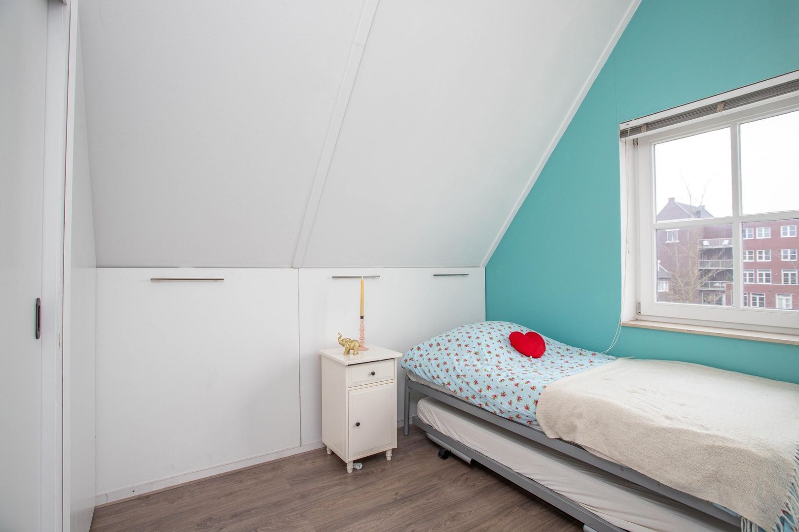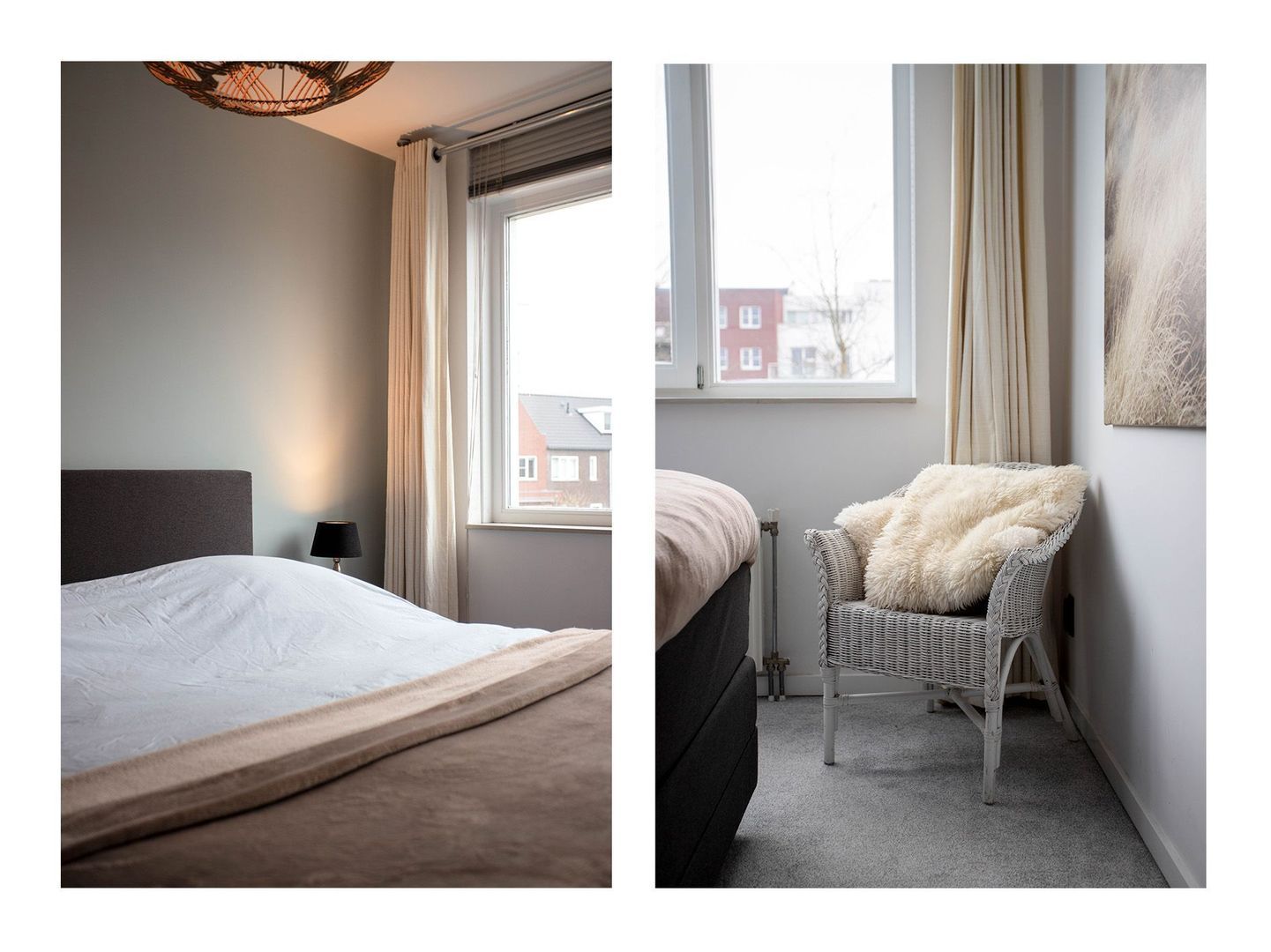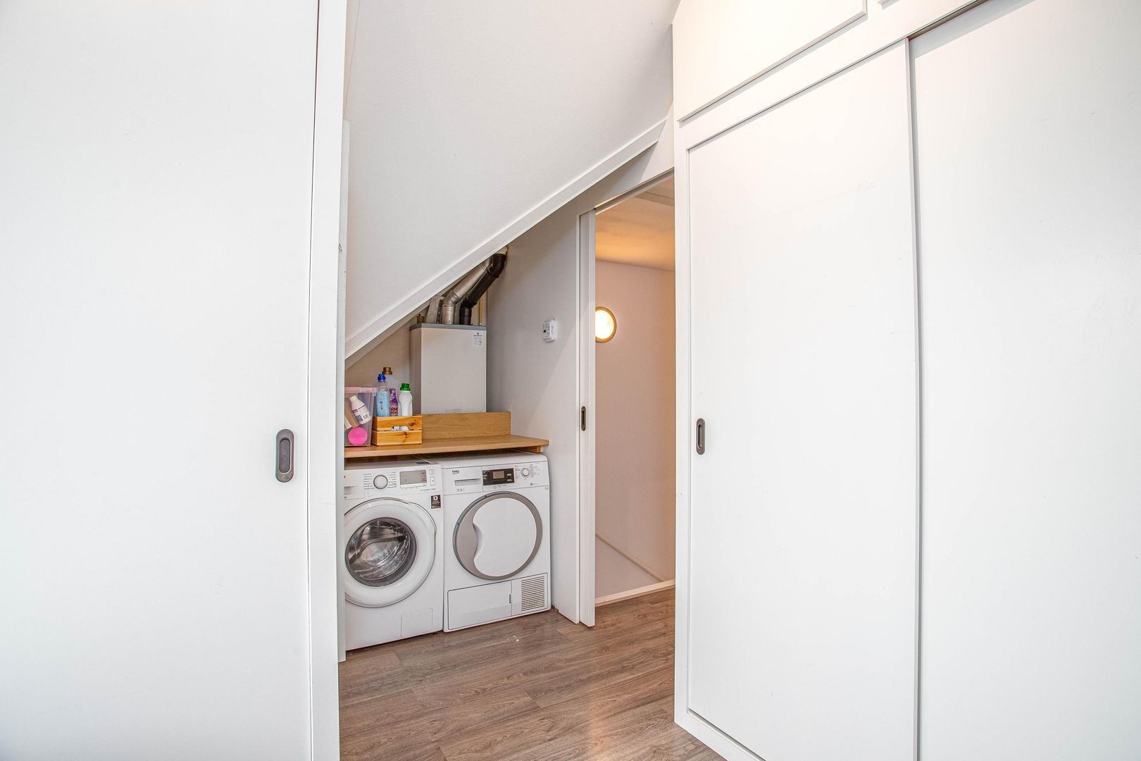 2e Verdieping: Vaste trap naar 2e verdieping. Hier bevindt zich de opstelplaats voor de CV-ketel en was- en drogeraansluiting. Op deze verdieping bevinden zich nog eens twee slaapkamers. Deze twee ruimtes worden van elkaar gescheiden door een fraaie, op maat gemaakte kastenwand met enorm veel bergruimte.