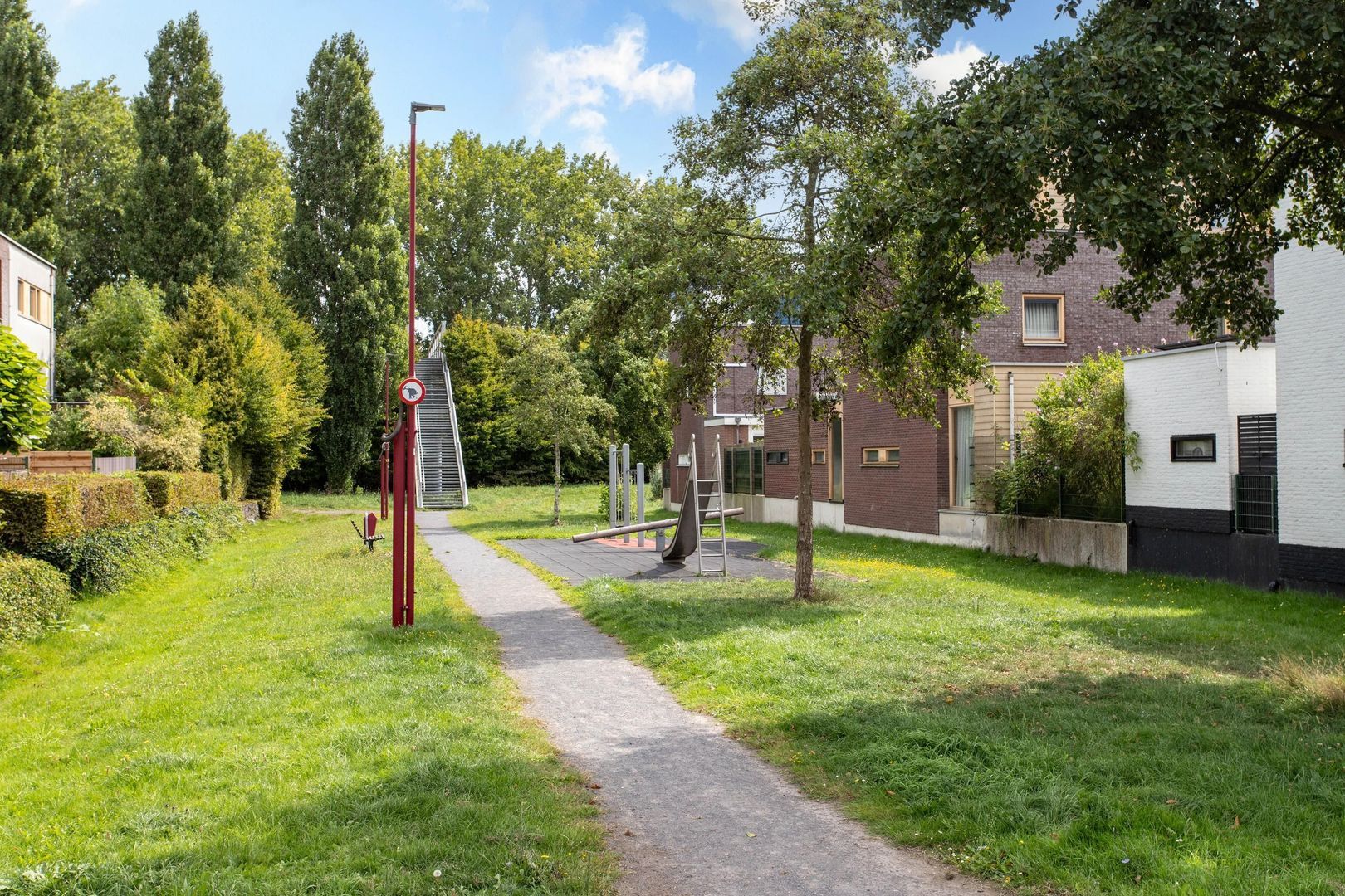 Met zijn ligging op het zuiden is het heerlijk vertoeven in deze zonnige tuin. Deze vergt weinig onderhoud en veel ruimte. De fraai aangelegde achtertuin grenst aan een groenstrook met bomen, speeltoestellen en speelmogelijkheden voor kinderen.