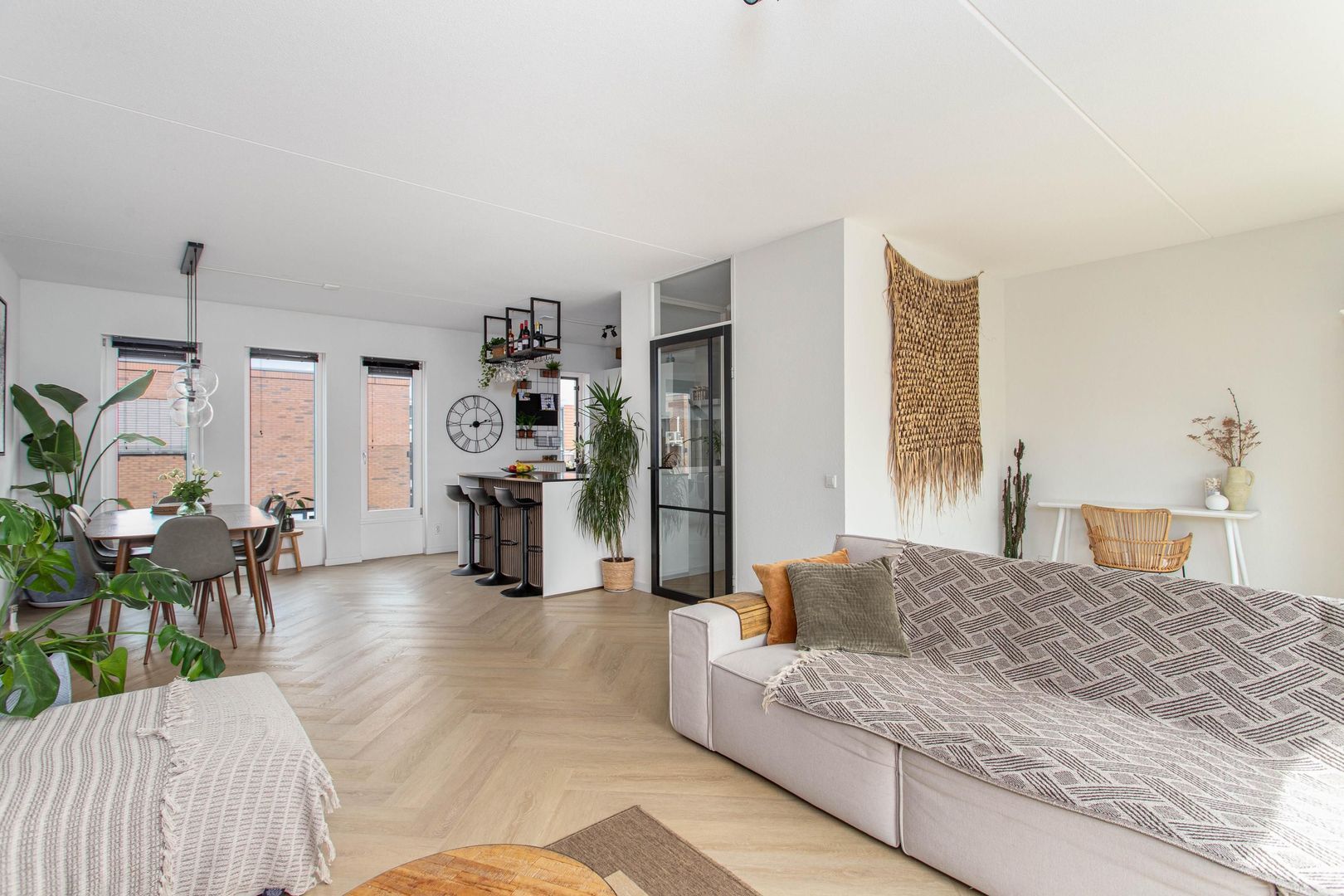 De eerste verdieping vormt een fijne leefruimte waar wonen en eten samenkomen. Hier bevindt zich de lichte woonkamer met grote raampartijen en een Frans balkon met openslaande deuren, wat zorgt voor veel daglicht en een prettig uitzicht op de tuin. De moderne open keuken is strak afgewerkt en voorzien van een kookeiland, wat de ruimte een uitnodigende en praktische sfeer geeft. Op de tweede verdieping liggen twee ruime slaapkamers, een praktische wasruimte en de badkamer, die recent deels cosmetisch is vernieuwd. De grote slaapkamer biedt bovendien de mogelijkheid om eenvoudig een vierde slaapkamer te creëren, mocht daar behoefte aan zijn.