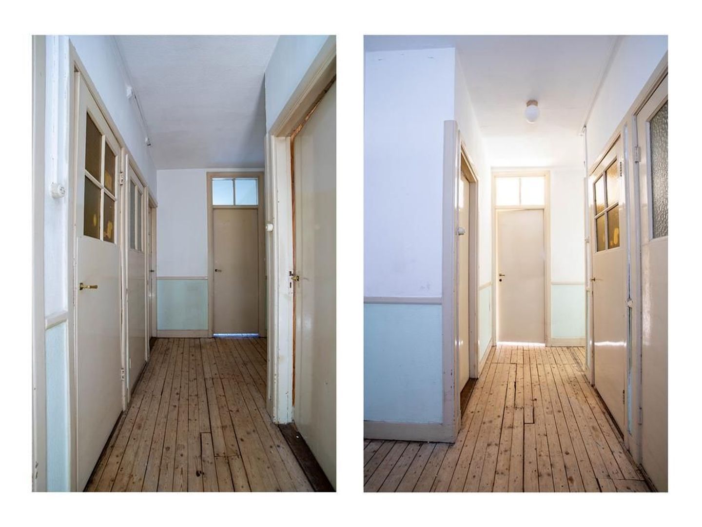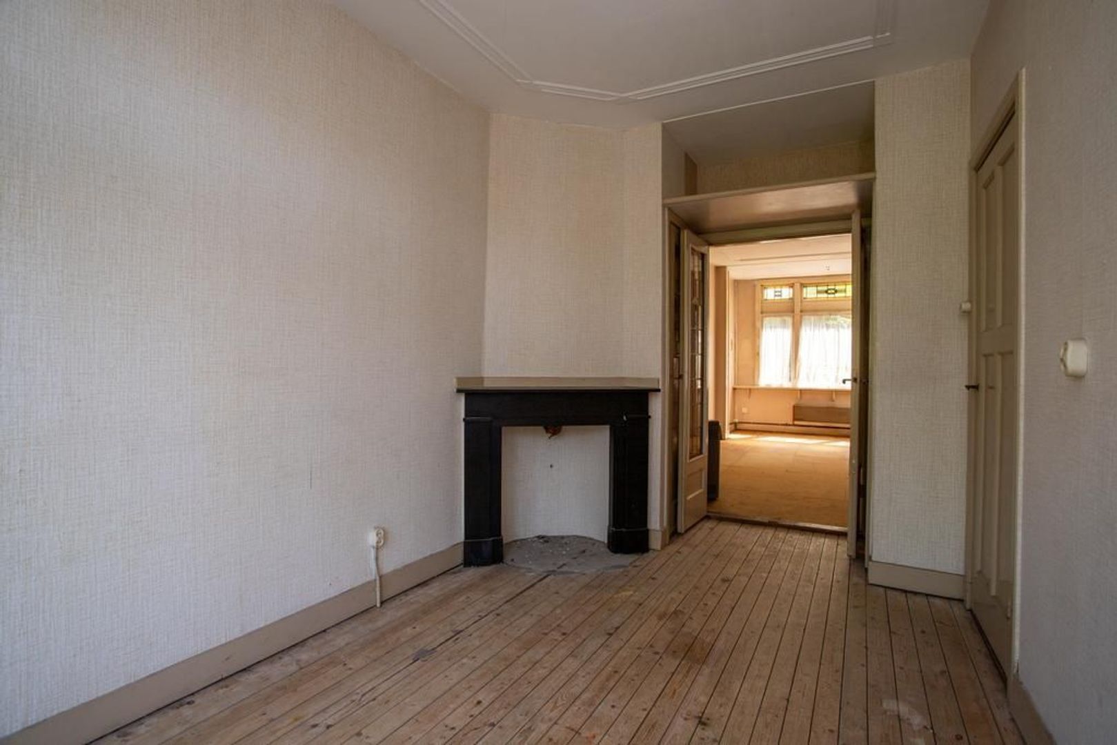 Overloop/hal met toegang tot alle vertrekken. Totaal zijn er momenteel 3 (slaap)kamers aanwezig van verschillende formaten. De woonkamer (kamer-en-suite) is ruim opgezet en dankzij de doorzonligging is er een prettig lichtinval. De keuken bevindt zich momenteel in een separate ruimte en vanuit de hal is de douche/toilet bereikbaar.