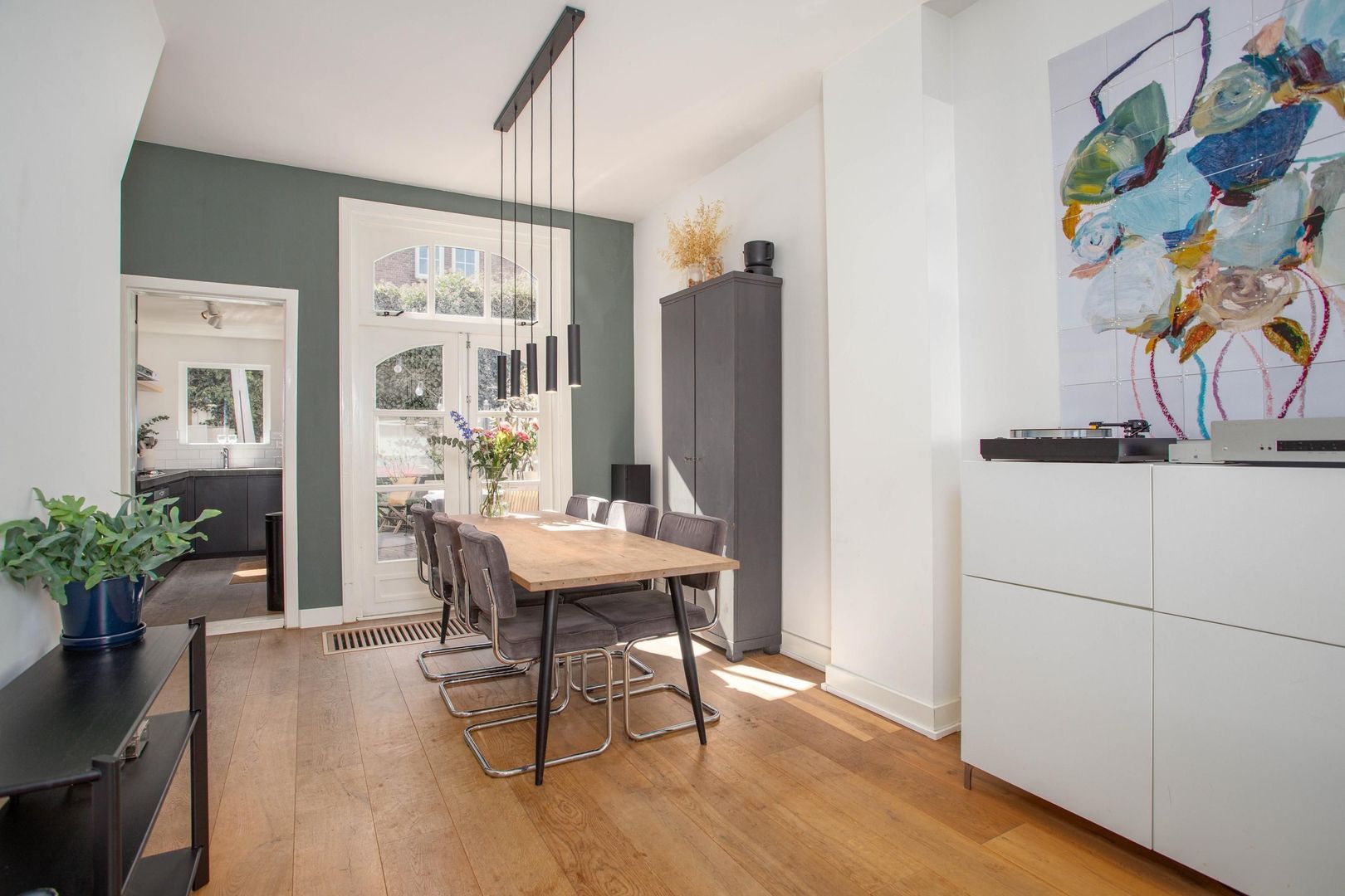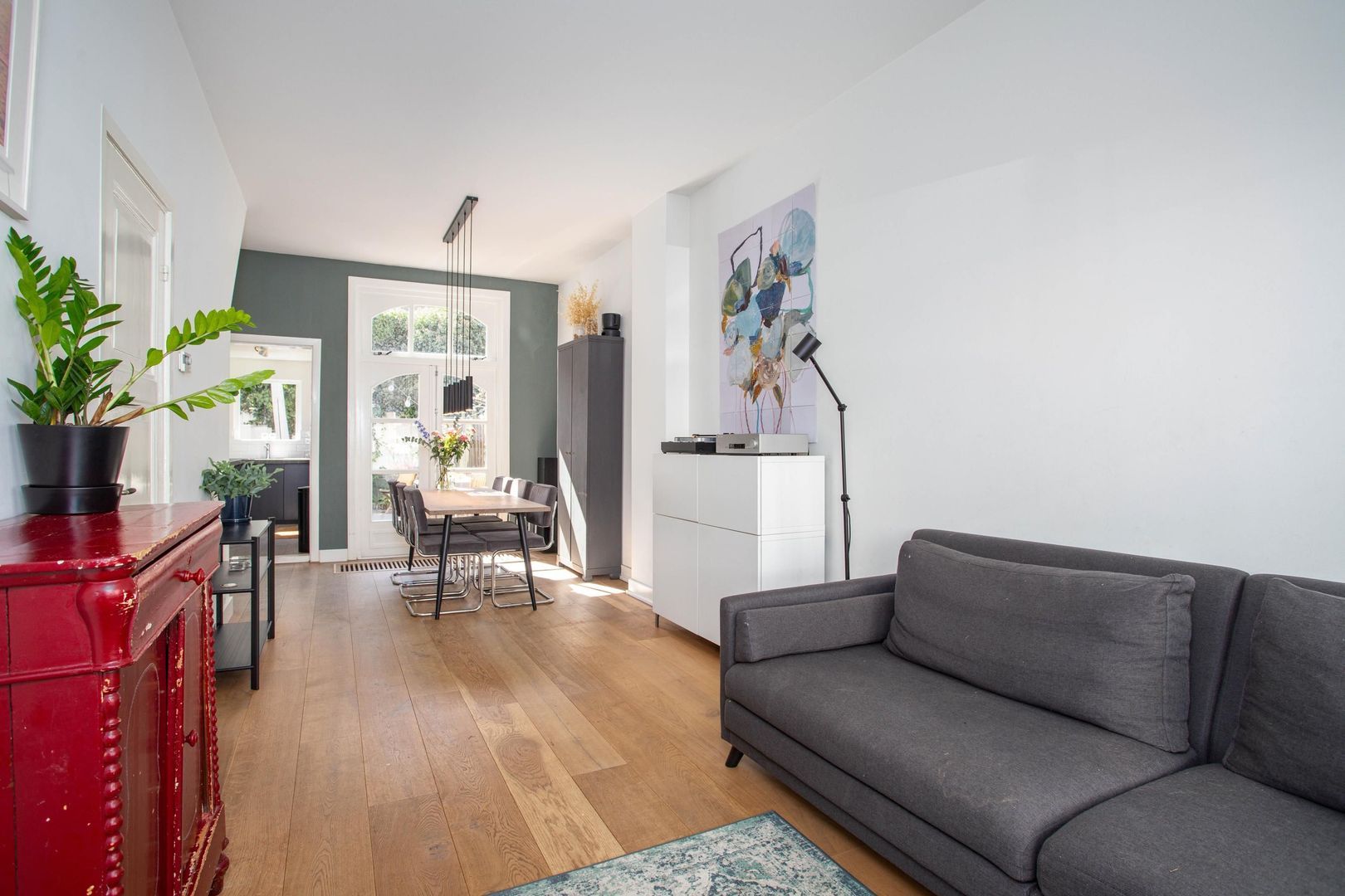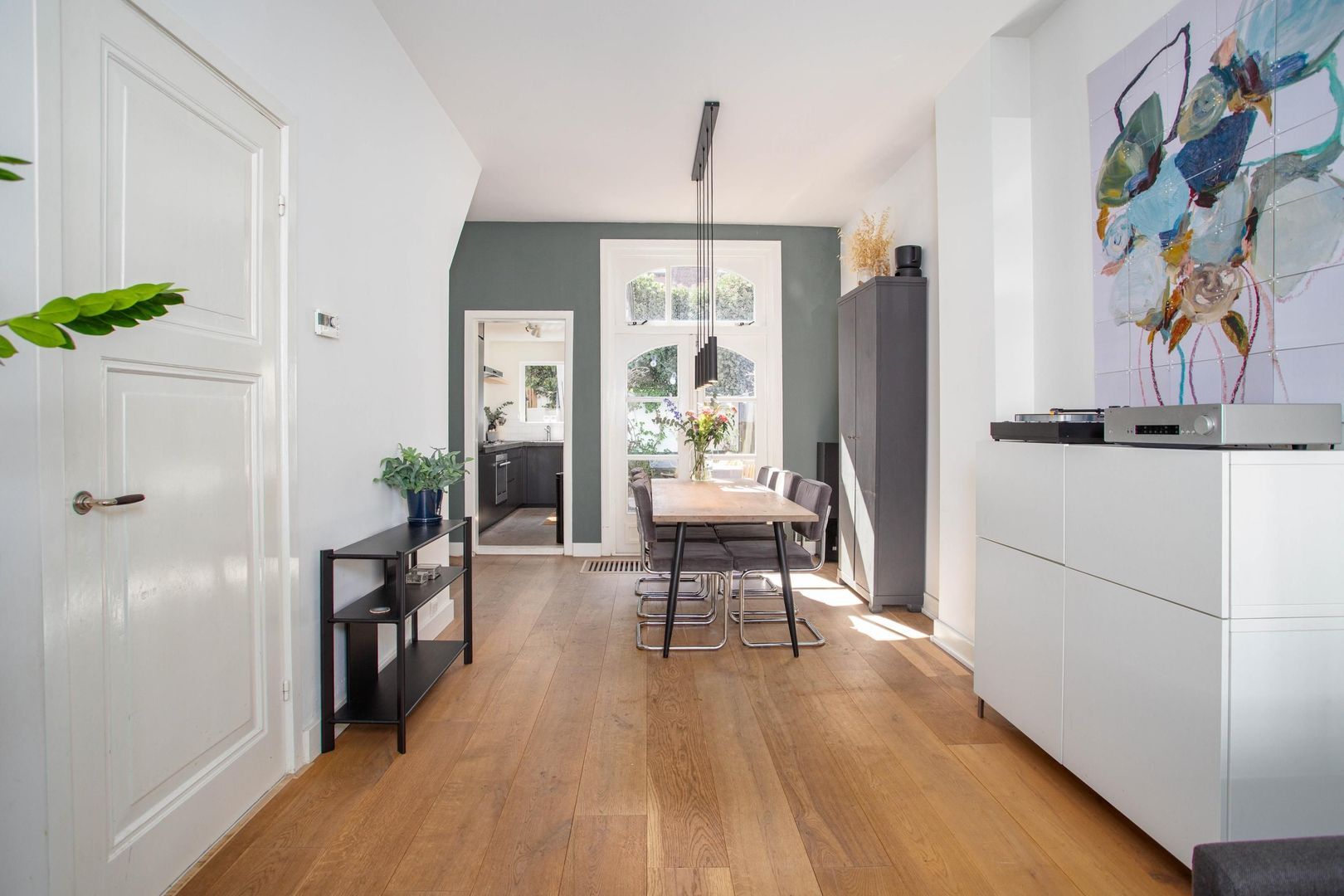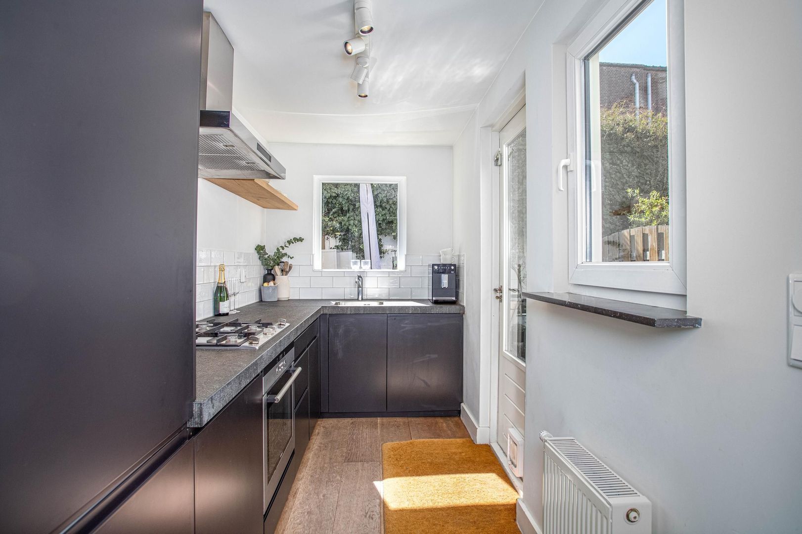 Je betreedt de woning met charmante voorgevel via de voordeur met aan de bovenzijde een karakteristiek glas-in-lood raam en komt in de hal. Via de hal heb je direct toegang tot de woonkamer. De woonkamer is momenteel ingedeeld met een zithoek aan de voorzijde en een eetkamer aan de achterzijde van de woning. In de woonkamer bevindt zich een extra deur die toegang geeft tot het toilet en de eerste verdieping. De eetkamer is een heerlijke plek om te dineren met zicht op de tuin. De halfopen keuken heeft zwarte kasten met zilveren details. De keuken beschikt over de volgende inbouwapparatuur: koelkast, vriezer, combi-oven, 4-pits gaskookplaat, afzuigkap en vaatwasser. De achtertuin is te bereiken via de openslaande deuren in de eetkamer en de deur in de keuken. De groene stadstuin heeft een goede ligging op het zuidwesten en biedt ruimschoots plaats voor een eettafel en zithoek.