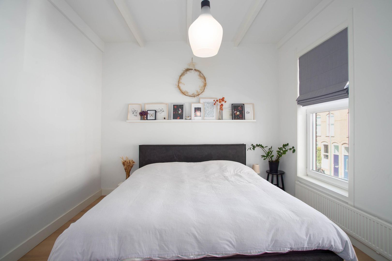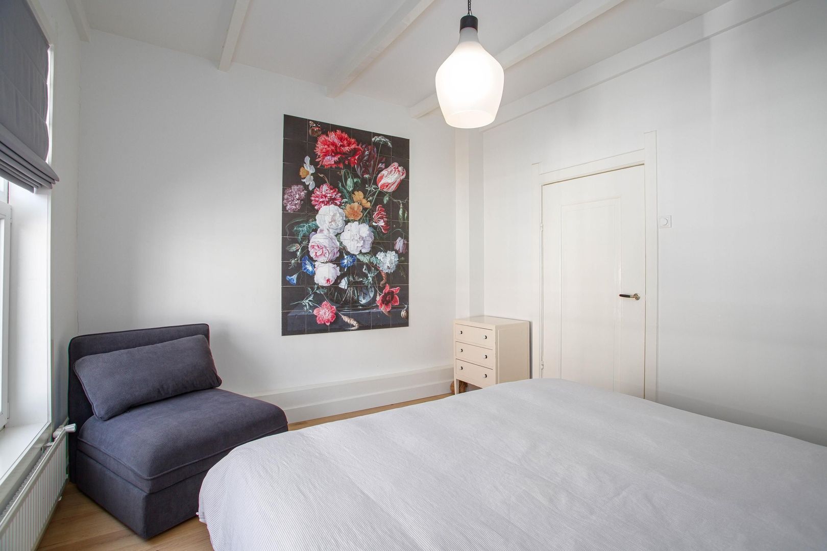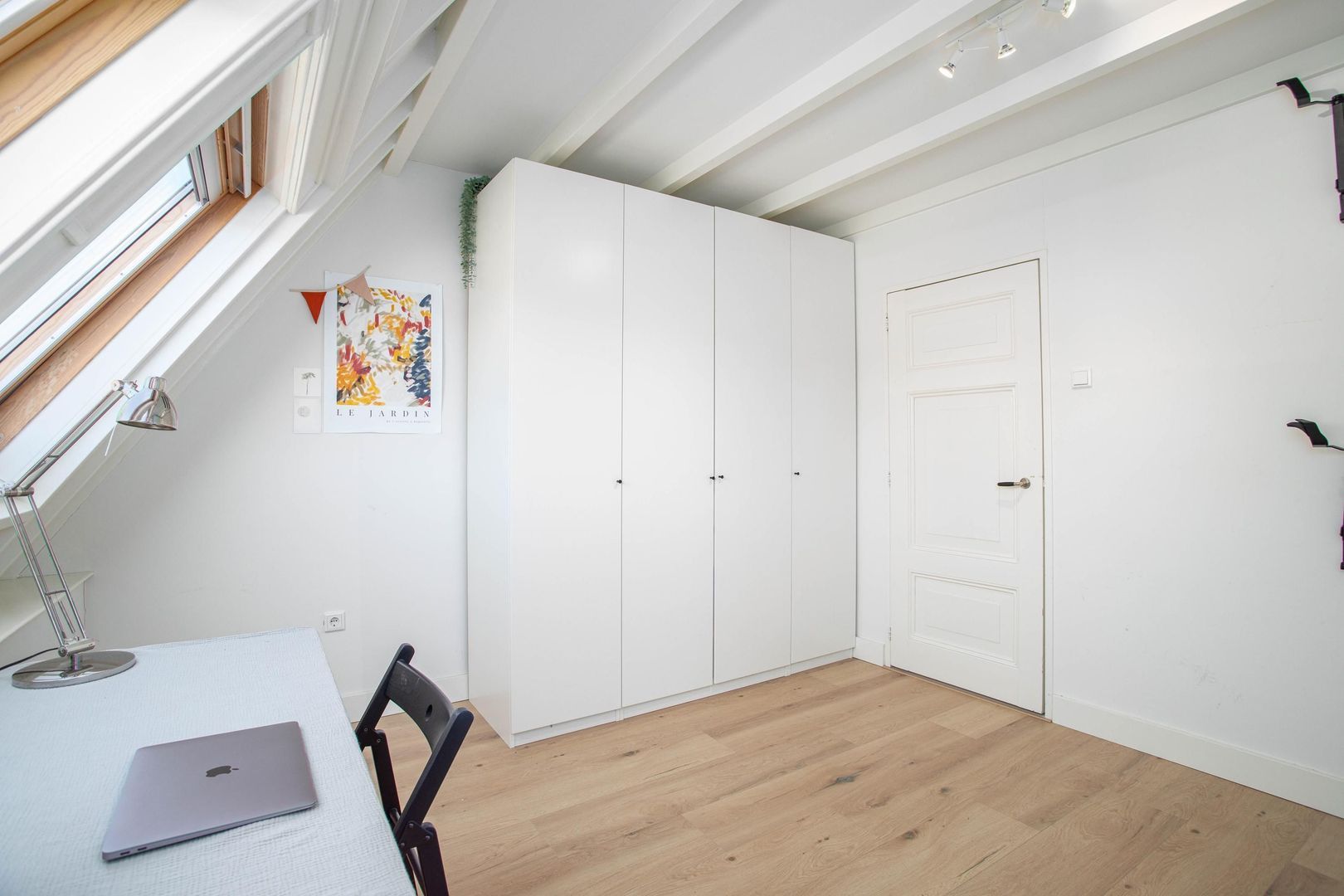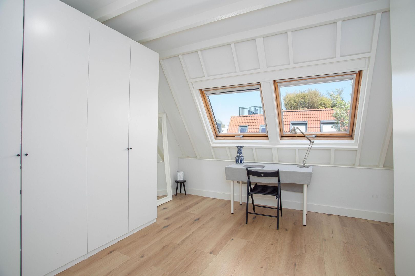 De overloop heeft veel lichtinval door het grote raam en geeft toegang tot twee slaapkamers, de badkamer en de trap naar boven. De grootste slaapkamer bevindt zich aan de voorzijde van de woning en biedt ruimte voor een groot bed en een kledingkast. De tweede slaapkamer bevindt zich aan de achterzijde van de woning en is perfect te gebruiken als werk- of kinderkamer. De badkamer is zeer netjes afgewerkt en beschikt over een ligbad, toilet, inloopdouche, dubbele wastafel met wastafelmeubel en een spiegelkast.