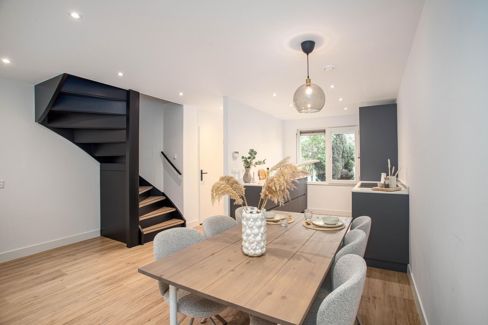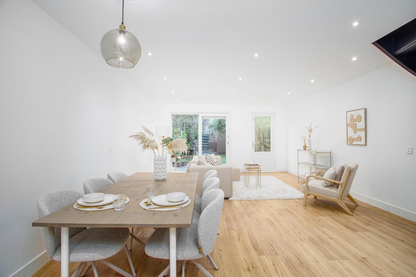 Centraal in de woonkamer is er plaats voor een riante eettafel welke in contact blijft met de keuken én de tuingerichte zitkamer. Vanuit hier is de achtertuin zowel via een loopdeur als via de schuifpui bereikbaar. Dankzij de ligging op het westen in combinatie met de mooie diepte is hier in de lente en zomermaanden vrijwel de hele dag een plekje in de zon te vinden. Uiteraard is er een achterom en eigen (stenen) berging aanwezig.