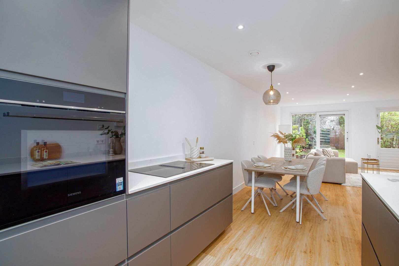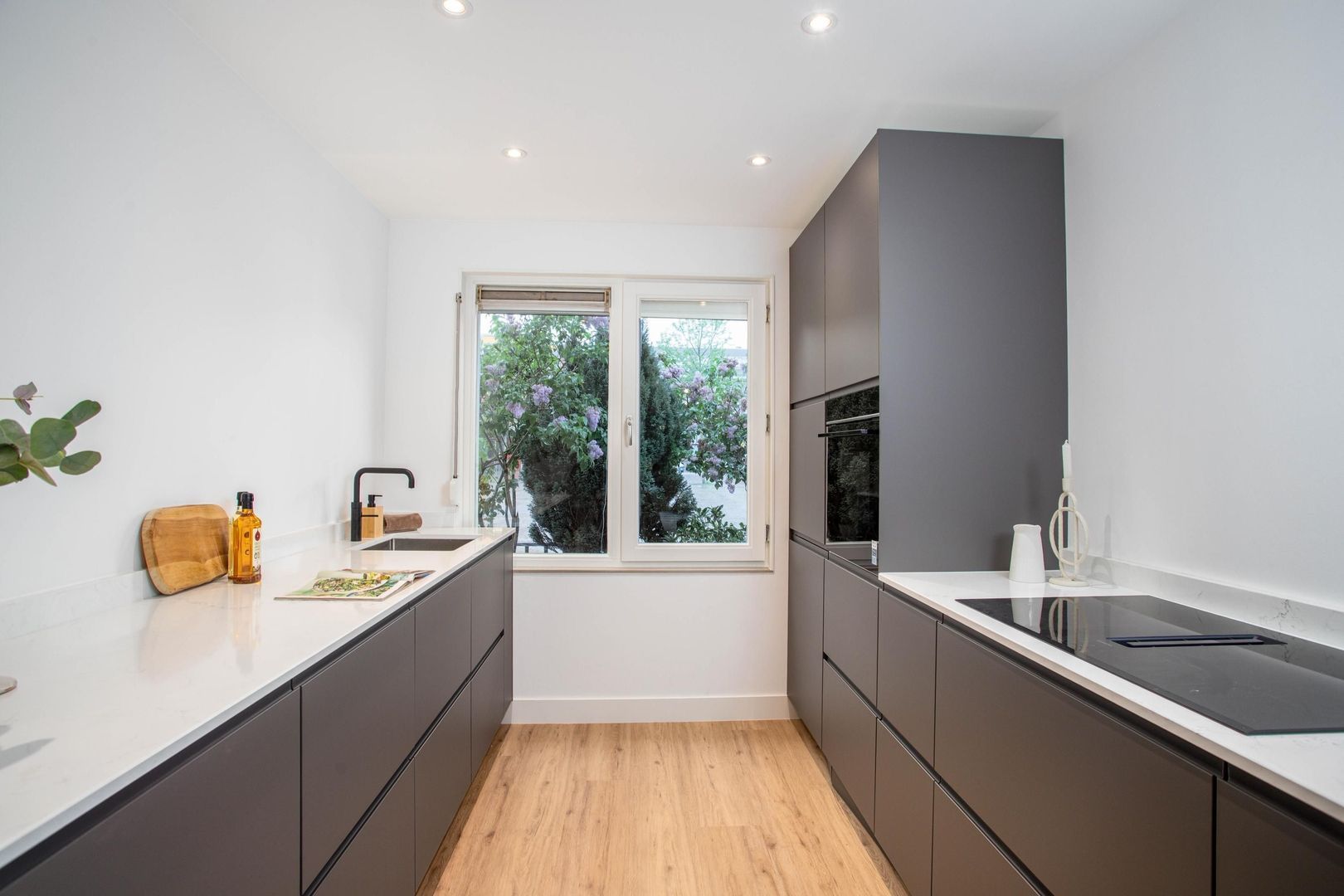 De bijzonder efficiënt ingerichte woonverdieping is hoogwaardig afgewerkt met een luxe vloer met vloerverwarming en fraai stucwerk op wanden en plafond. Ook hier mogen de inbouwspots (in delen te bedienen) niet ontbreken. Aan de voorzijde is de luxe keuken gesitueerd waarbij is gekozen voor hedendaagse maar smaakvolle fronts en marmerlook (keramisch) blad. Dankzij de slimme opstelling is er meer dan voldoende werkblad en is aan alle nodige inbouwapparatuur gedacht. Een koel-/vrieskast, vaatwasser, Quooker, combi-oven en inductiekookplaat met ingebouwd ventilatiesysteem maken onderdeel uit van het geheel.