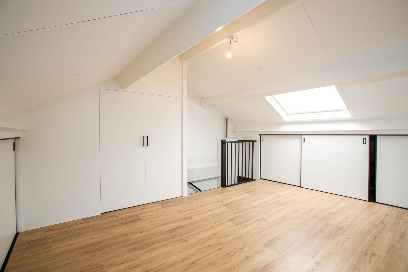 Via een vaste trap te bereiken ruime zolder-/slaapkamer met veel bergruimte en opstelplaats voor cv-ketel en wasmachineaansluiting. Door het grote dakraam valt er een fijne lichtinval in de kamer.
