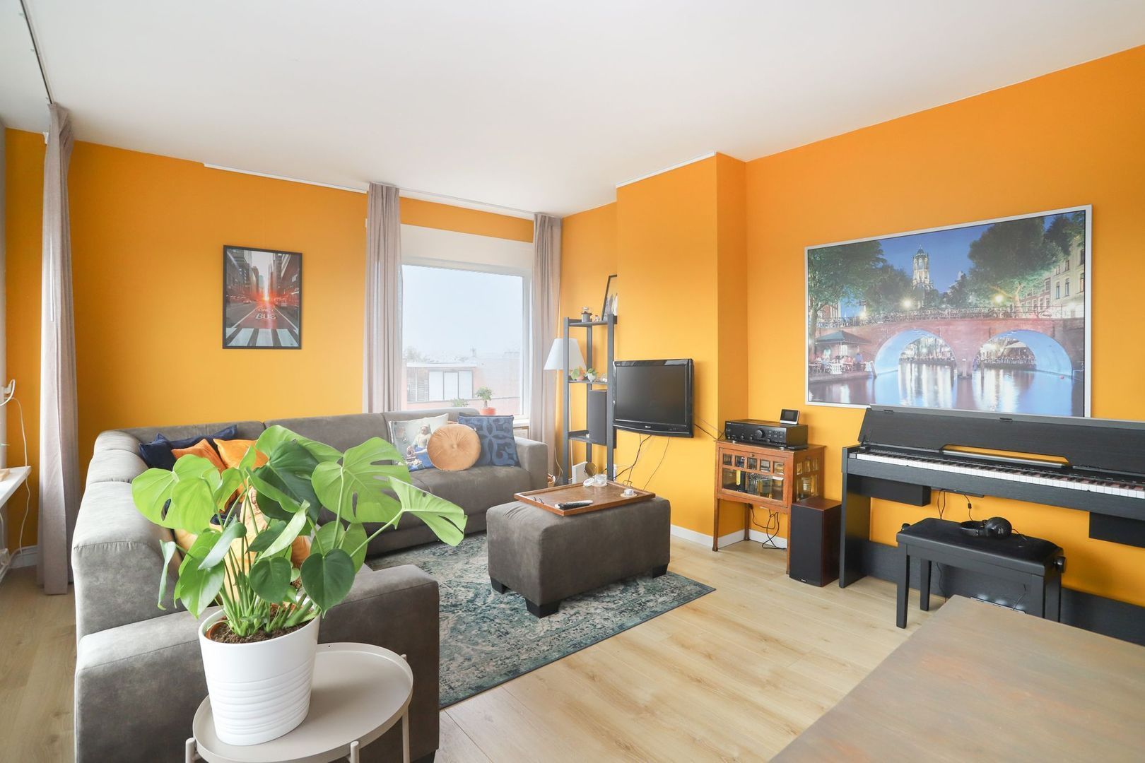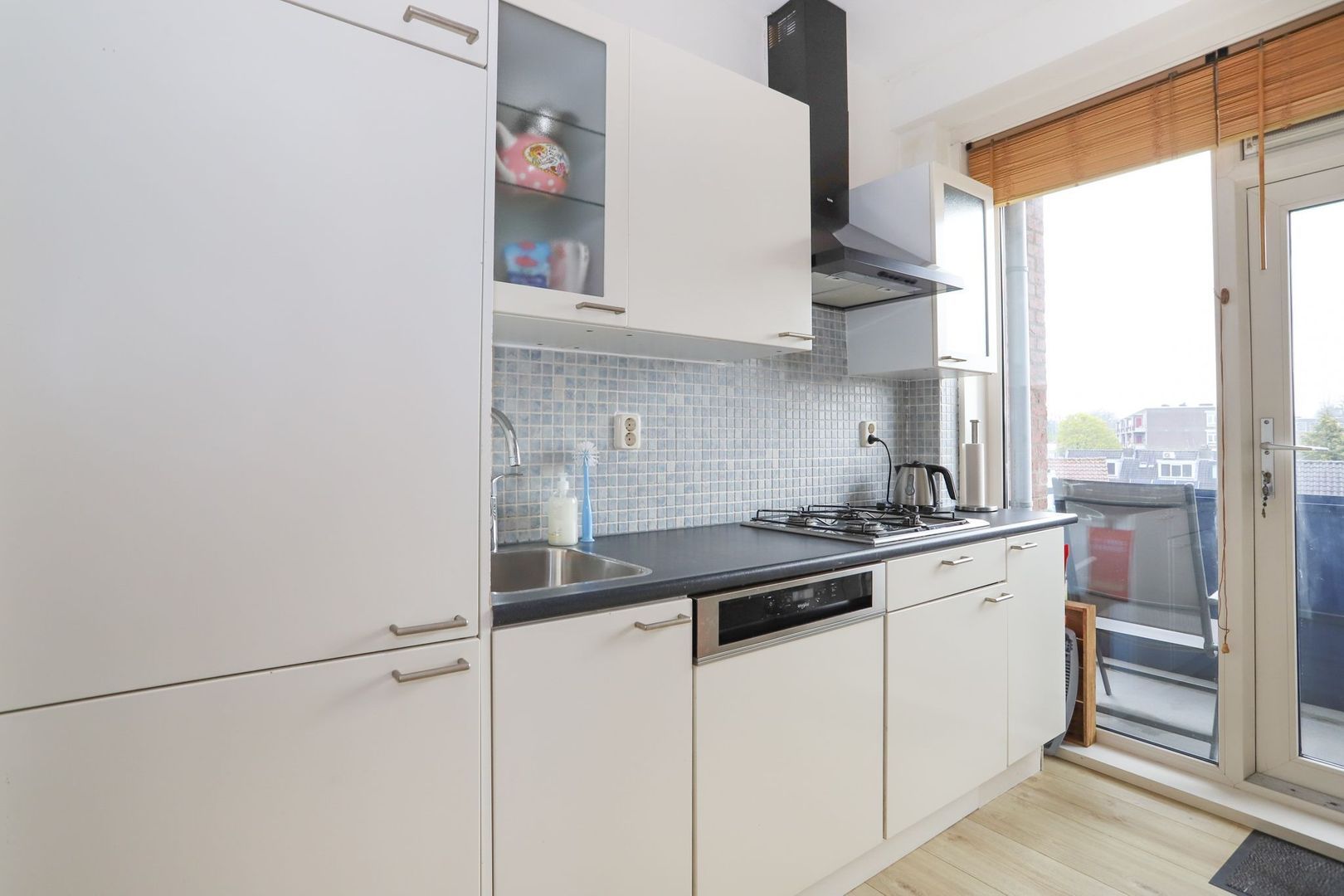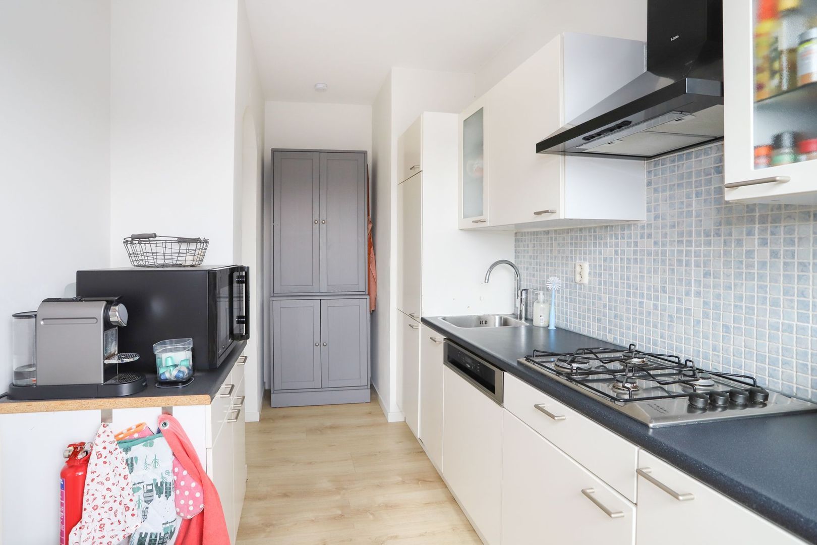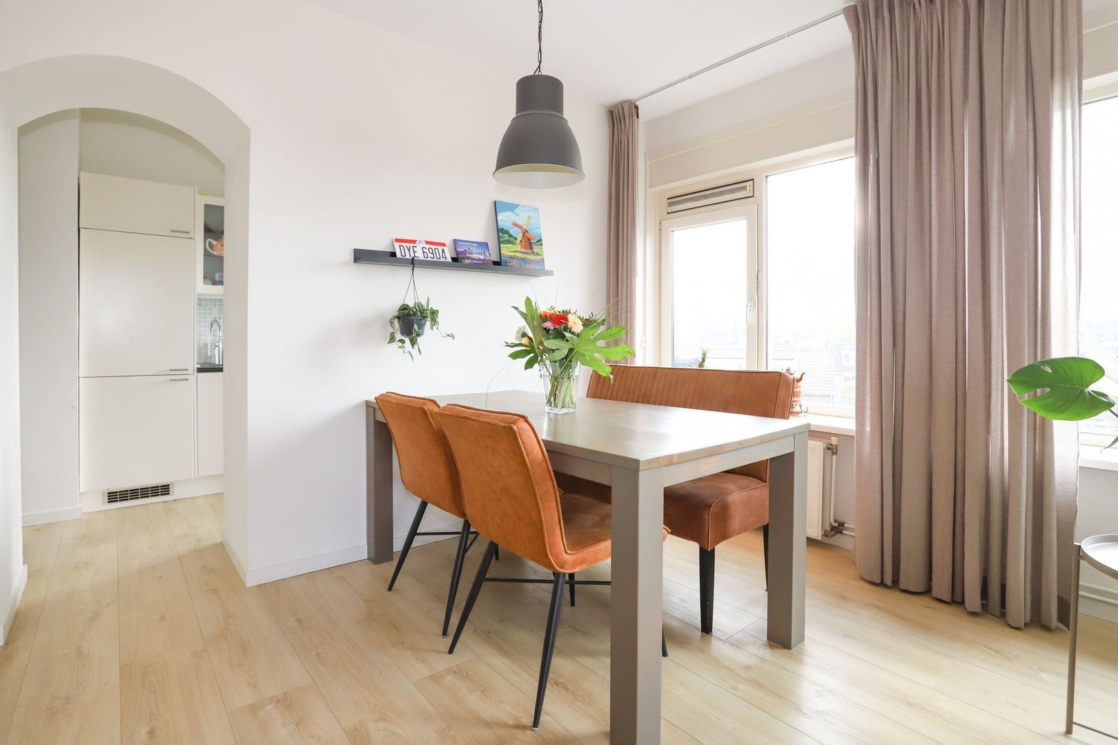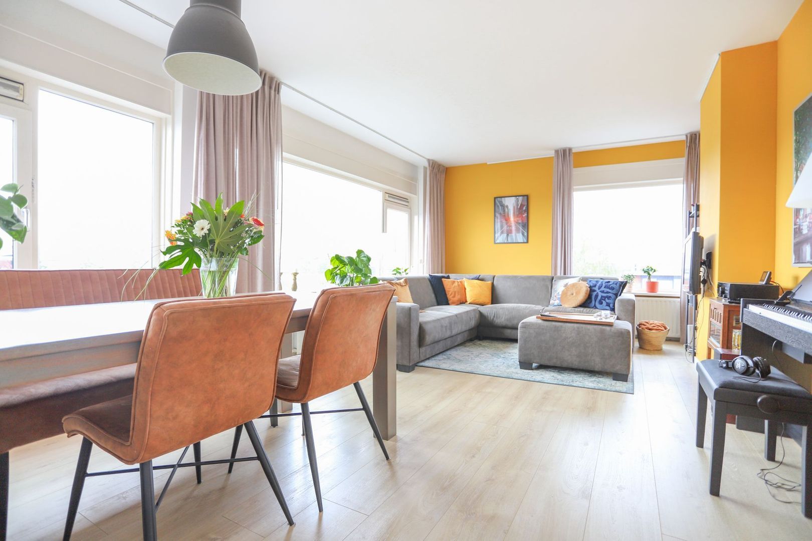 De royale woonkamer is heerlijk licht door de vele raampartijen. Hierdoor is het zowel in de winter als zomer fijn warm. D.m.v. van het zonnescherm kan de zon ook uit de woning blijven. De woonkamer is voorzien van strakke wanden en een nette laminaat vloer. Verder is de woonkamer praktisch in te delen met een fijne zithoek en een goede eethoek. De half open keuken is via de woonkamer toegankelijk en is voorzien van een net keukenblok met onder en bovenkasten die veel opbergruimte bieden. Verder is de keuken voorzien van een 4-pitsgastoestel, afzuigkap (2021), vaatwasser (2021) en een koel-vriescombinatie (2022). Het tweede balkon is hier toegankelijk.