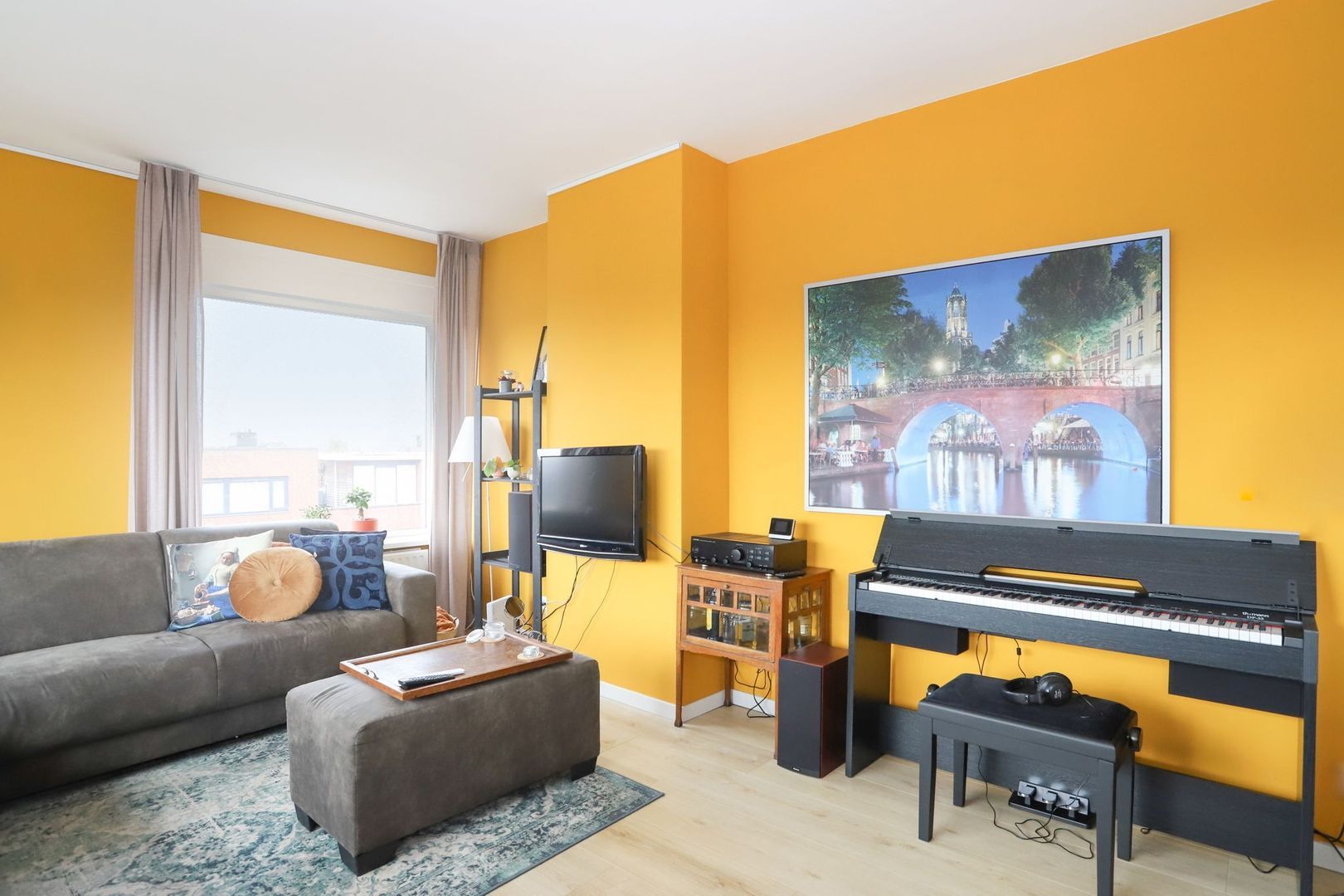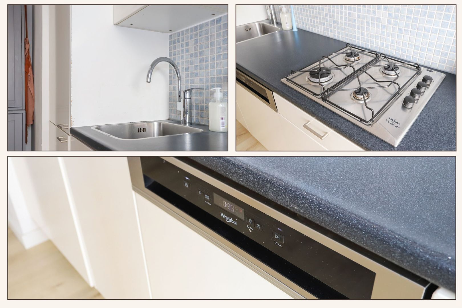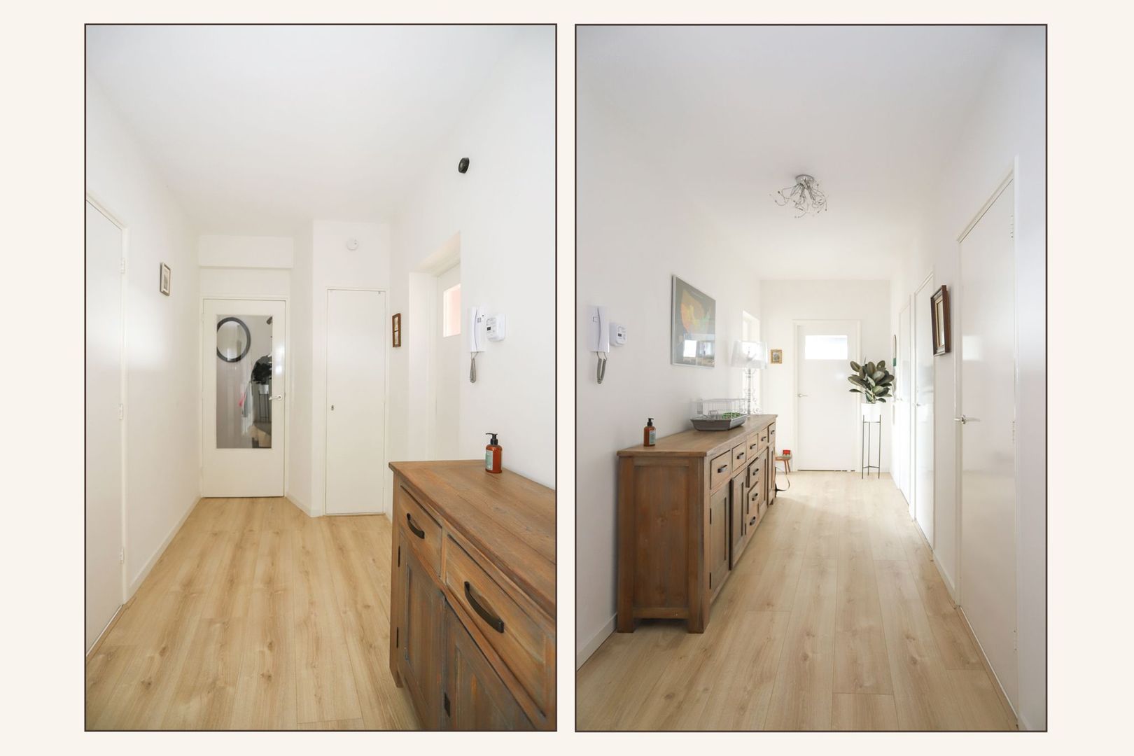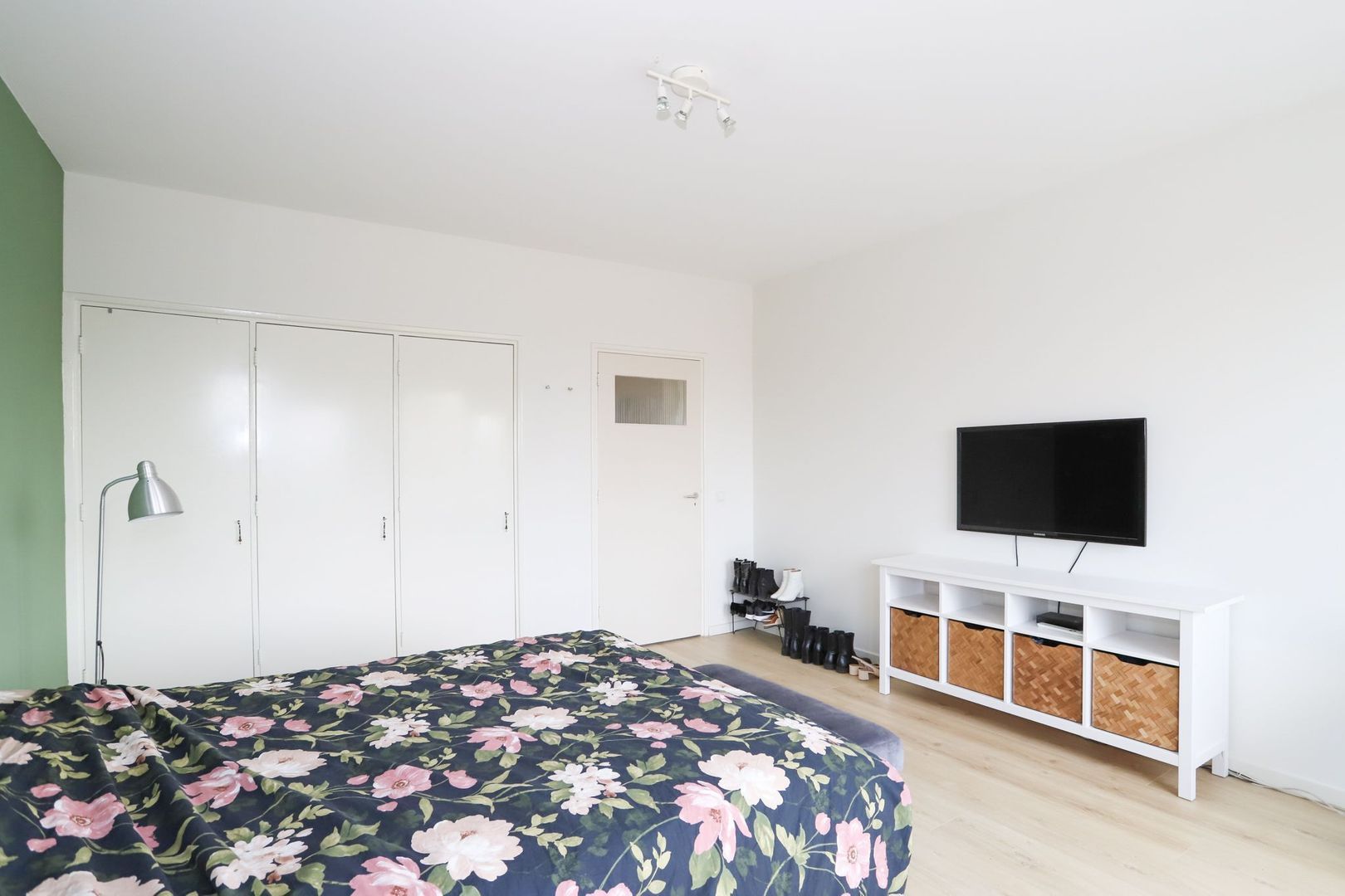 De royale woonkamer is heerlijk licht door de vele raampartijen. Hierdoor is het zowel in de winter als zomer fijn warm. D.m.v. van het zonnescherm kan de zon ook uit de woning blijven. De woonkamer is voorzien van strakke wanden en een nette laminaat vloer. Verder is de woonkamer praktisch in te delen met een fijne zithoek en een goede eethoek. De half open keuken is via de woonkamer toegankelijk en is voorzien van een net keukenblok met onder en bovenkasten die veel opbergruimte bieden. Verder is de keuken voorzien van een 4-pitsgastoestel, afzuigkap (2021), vaatwasser (2021) en een koel-vriescombinatie (2022). Het tweede balkon is hier toegankelijk.