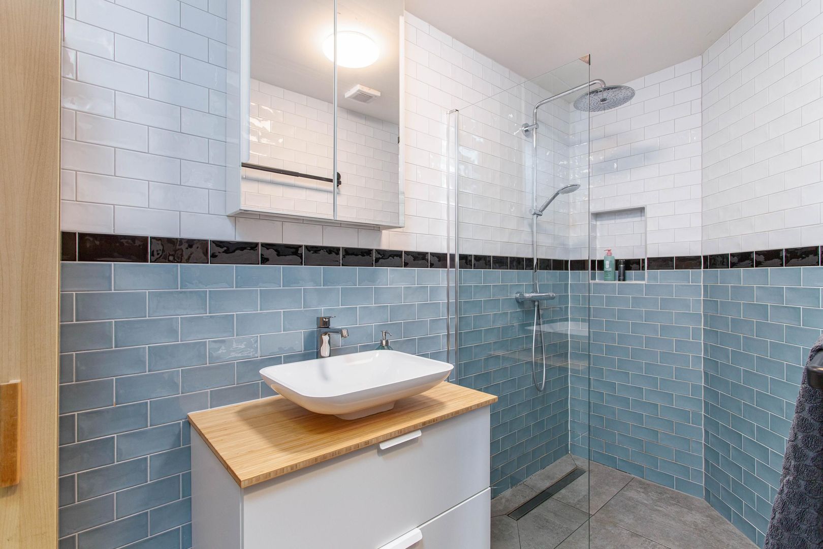 De moderne badkamer is in 2022 volledig gerenoveerd en is voorzien van een ruime inloopdouche en een stijlvol wastafelmeubel met opbergruimte. Het separate toilet is eveneens in 2022 vernieuwd en is in dezelfde stijl uitgevoerd.