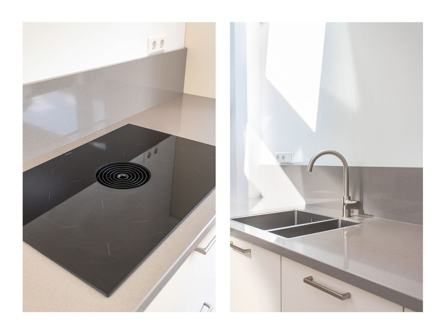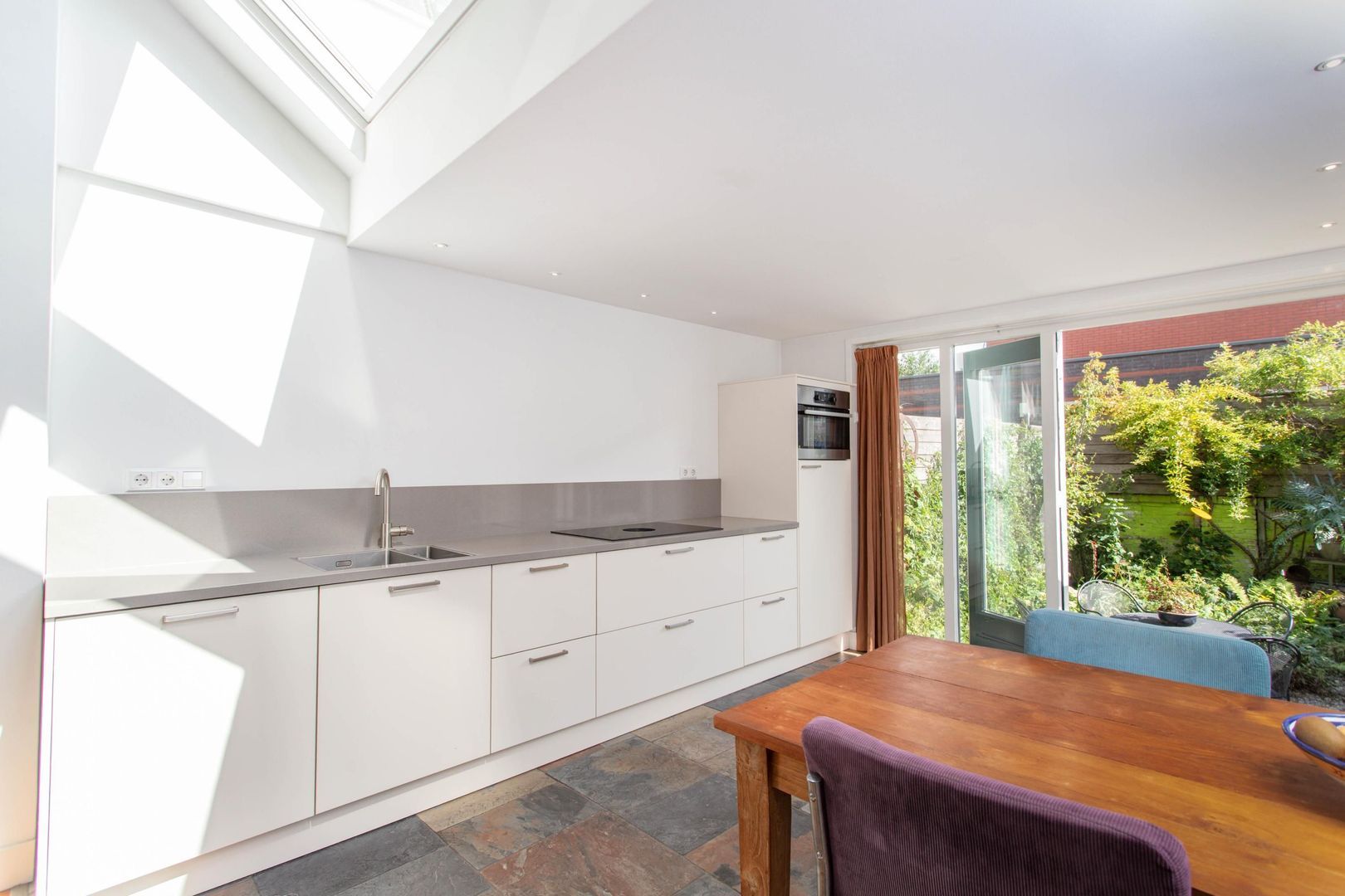 De moderne open keuken heeft een frisse, lichte uitstraling met witte kasten en een stijlvol grijs werkblad. Uiteraard is de keuken volledig uitgerust met inbouwapparatuur: een vaatwasser, inductiekookplaat met geïntegreerde afzuiging, combi-oven en koelkast. Naast de keuken is voldoende ruimte voor een royale eettafel, perfect om samen uitgebreid te tafelen. Via de openslaande deuren loop je direct de groene achtertuin in. Met de zonnige ligging op het zuidoosten is dit een heerlijke plek om te ontspannen en te genieten van de buitenlucht.