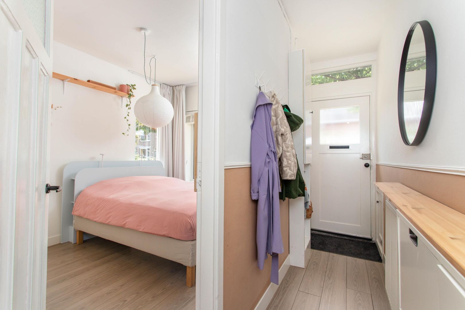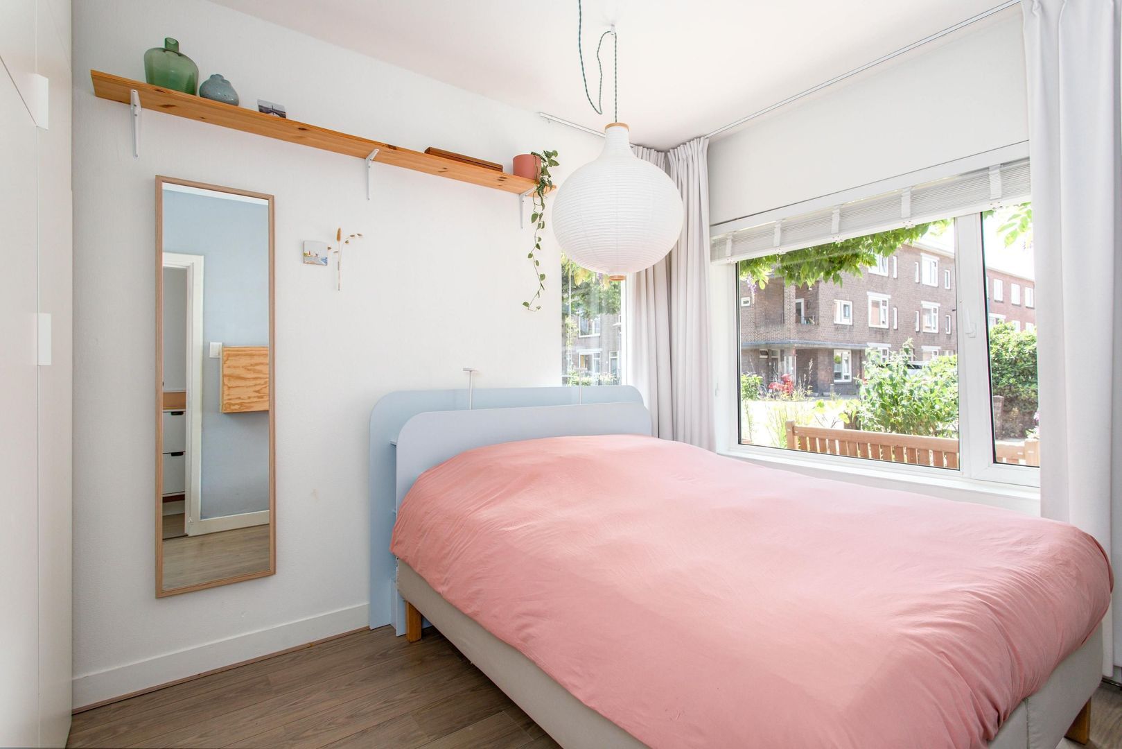 Aan de voorkant van de woning bevindt zich een multifunctionele slaapkamer, ideaal als logeerkamer, kinderkamer of thuiskantoor. Links voorin ligt de ruime hoofdslaapkamer, waar met gemak een tweepersoonsbed en linnenkast geplaatst kunnen worden.