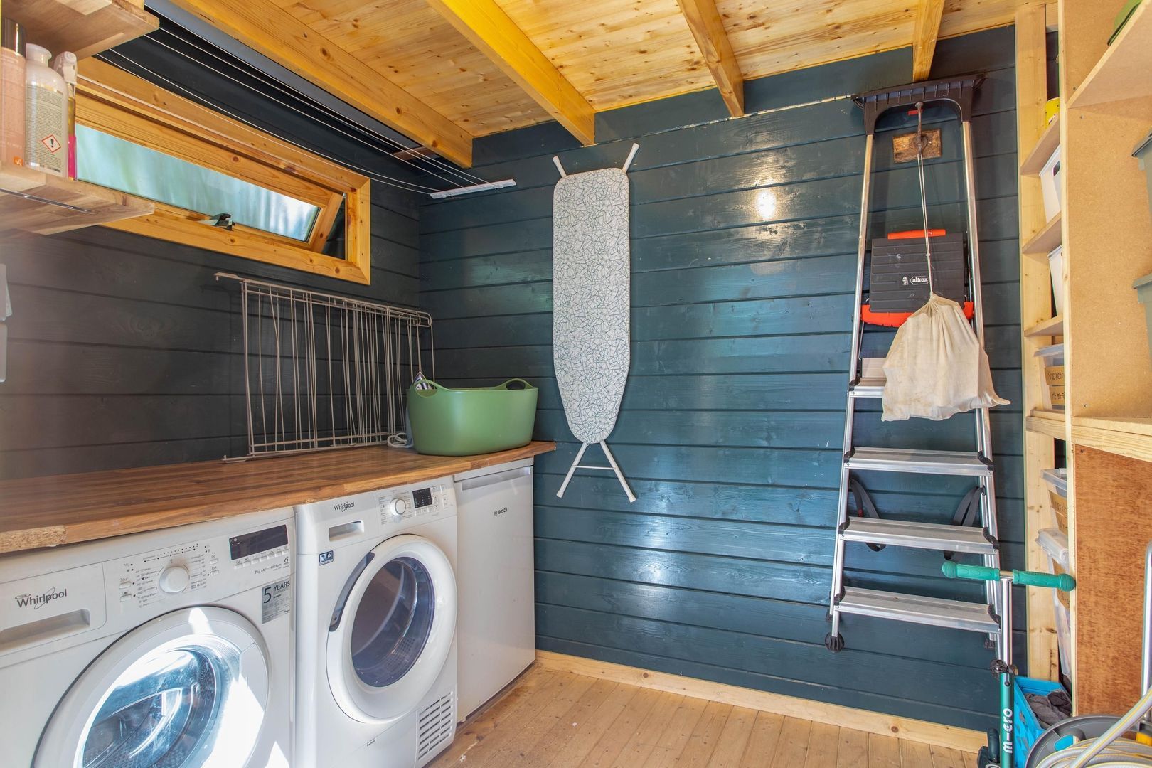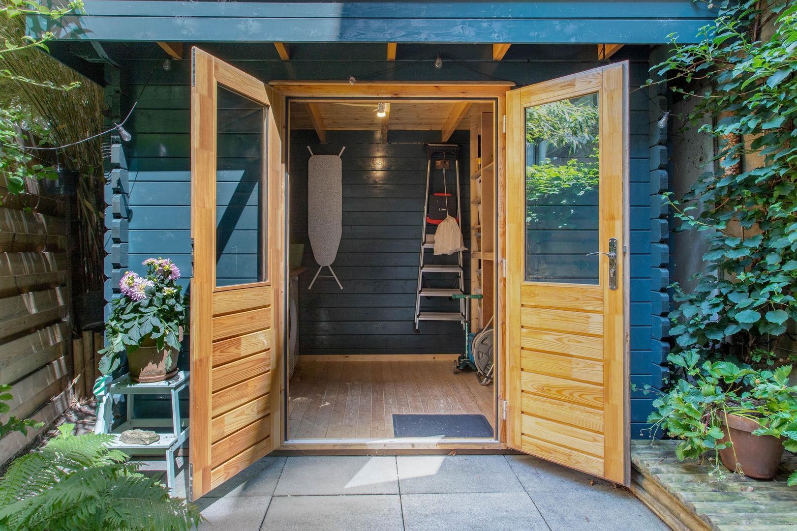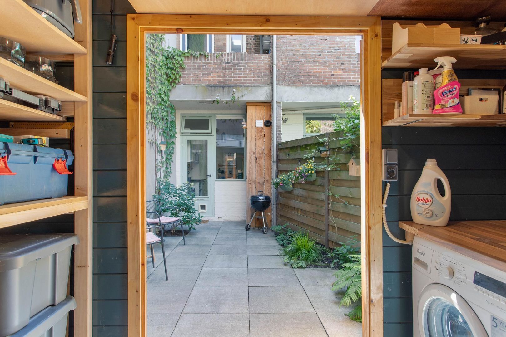 Grenzend aan de keuken ligt de fraai aangelegde achtertuin, die een verlengstuk vormt van het woongedeelte. De tuin is sfeervol ingericht met een combinatie van groen en bestrating, waardoor het een ideale plek is om te ontspannen of buiten te dineren. Achterin de tuin staat een praktische houten berging, perfect voor het opbergen van fietsen, tuingereedschap of andere spullen. Tevens is de witgoed aansluiting gevestigd in het tuinhuis.
