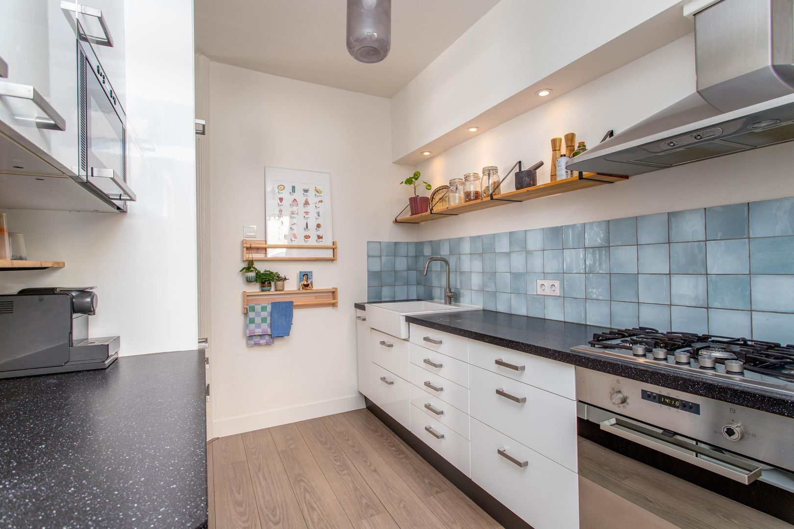 De moderne badkamer, bereikbaar via de hal, is in 2021 volledig vernieuwd en voorzien van een ruime douche een toilet en een nette wastafelmeubel. Deze keuken is in 2020 gemoderniseerd. En uitgerust met diverse nieuwe inbouwapparatuur, waaronder een extra groep voor het voorbereiden op een inductiekookplaat. De keuken is voorzien van diverse inbouwapparatuur zoals een gasfornuis, vaatwasser en een koel/vriescombinatie.