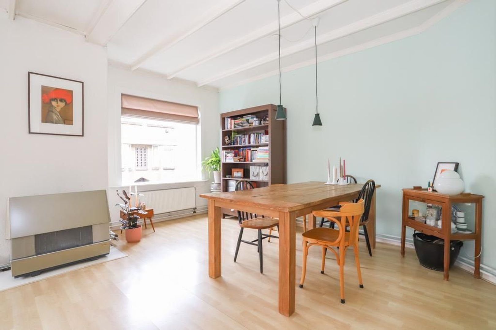 Eerste verdieping: De royale hal met meterkast en toilet geeft toegang tot alle vertrekken. De riante en speelse woon-eetkamer is voorzien van een nette laminaat vloer, verschillende raampartijen waardoor de ruimte heerlijk licht is, een nette wand afwerking en een centrale moederhaard waardoor de woning goed te verwarmen is. Door de riante en speelse ruimte is hier voldoende plek voor een sfeervolle zithoek en een gezellig eetgedeelte. Er is sprake van vrij uitzicht, je kijkt redelijk vrij weg de straat in richting een pleintje verderop in de straat.