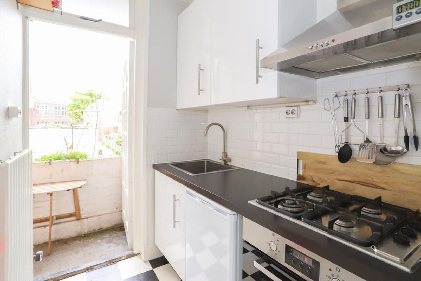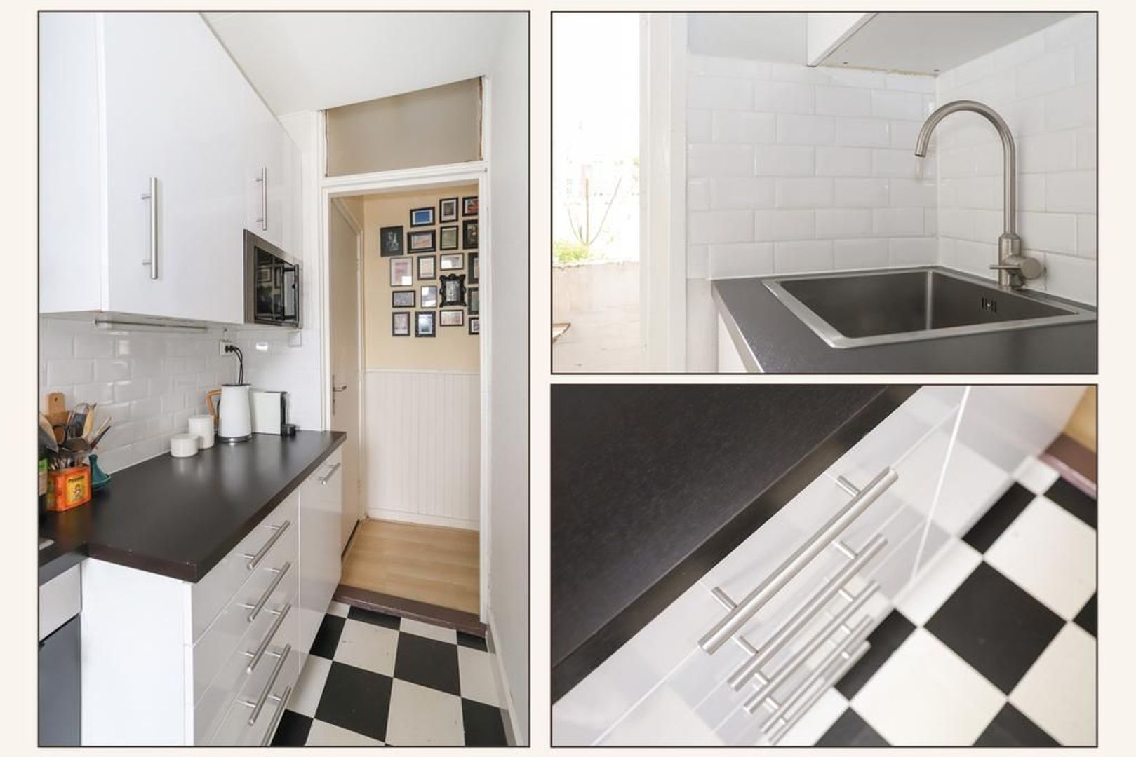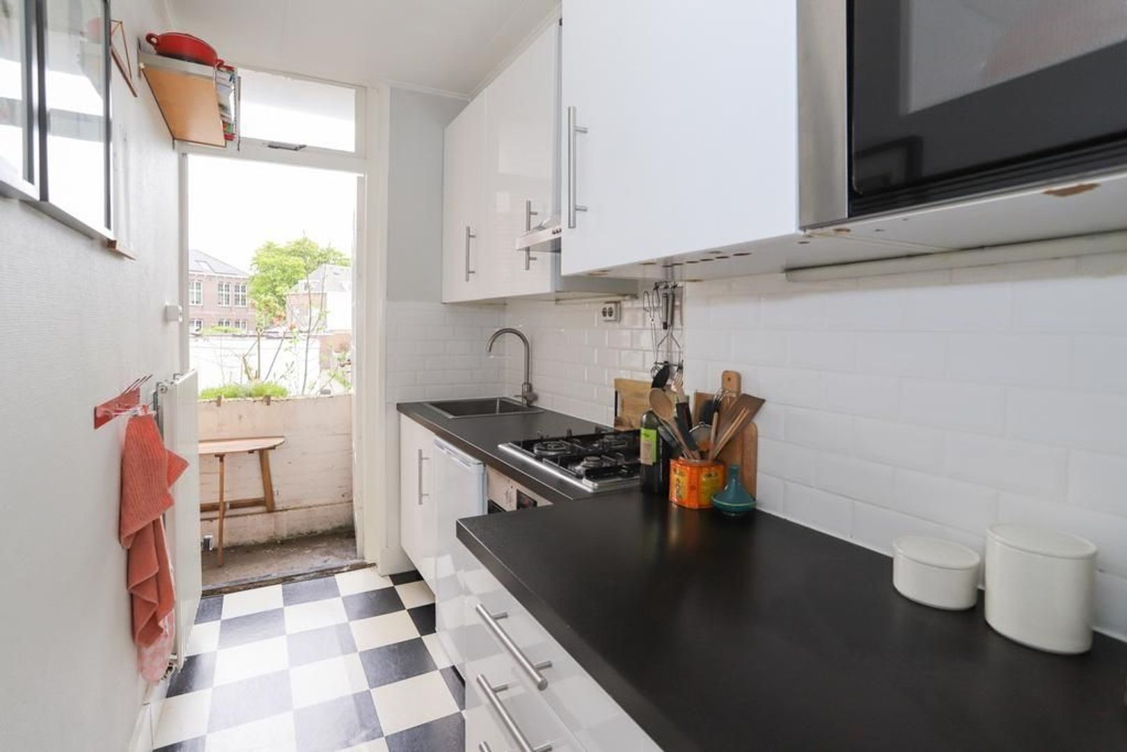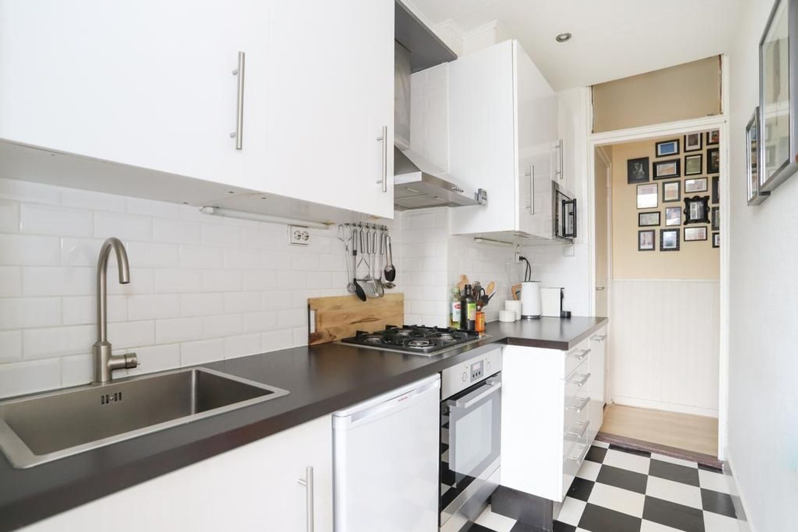 Ook via de keuken is het balkon toegankelijk. De keuken is uitgevoerd met een wit keukenblok met zowel boven als onderkasten en er zijn plafondspots aanwezig. Verder is er inbouwapparatuur aanwezig zoals een 4-pits gastoestel, afzuigkap, koelkast, magnetron en een vaatwasser.