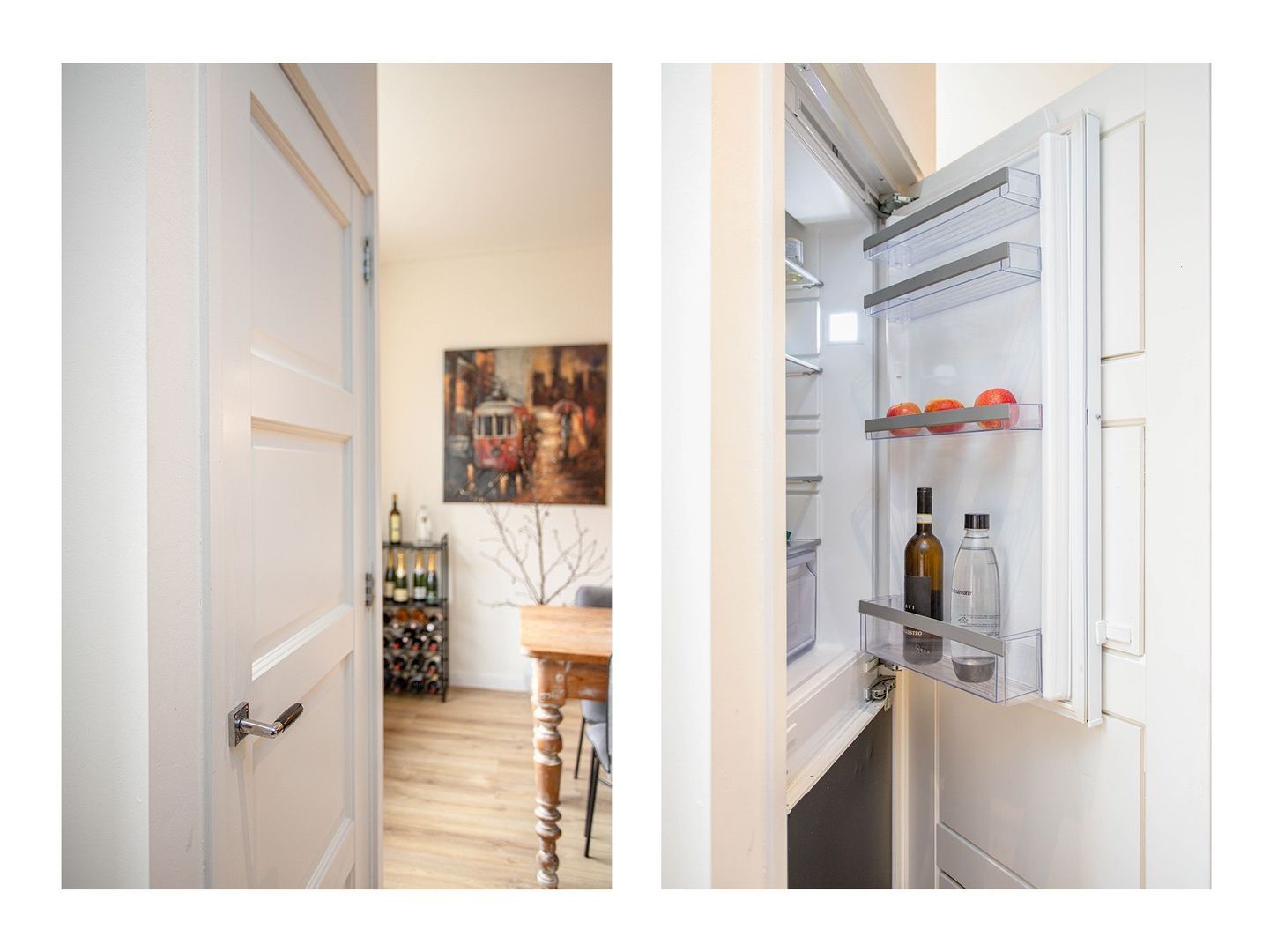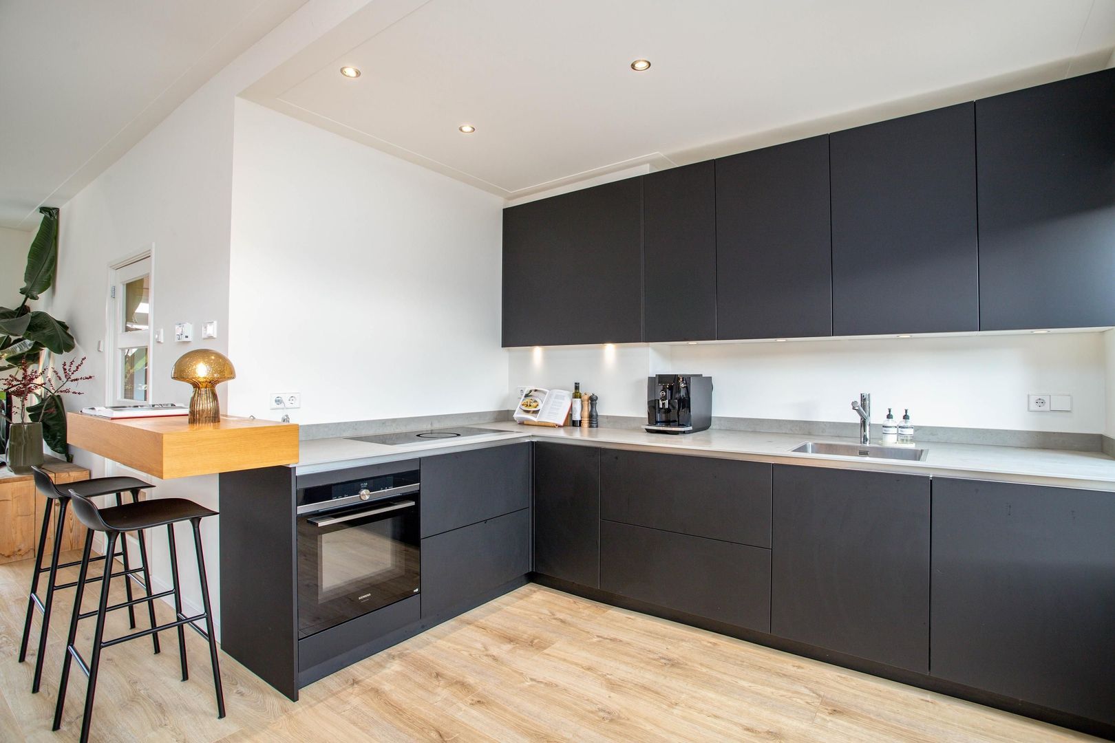 Via de overloop heb je toegang tot de woonkamer, de garderobe en het toilet. De woonkamer, gelegen aan de voorzijde van de woning, heeft een prettige lichtinval en is ruim van opzet. De eetkamer beschikt over een karakteristieke schouw, terwijl de open keuken een sfeervolle bar heeft waar je aan kunt zitten. Verder is de keuken uitgerust met zwarte kasten en een lichtgrijs werkblad. Daarnaast is de keuken voorzien van de volgende inbouwapparatuur: een combi-oven, een inductiekookplaat met inwendige afzuiging, een vaatwasser, een koelkast en een vriezer. De koelkast en vriezer zijn ondergebracht in een extra kast achter de deur in de keuken. Naast de keuken bevindt zich de deur naar het balkon, waar je 's ochtends heerlijk van de zon kunt genieten.
