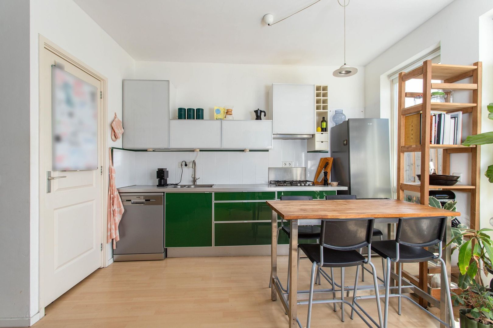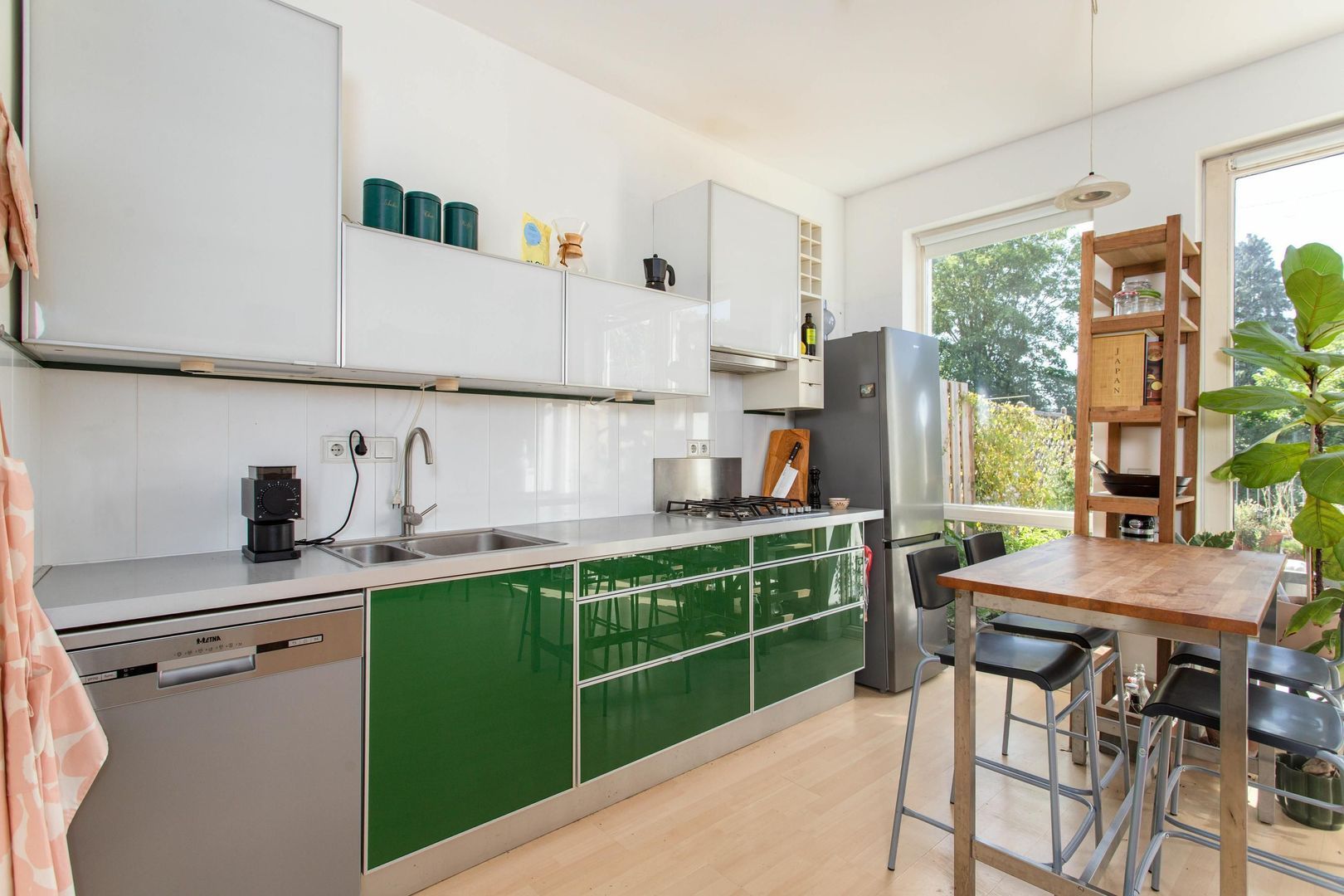 De woonkamer is voorzien van grote raampartijen, wat zorgt voor een aangename, lichte sfeer in huis. Aansluitend bevindt zich de open keuken, die is uitgerust met diverse inbouwapparatuur, waaronder een vierpits gasfornuis en een afzuigkap. Verder is er een ruime kast aanwezig met aansluiting voor een wasmachine.