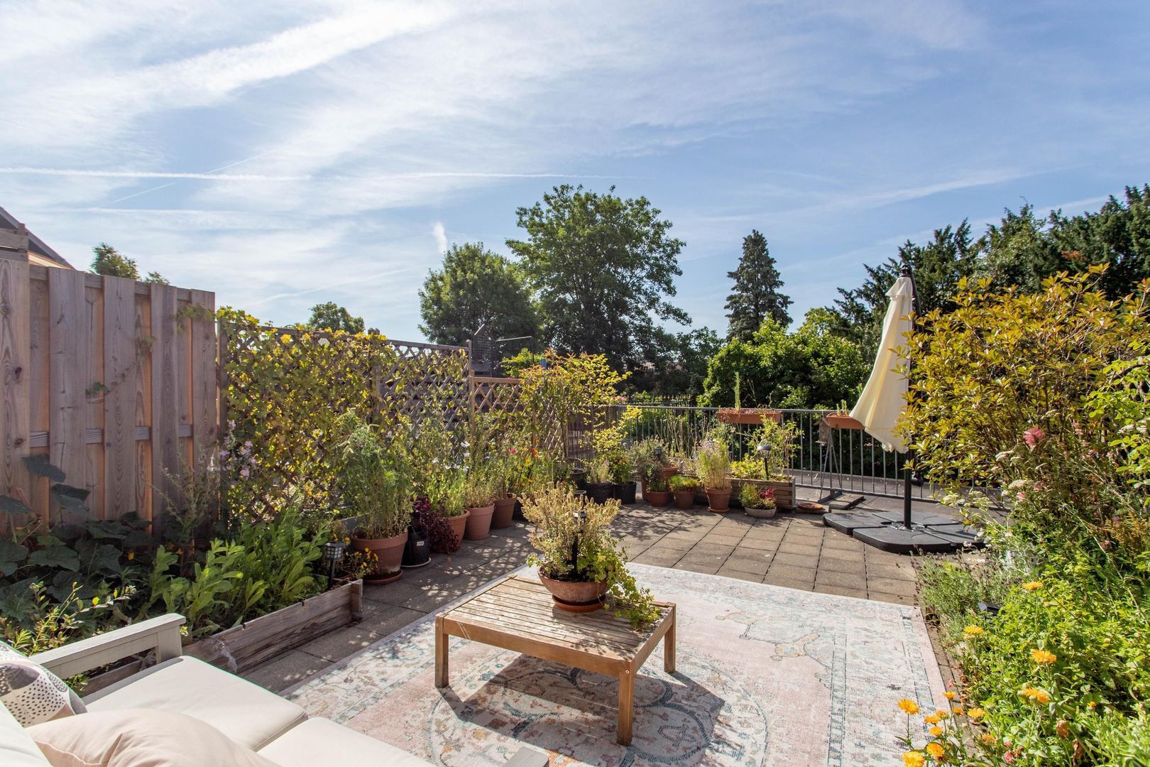 Via openslaande deuren is het riante dakterras toegankelijk. Dit terras is gunstig gelegen op het zuiden en biedt een heerlijke plek om op zonnige dagen van de buitenlucht te genieten – midden in de stad.