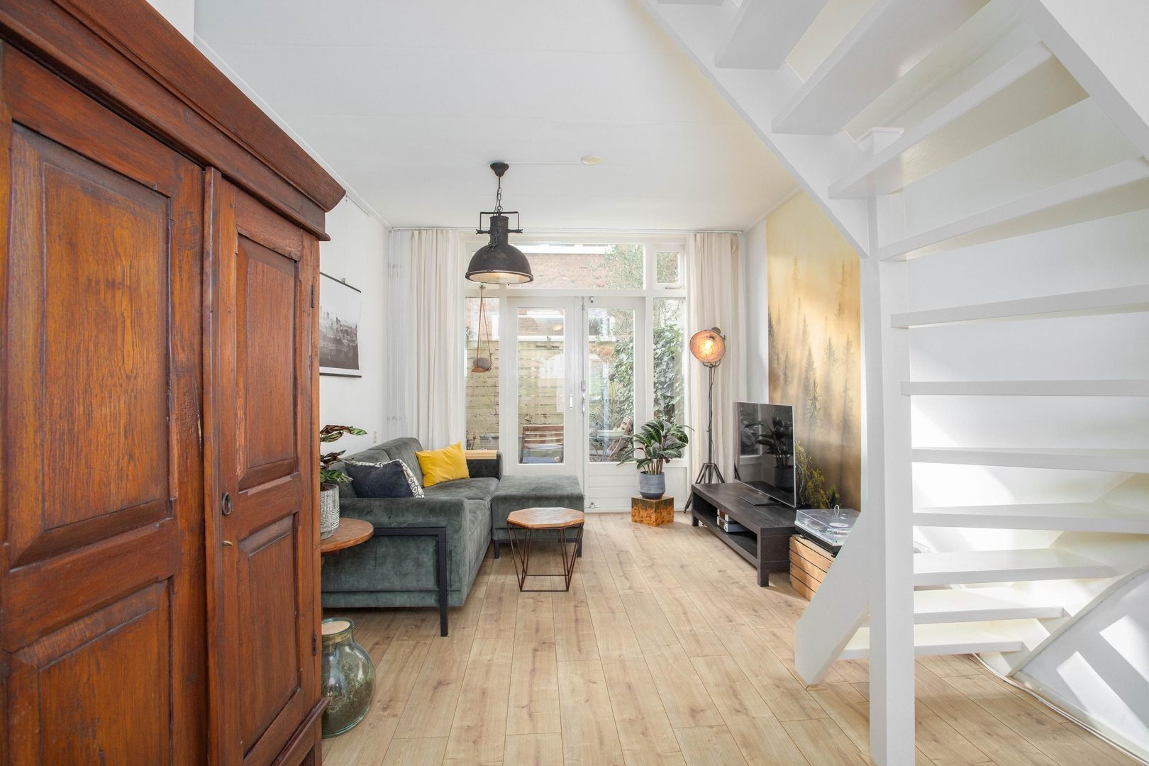 Loop je verder, dan sta je in de woonkamer. Hier vind je de open trap en via de openslaande deuren loop je zo de achtertuin in. Een heerlijke plek om te relaxen, en met een handige berging voor extra opslag.