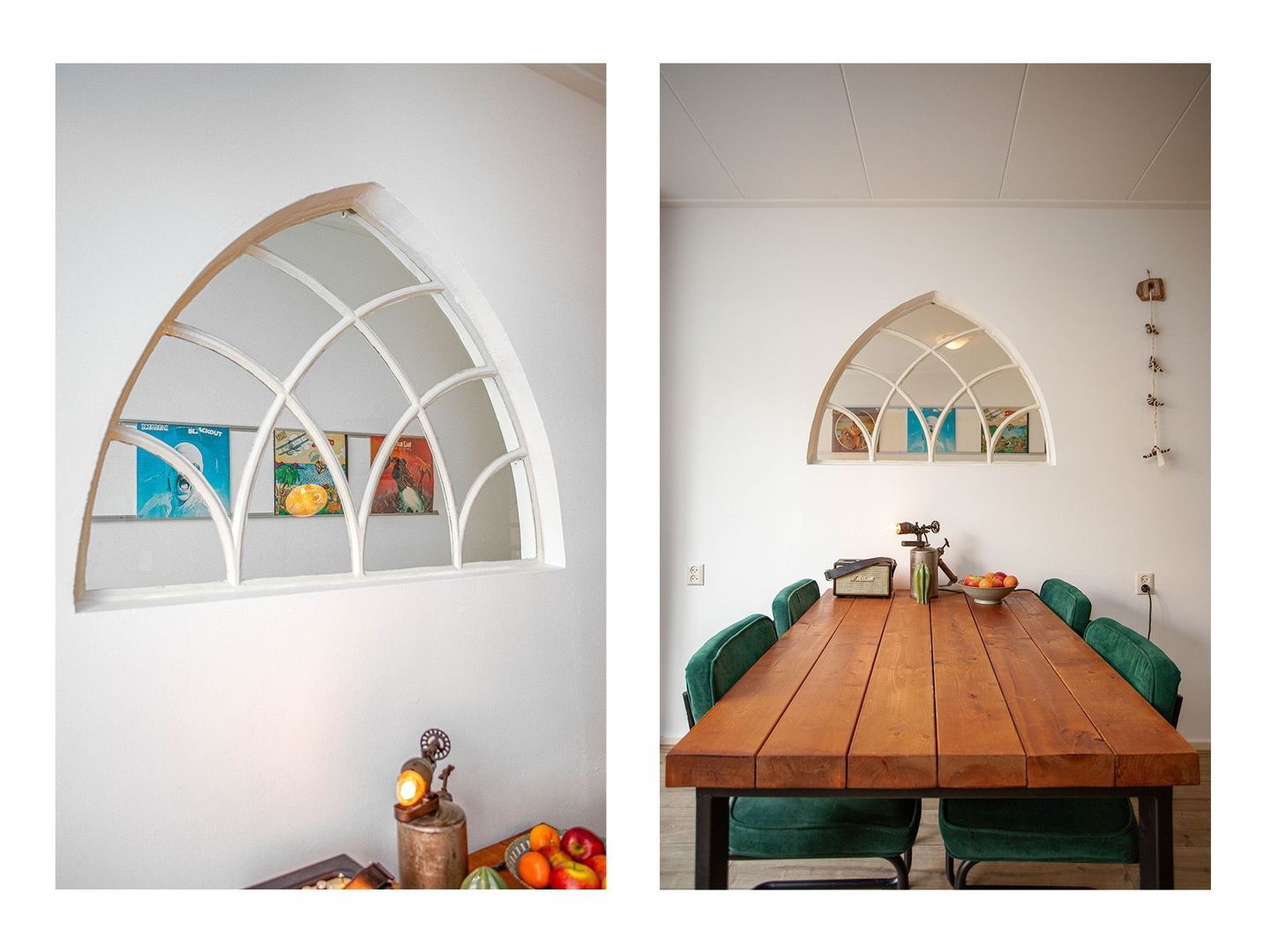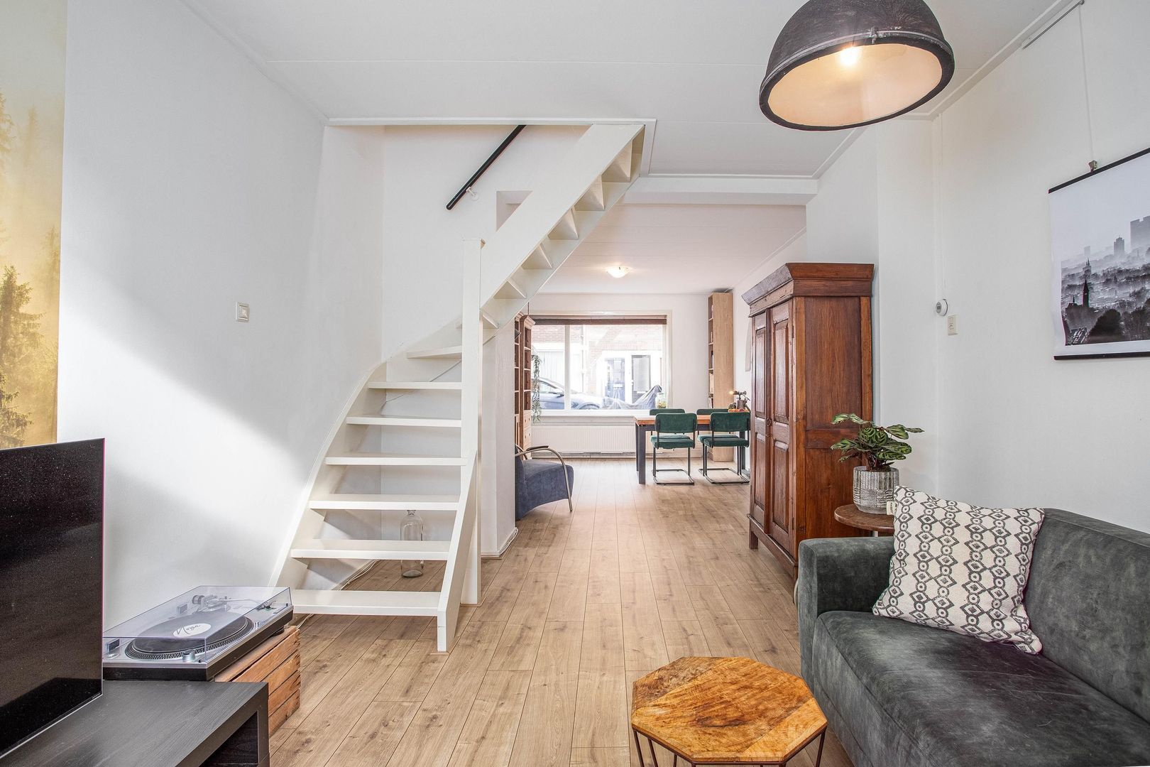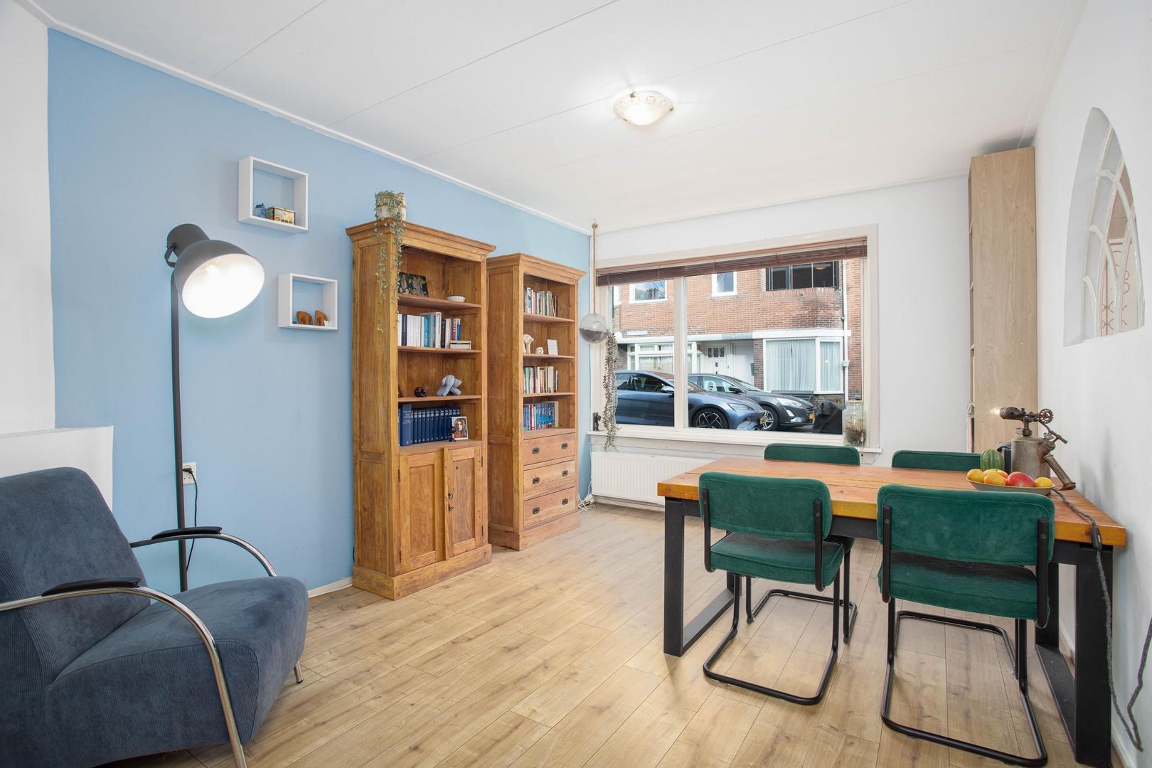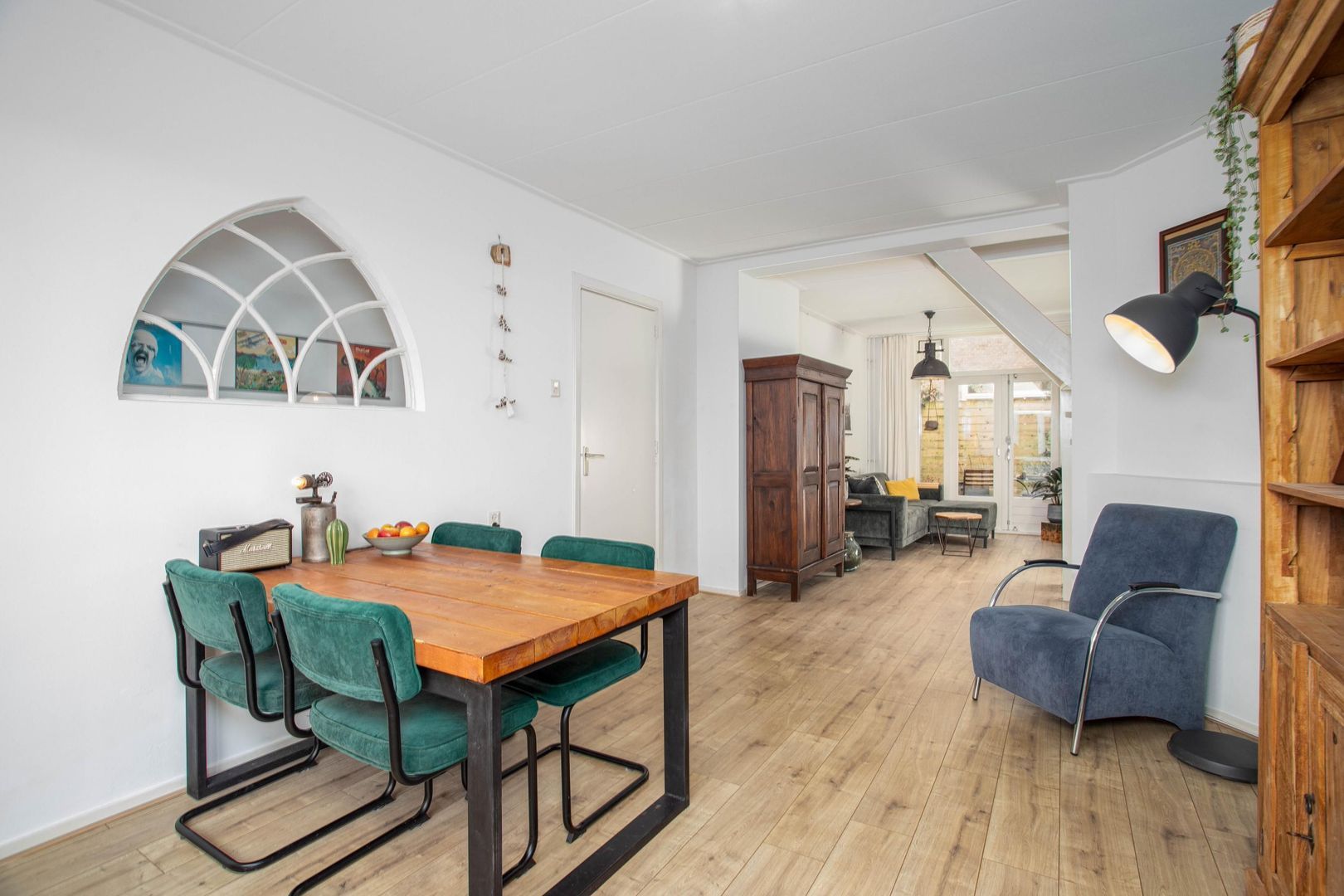 Je komt binnen in de hal, waar je meteen toegang hebt tot het toilet, een ruime trapkast, de keuken en de eetkamer. De eetkamer ligt aan de voorkant van het huis en heeft een fijn uitzicht op de rustige straat.