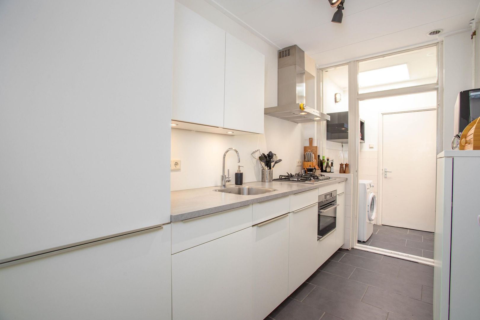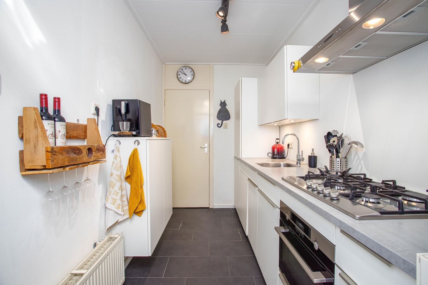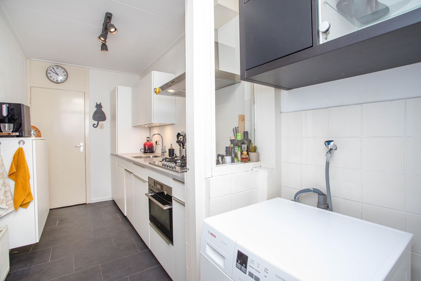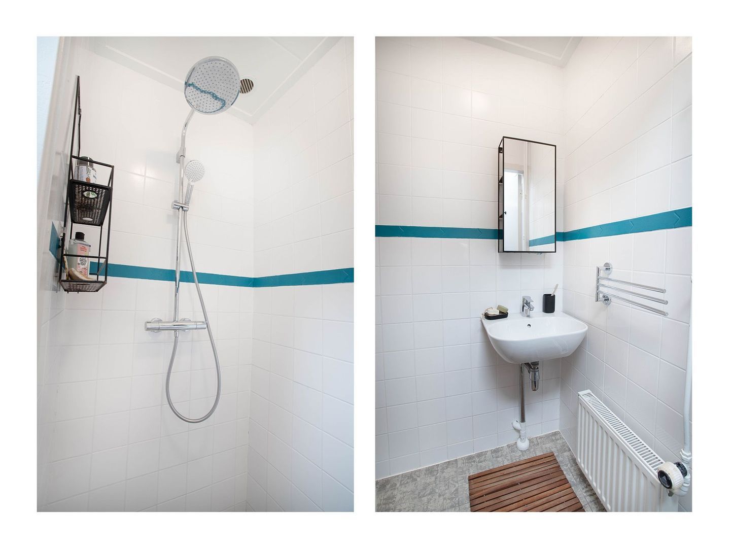 De keuken is licht en netjes en heeft alles wat je nodig hebt: een vaatwasser, oven, gasfornuis, afzuigkap, koelkast en vriezer. Dankzij het dakraam is het hier altijd lekker licht. Achter de keuken is plek voor de wasmachine en je loopt zo door naar de badkamer met een douche en wastafel.
