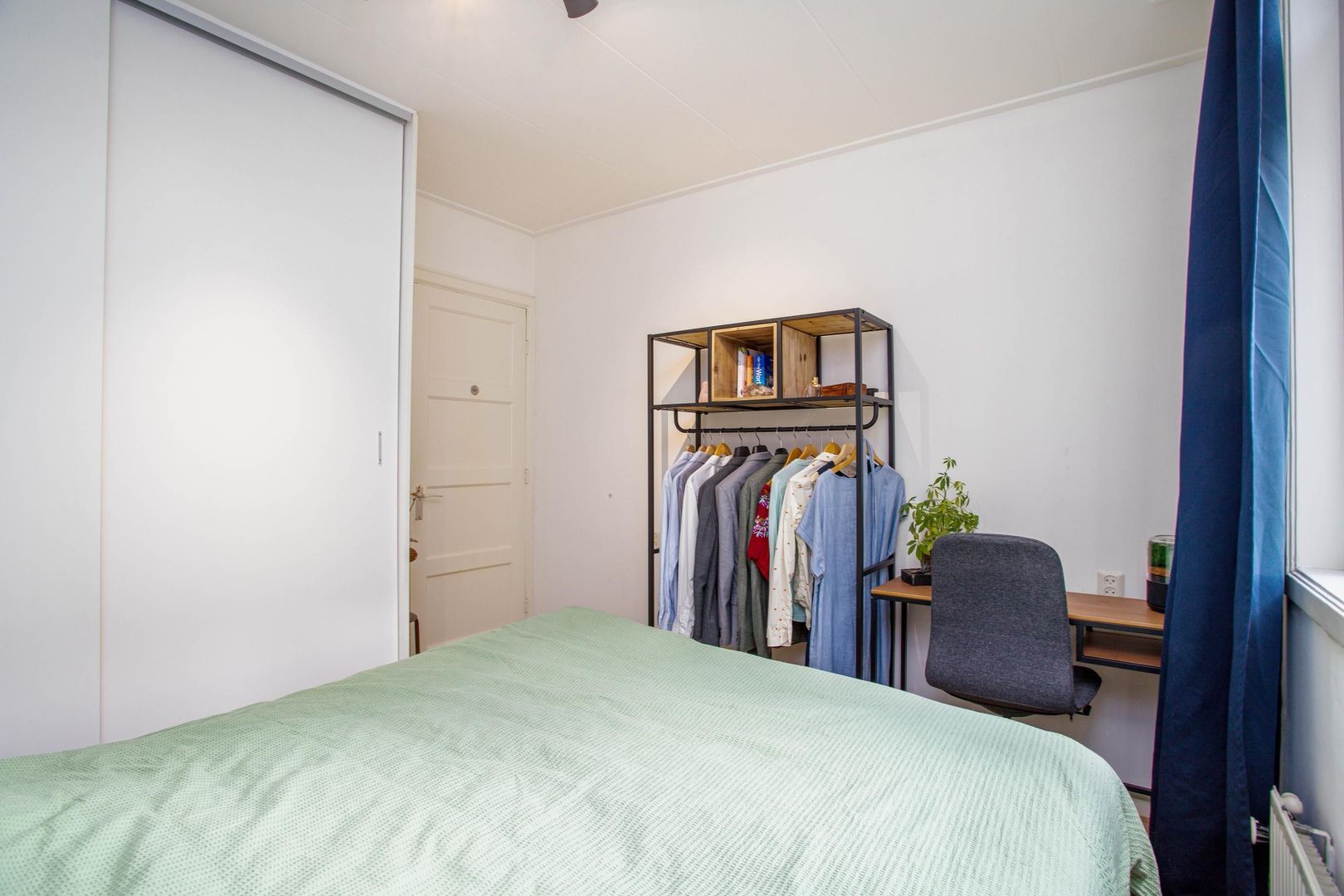 Boven kom je op de overloop die leidt naar de slaapkamer. Dankzij de grote ramen heeft de slaapkamer een fijne lichtinval. Er is ook een vaste kast, handig voor extra opbergruimte.