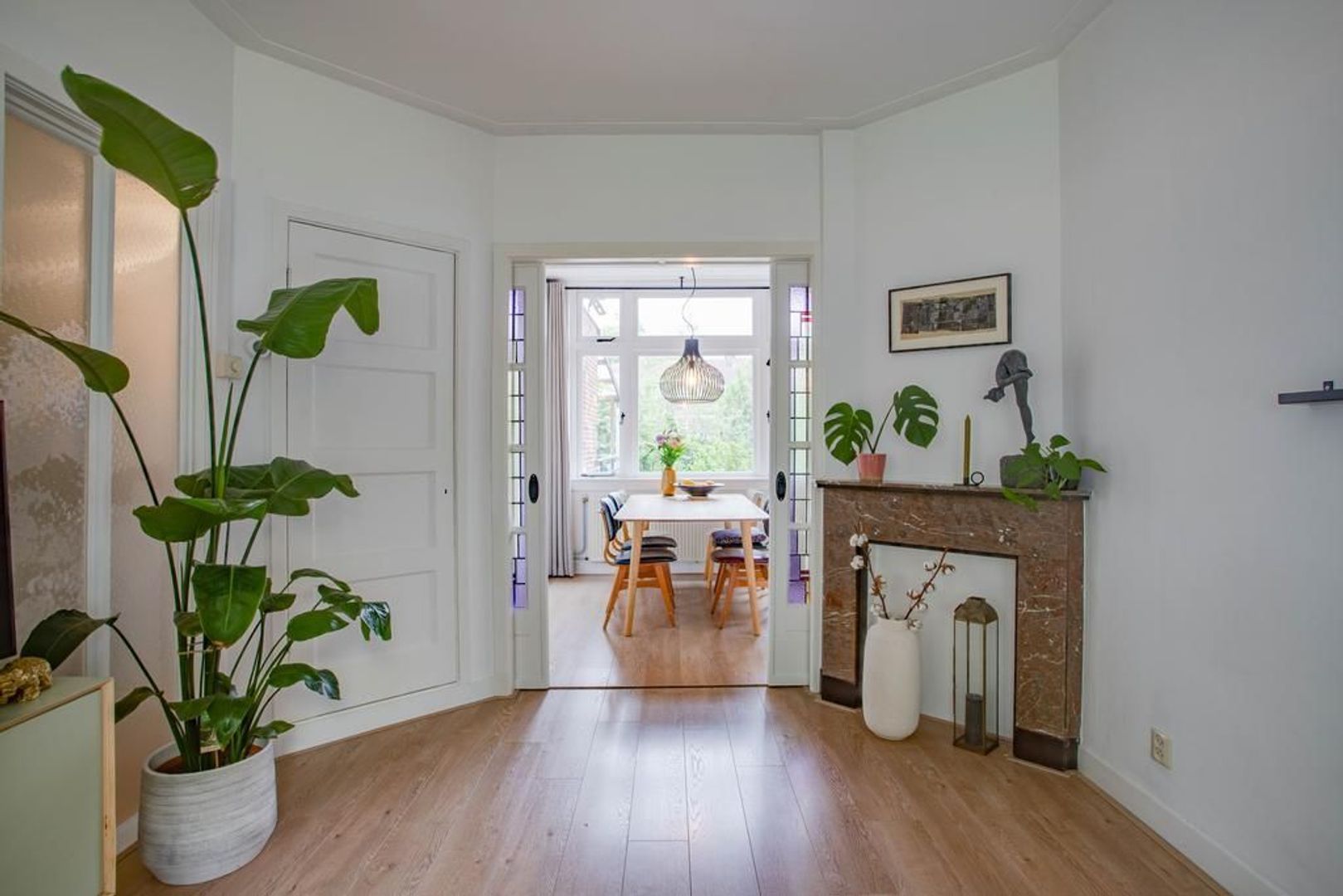 Je komt de woning binnen in de hal. De hal geeft toegang tot alle ruimtes op de eerste verdieping. De woning kenmerkt zich door de karakteristieke details en de verzorgde afwerking. Vanuit de hal betreed je de eetkamer. De eetkamer is gelegen aan de achterzijde van de woning en wordt dankzij het grote raam voorzien van fijn daglicht. Door de charmante glas-in-lood ensuite deuren betreed je de woonkamer. De woonkamer heeft een royaal formaat en is dankzij de authentieke details uitermate sfeervol te noemen. De woonkamer is voorzien van een originele schouw, authentiek hang- en sluitwerk en glas-in-lood ramen. Aan de voorzijde van de woning bevindt zich nog een kamer, welke bereikbaar is via de woonkamer. Deze ruimte wordt momenteel gebruikt als verlenging van de woonkamer, maar zou tevens goed gebruikt kunnen worden als speel- of werkkamer.