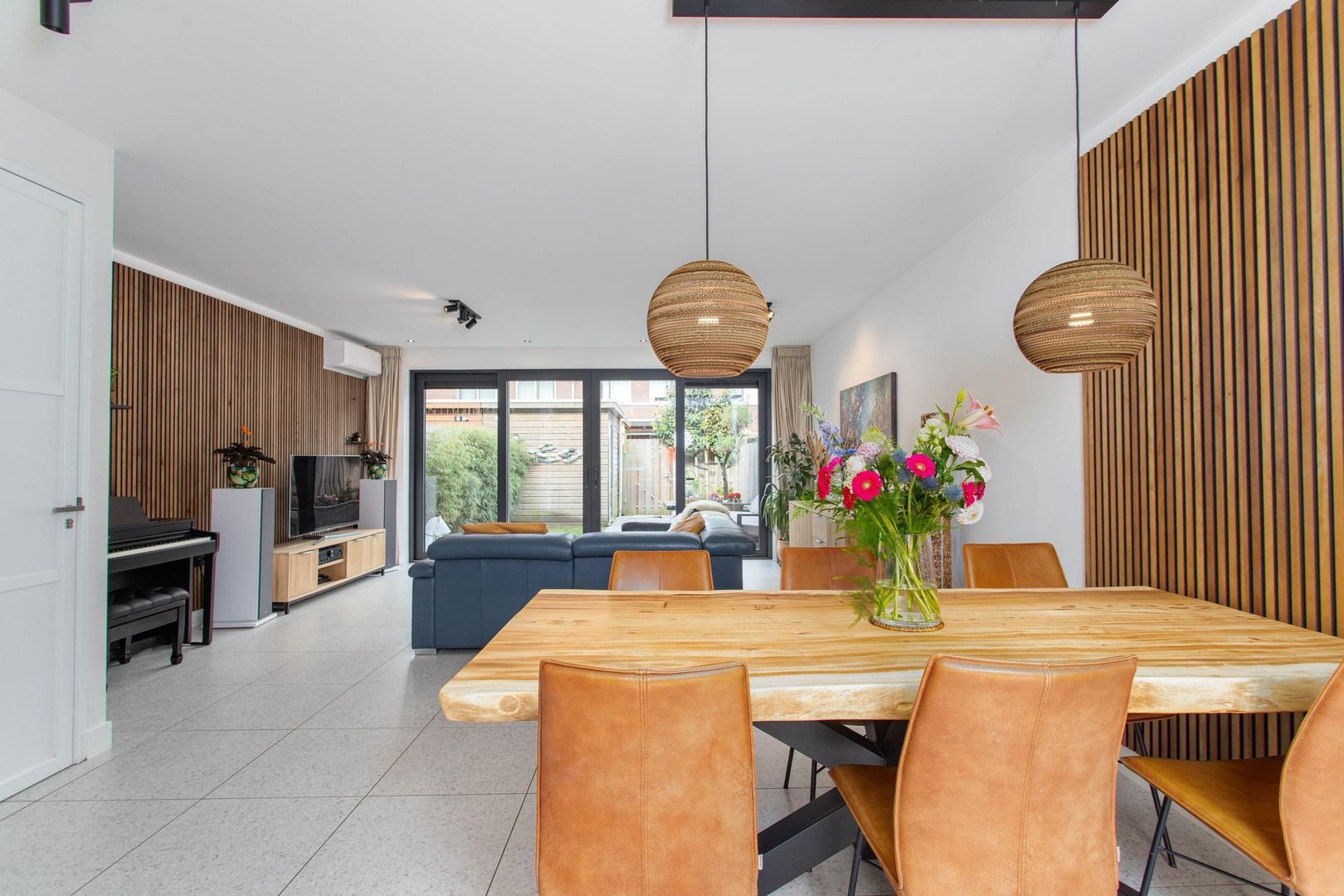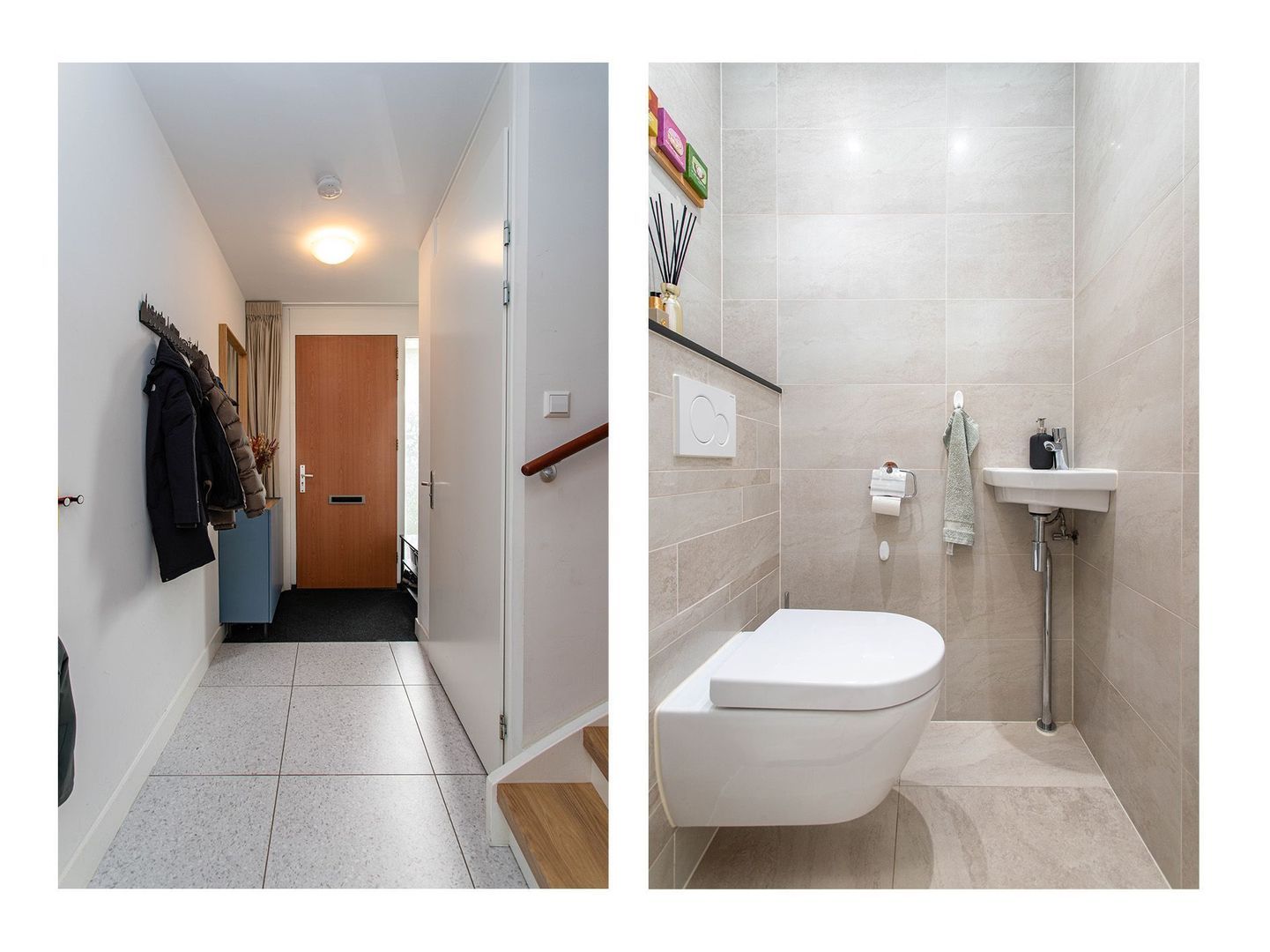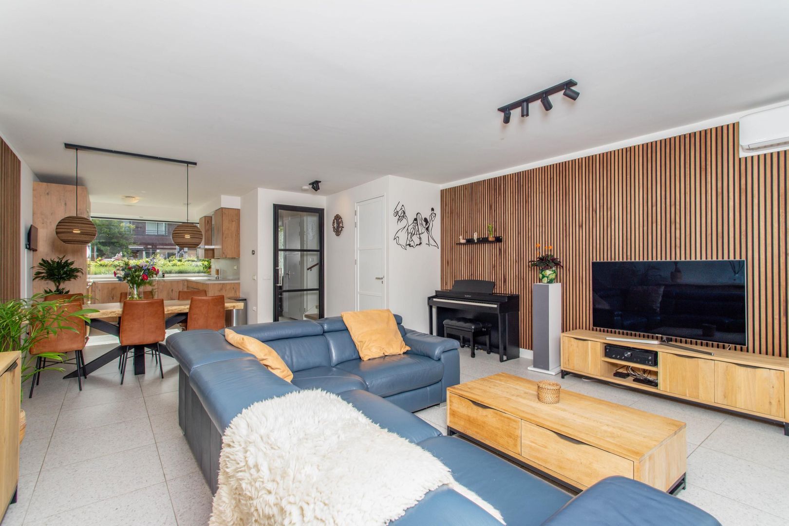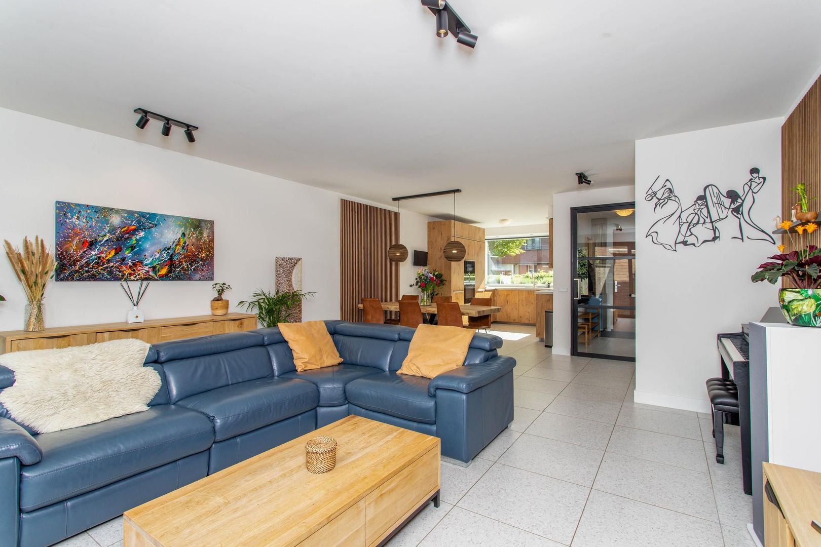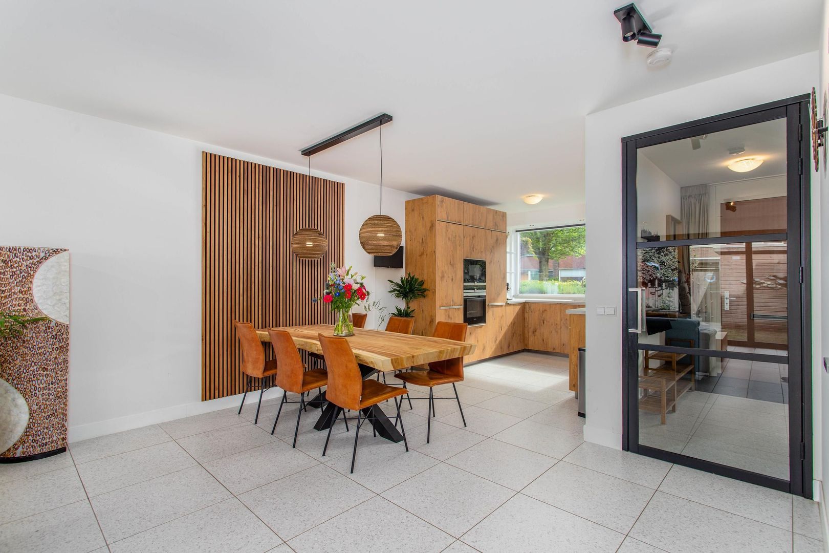 Via de voortuin bereik je de entree van de woning. Hier vind je een ruim opgezette hal met garderobe, meterkast en toiletruimte met fonteintje. De woonkamer is, mede dankzij de uitbouw en fijne breedte, verrassend ruim opgezet en voorzien van een fraaie plavuizenvloer met vloerverwarming. De luxe keuken is aan de voorzijde van de woonkamer gesitueerd en uitgevoerd met alle benodigde inbouwapparatuur. Met de aanwezigheid van een vaatwasser, magnetron, oven, Quooker en koel- en vrieskast is de keuken meer dan compleet.
