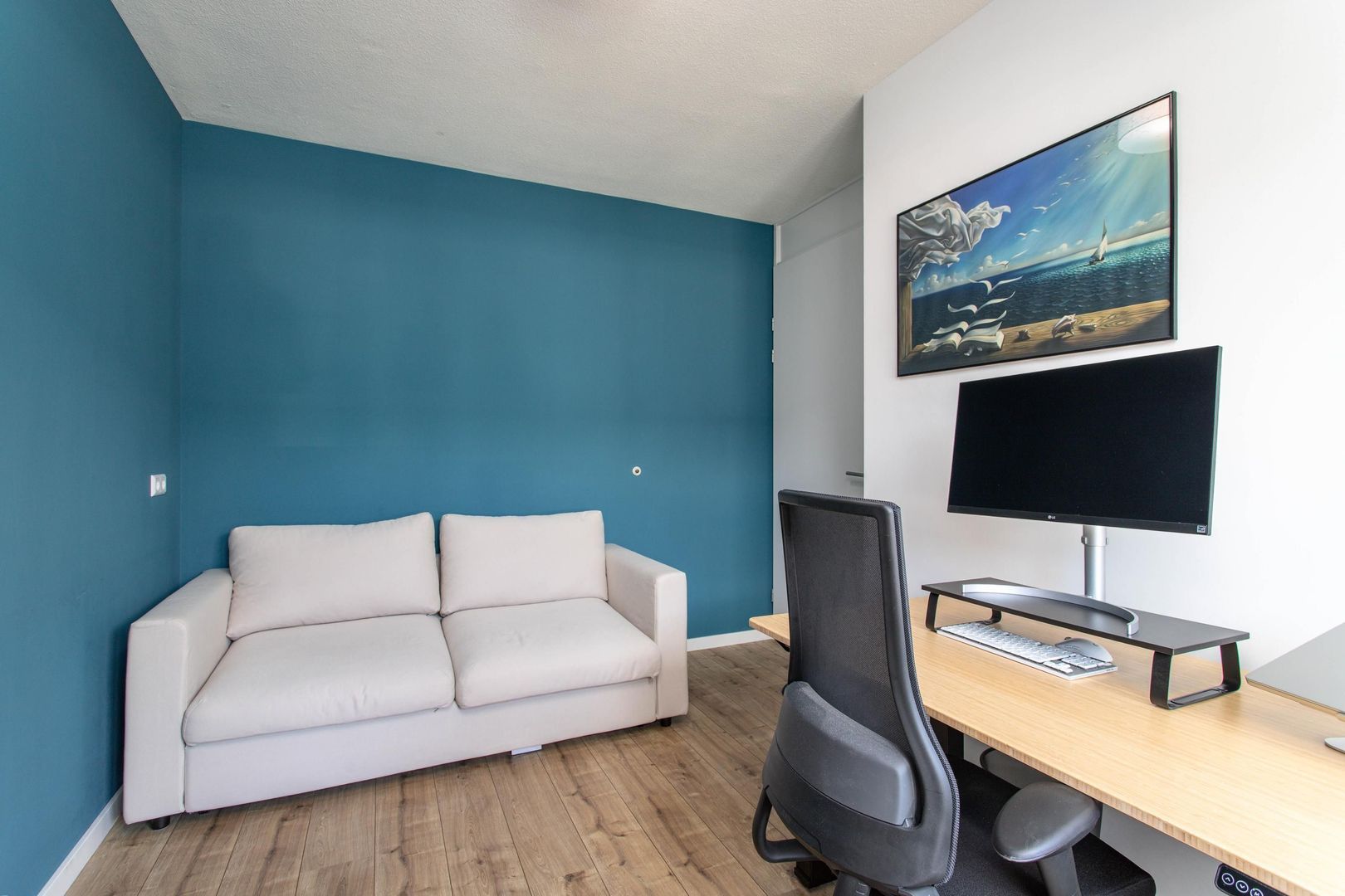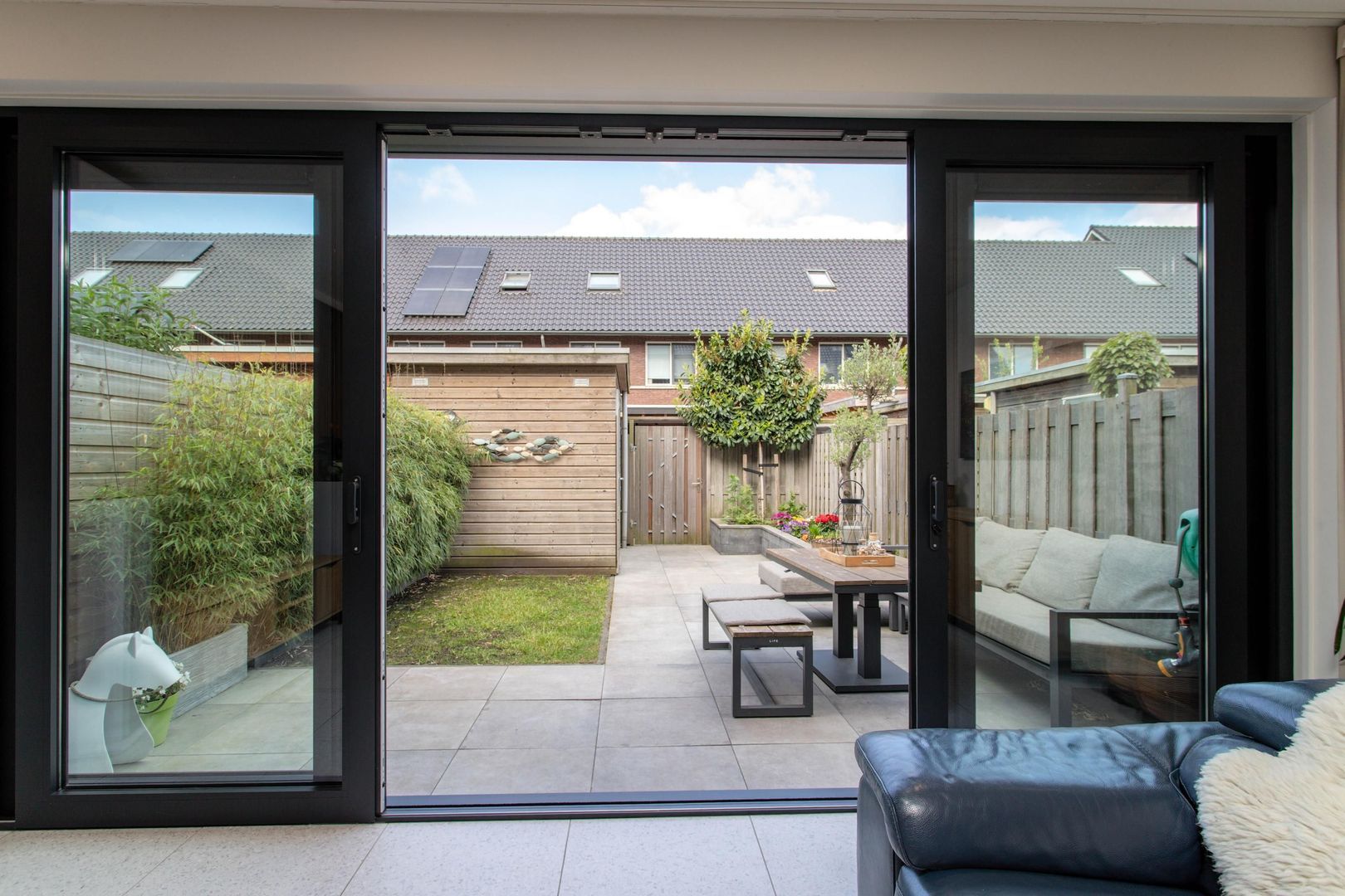 De tuingerichte zitkamer heeft dankzij de akoestische panelen een warme uitstraling en is in de afgelopen jaren flink onder handen genomen middels een uitbouw waarbij is gekozen voor een grote schuifpui. Hierdoor bereik je de fraaie achtertuin met goede zonligging. Uiteraard is deze via de achterom bereikbaar en is er een berging aanwezig. De woonkamer is net als het overgrote deel van de rest van de woning voorzien van strak stucwerk.