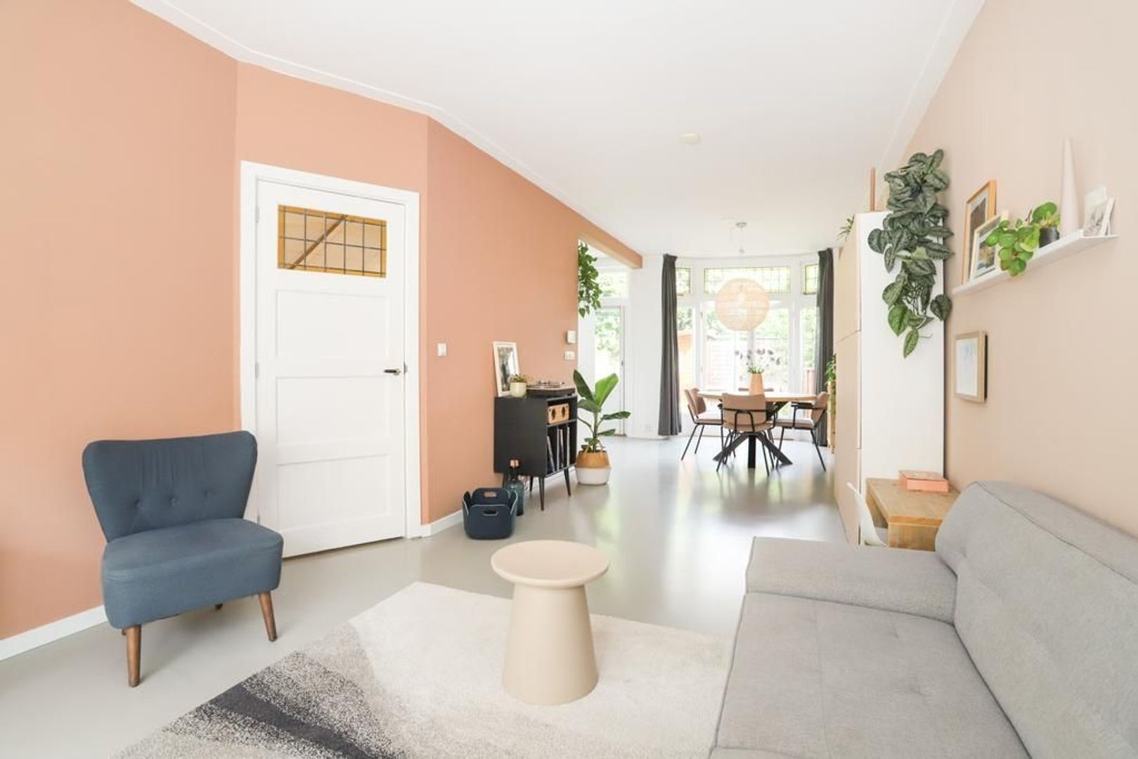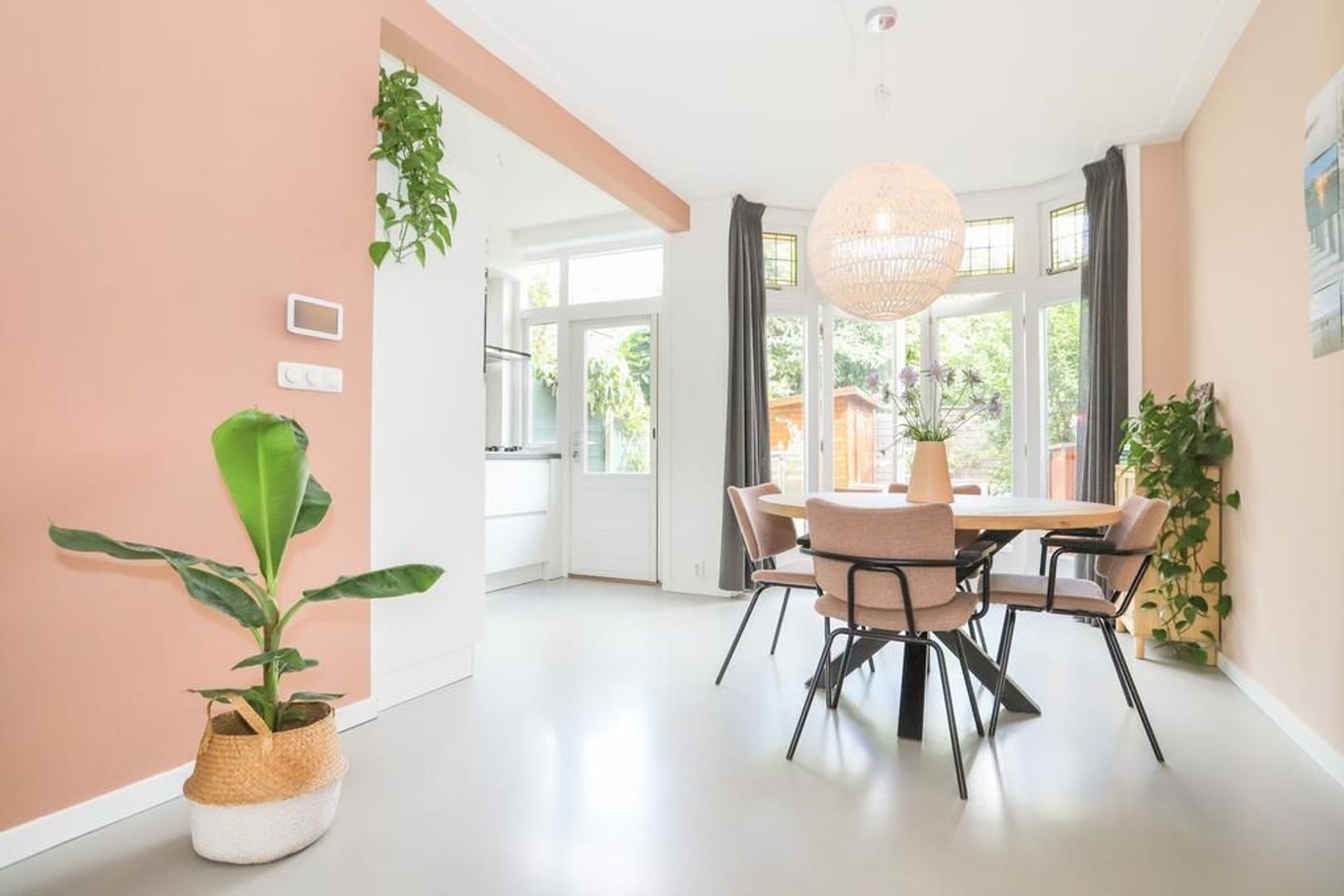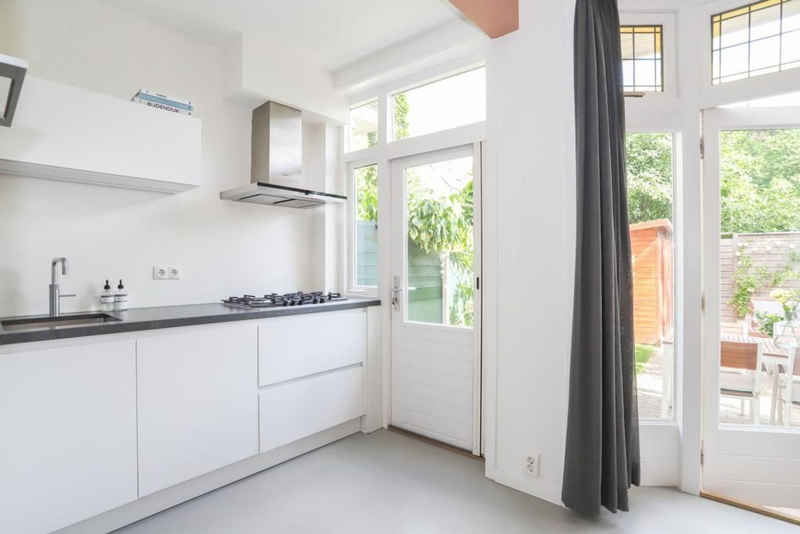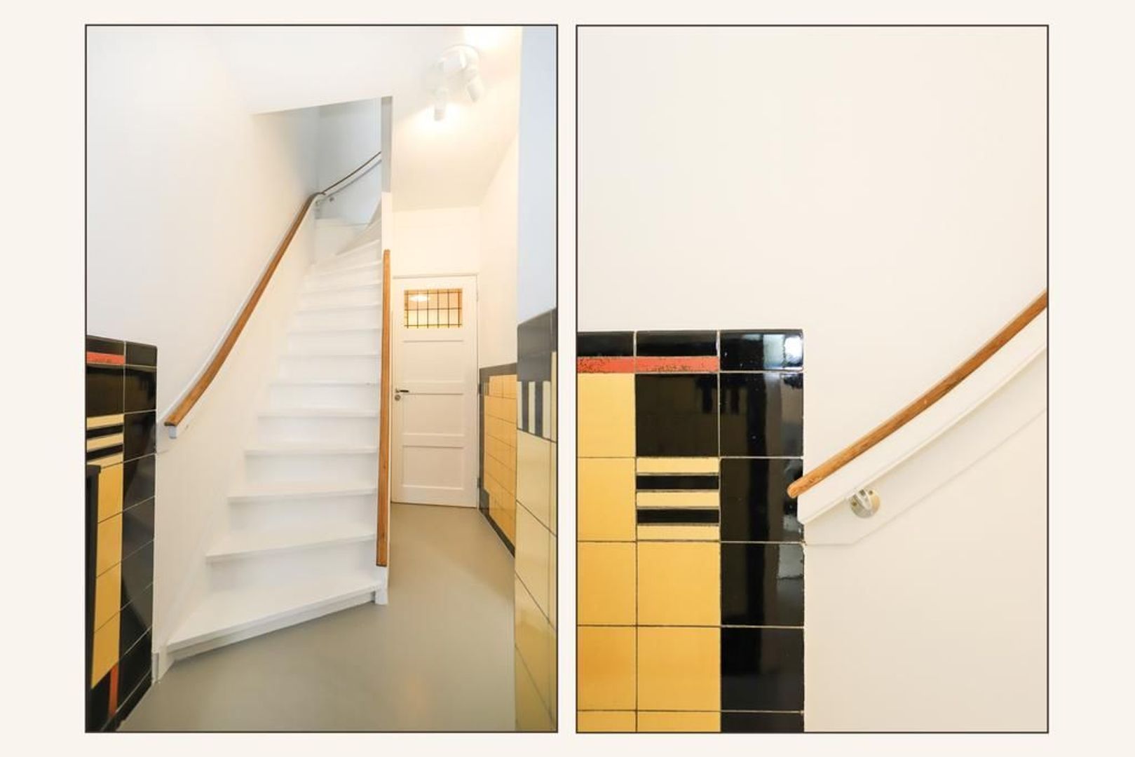 Begane grond: Voortuin gelegen op het zonnige zuiden. Entree met garderobe en authentieke details zoals de wandtegels en het glas-in-lood. Trapopgang naar de eerste verdieping, toegang tot de kelder onder het huis en separaat toilet. Wanneer je de sfeervolle woning binnen stapt merk je direct dat de ruimte licht en ruim aanvoelt. De gietvloer (met vloerverwarming) en de strak gestukte wanden met sierlijsten aan het plafond geven de moderne en een gemoedelijk uitstraling. Aan de voorzijde van de woning is de ruime zithoek gelegen met erker die voor veel licht inval zorgt. Aan de achterzijde van de woning is de royale eetkeuken gelegen met uitzicht op de groene achtertuin. Hier is voldoende plek voor een grote eettafel waar gezellig gedineerd en geborreld kan worden. De moderne matwitte keuken is voorzien van inbouw apparatuur zoals een 5-pits gastoestel, afzuigkap, combi-oven, koel-vriescombinatie, Quooker en een vaatwasser.