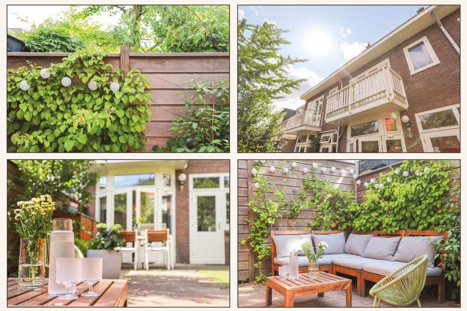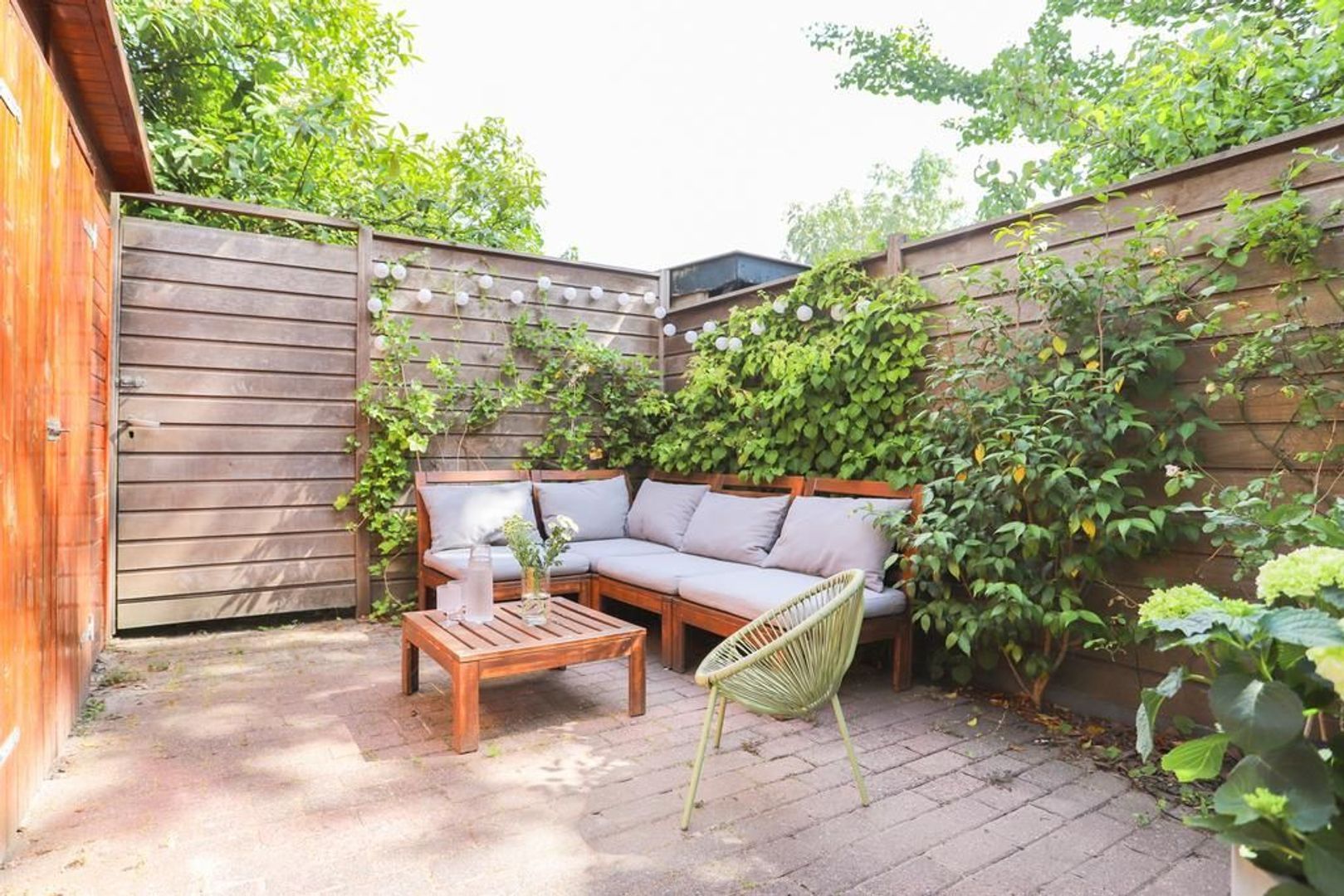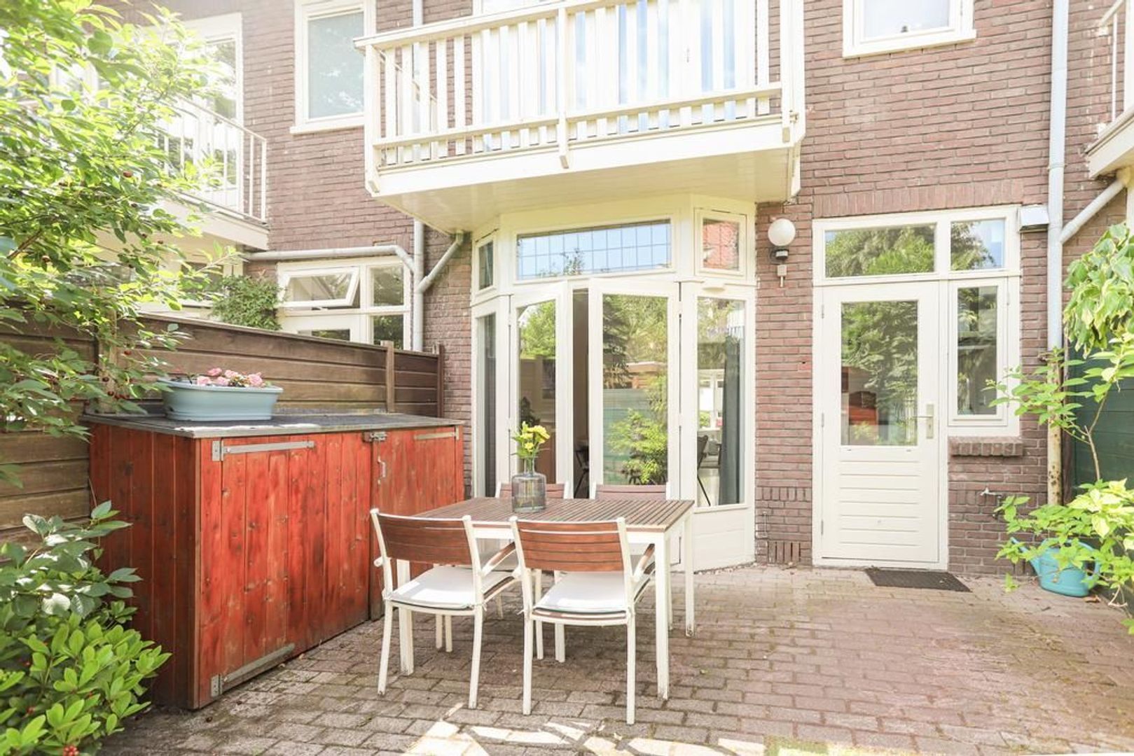 Zowel via de deur in de keuken als de openslaande deuren (met het originele glas-in-lood, in dubbel glas uitgevoerd) is de achtertuin toegankelijk. De achtertuin is gelegen op het noorden en biedt vele zonuren aan. Verder is er bestrating, verschillende plantenborders, een grasveld, een achterom en zijn er twee bergingen aanwezig.