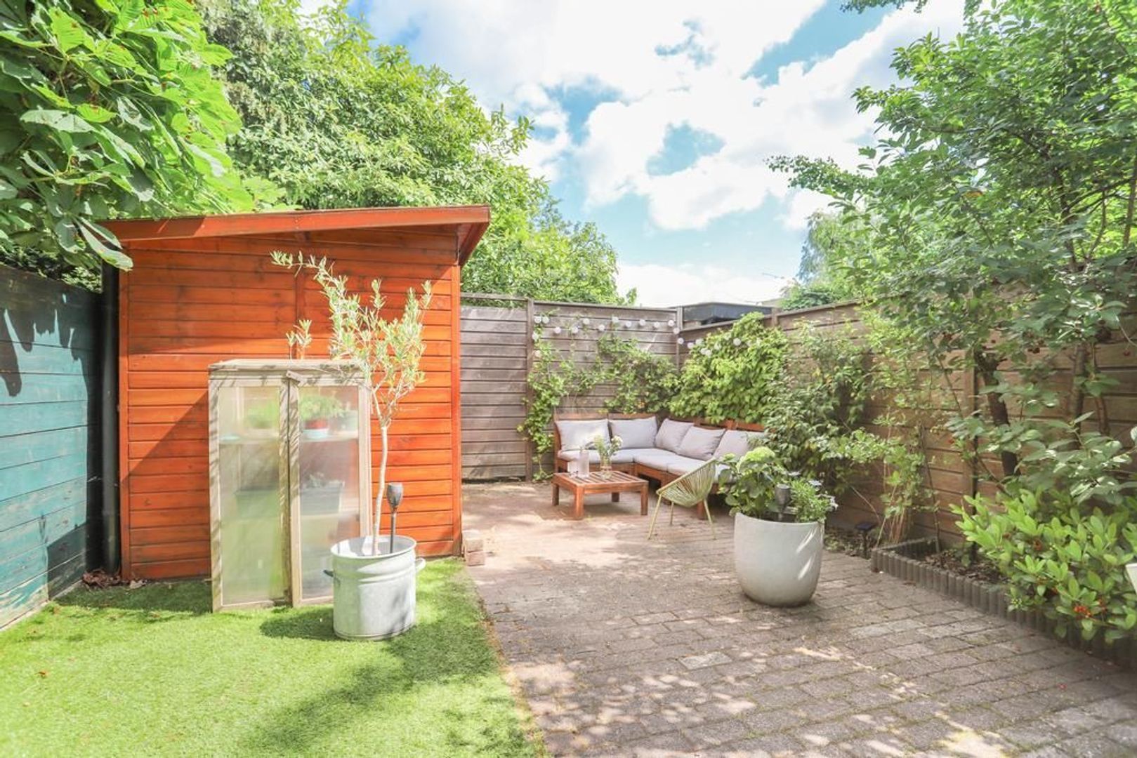 • Voortuin gelegen op het zuiden en achtertuin op het noorden waardoor er altijd een plek in de zon én schaduw te vinden is (achtertuin voorzien van achterom en berging);