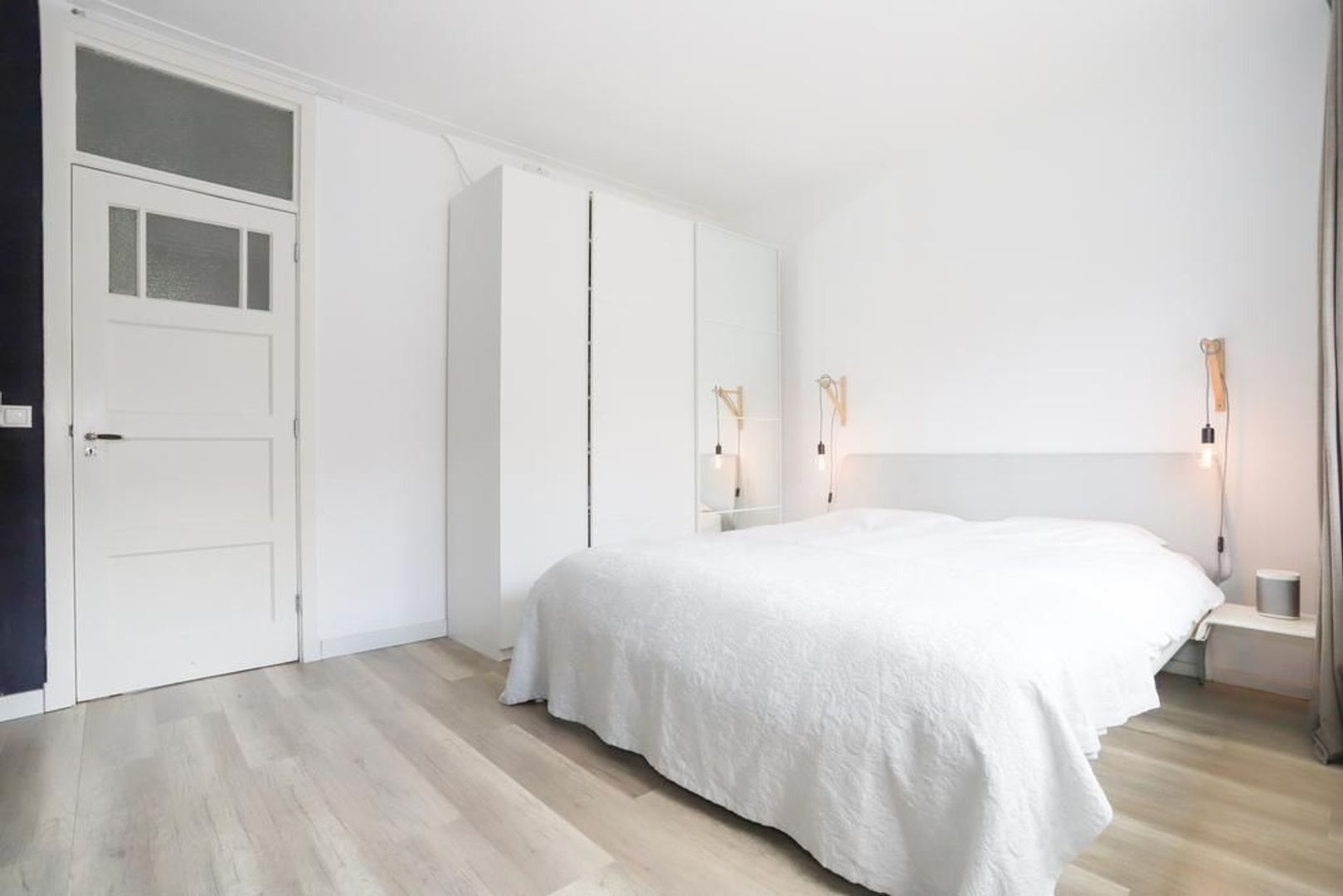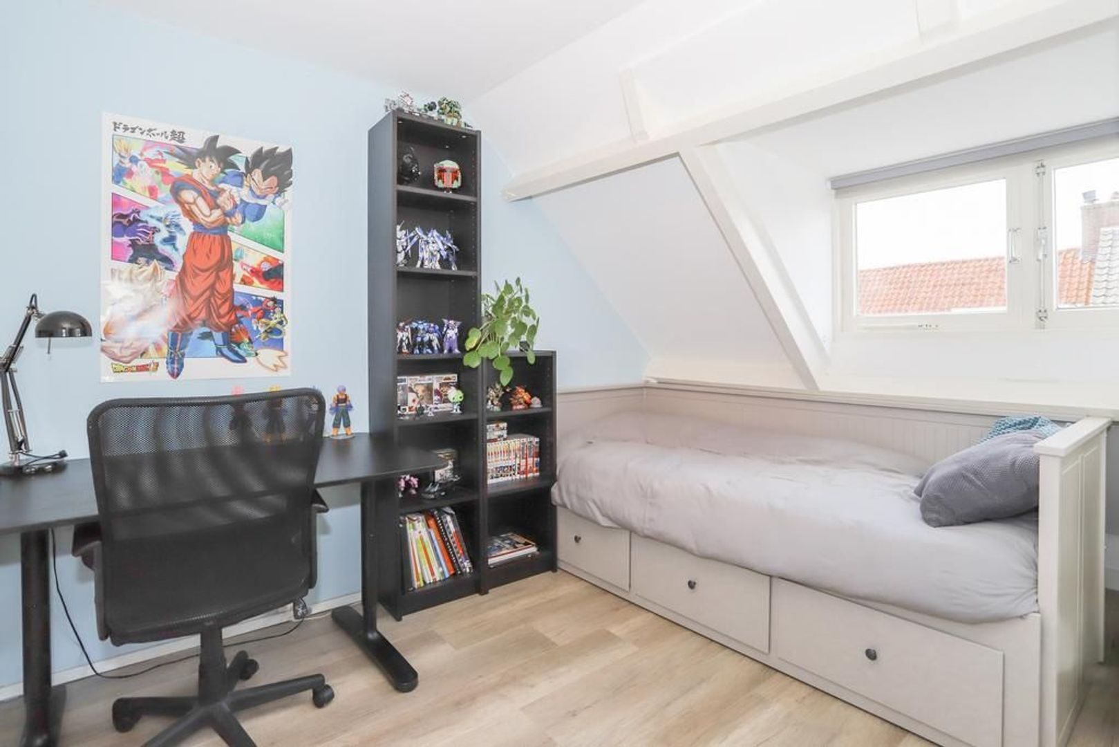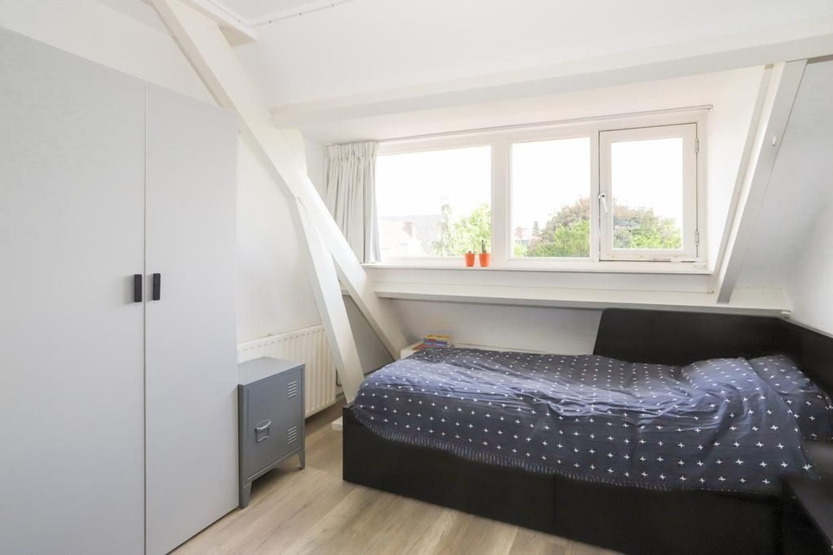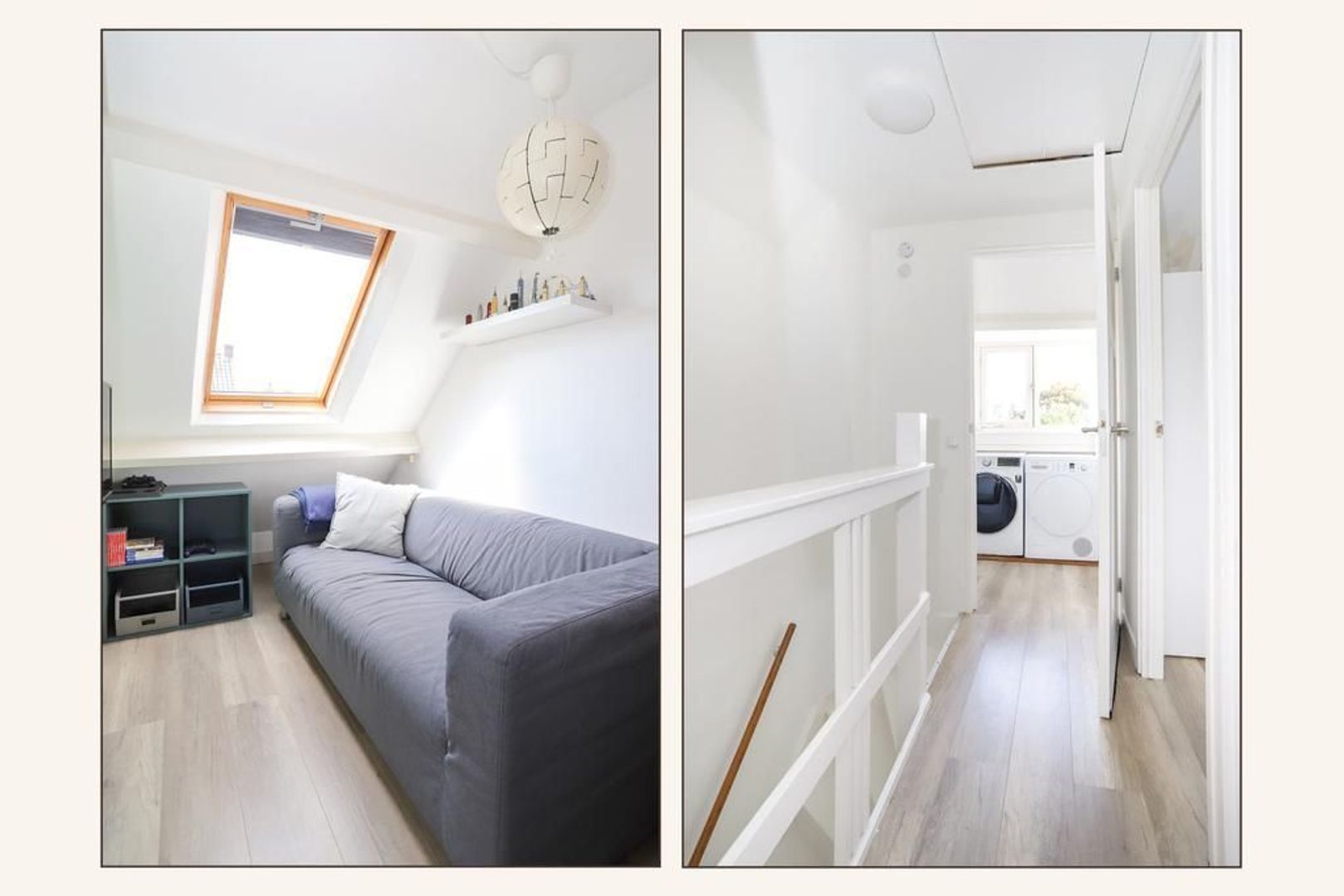 Eerste verdieping: Overloop met vaste trap naar de tweede verdieping. Op deze verdieping is er een royale slaapkamer aan de voorzijde van de woning gelegen en een fijne twee slaapkamer aan de achterzijde, die voorzien is van een vaste kast en toegang geeft tot het balkon. Het balkon is gelegen op het noorden waar je kan genieten van de ochtendzon. Beide slaapkamers zijn voorzien van een mooie laminaat vloer.