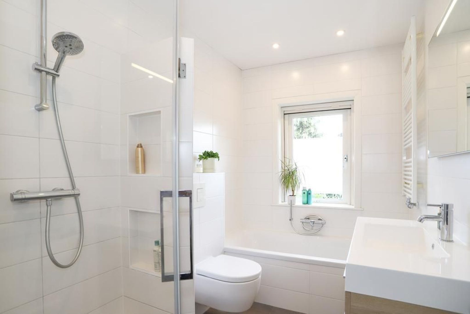 De moderne badkamer is uitgevoerd met tegelwerk en voorzien van een inloopdouche, ligbad, tweede toilet en een wastafel met meubel.