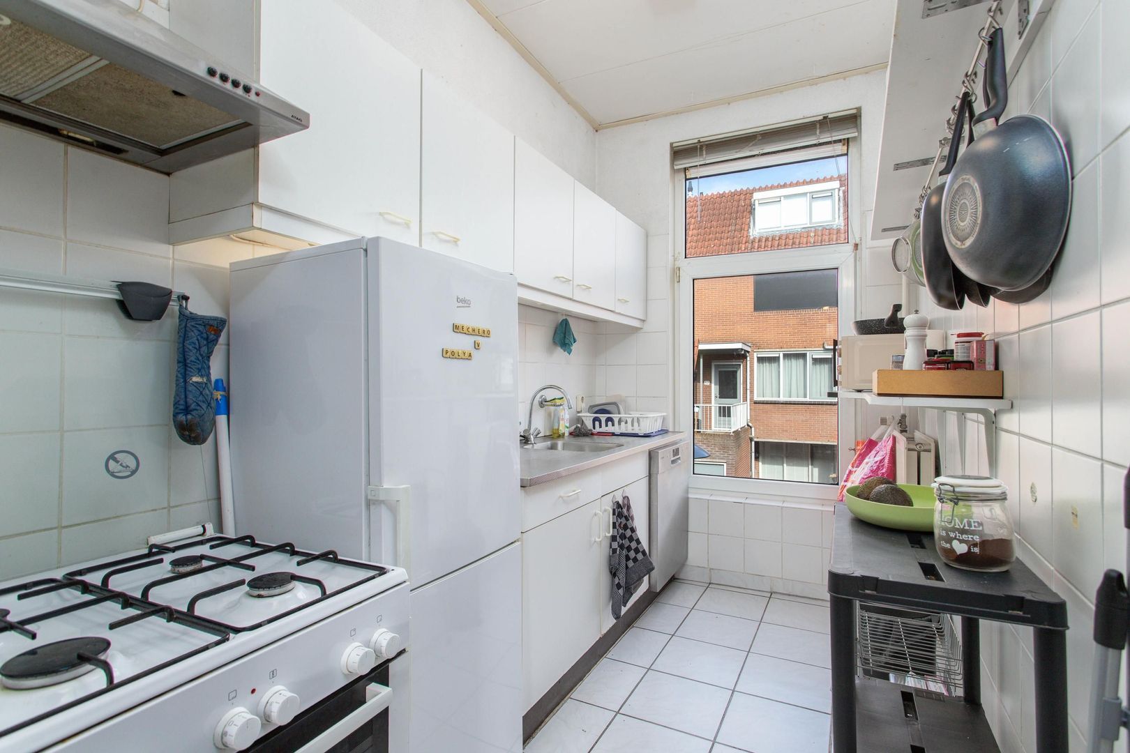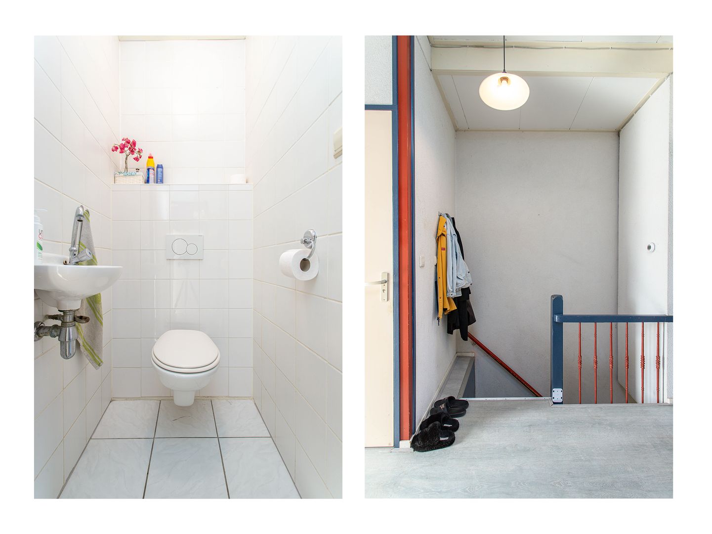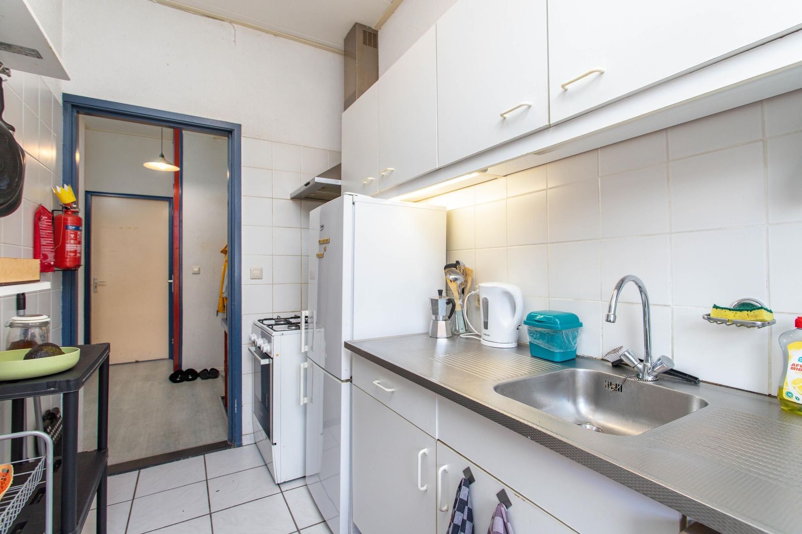Momenteel is de woning ingedeeld met een woonverdieping op de tweede woonlaag en dichte keuken met eenvoudig keukenblok. Er is vanuit de centrale hal een toilet bereikbaar alsmede de beide kamers waarvan een toegang geeft tot het fijne dakterras met privacy en goede zonligging (zuidoost). Op de slaapverdieping zijn nog eens twee ruime kamers gesitueerd. De centraal gelegen badkamer is verouderd maar functioneel, er is een inloopdouche, wastafel en aansluitpunt voor de wasmachine aanwezig.
