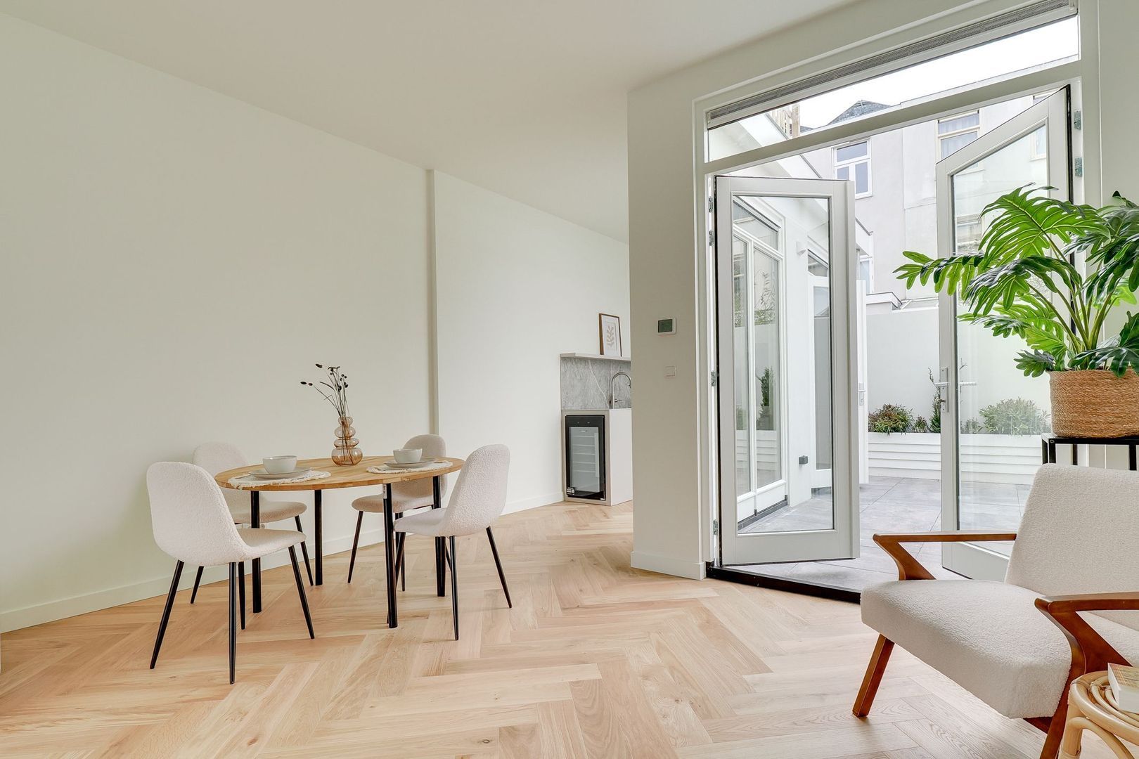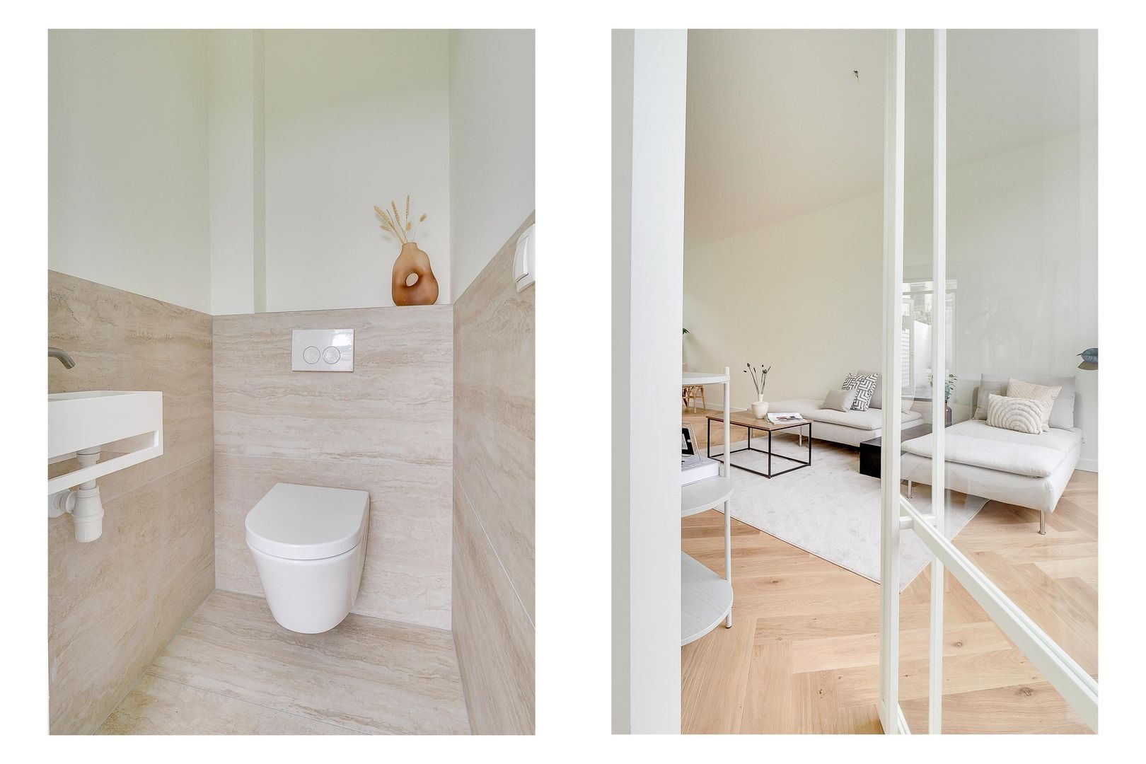 Je betreedt deze prachtige en karakteristieke woning via de voortuin en de hal, waar zich een modern separaat toilet bevindt, voorzien van een wastafel en hoogwaardige afwerking. Via de elegante glazen witte taatsdeur kom je in de ruime en lichte woonkamer. De woonkamer is afgewerkt met een strakke houtenvisgraatvloer en dankzij de grote ramen aan zowel de voor- als achterzijde geniet je van veel natuurlijk licht.