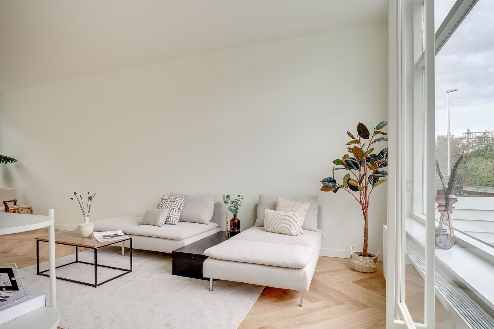 Het zitgedeelte biedt royaal plaats aan een comfortabele zithoek, terwijl de wanden in 2025 volledig strak zijn gestuct.