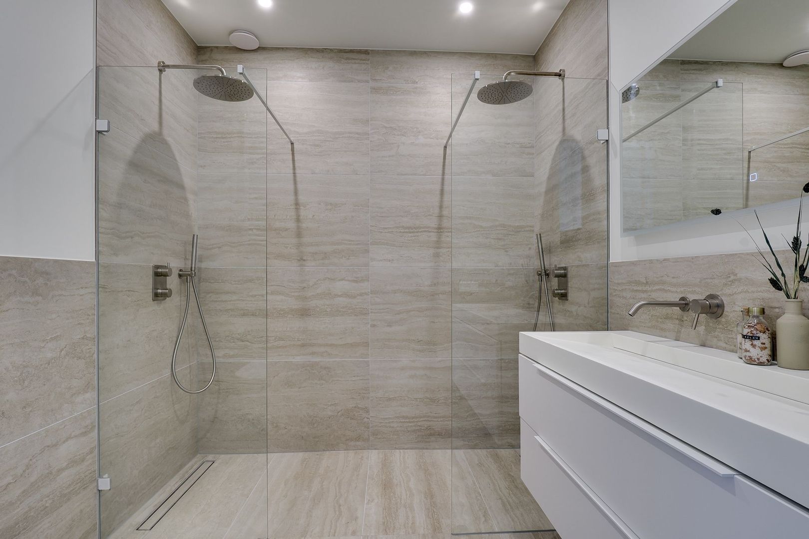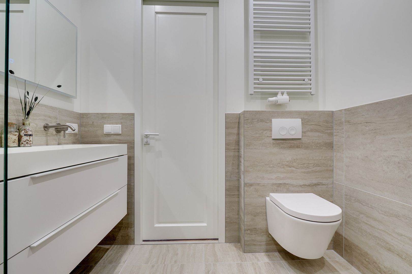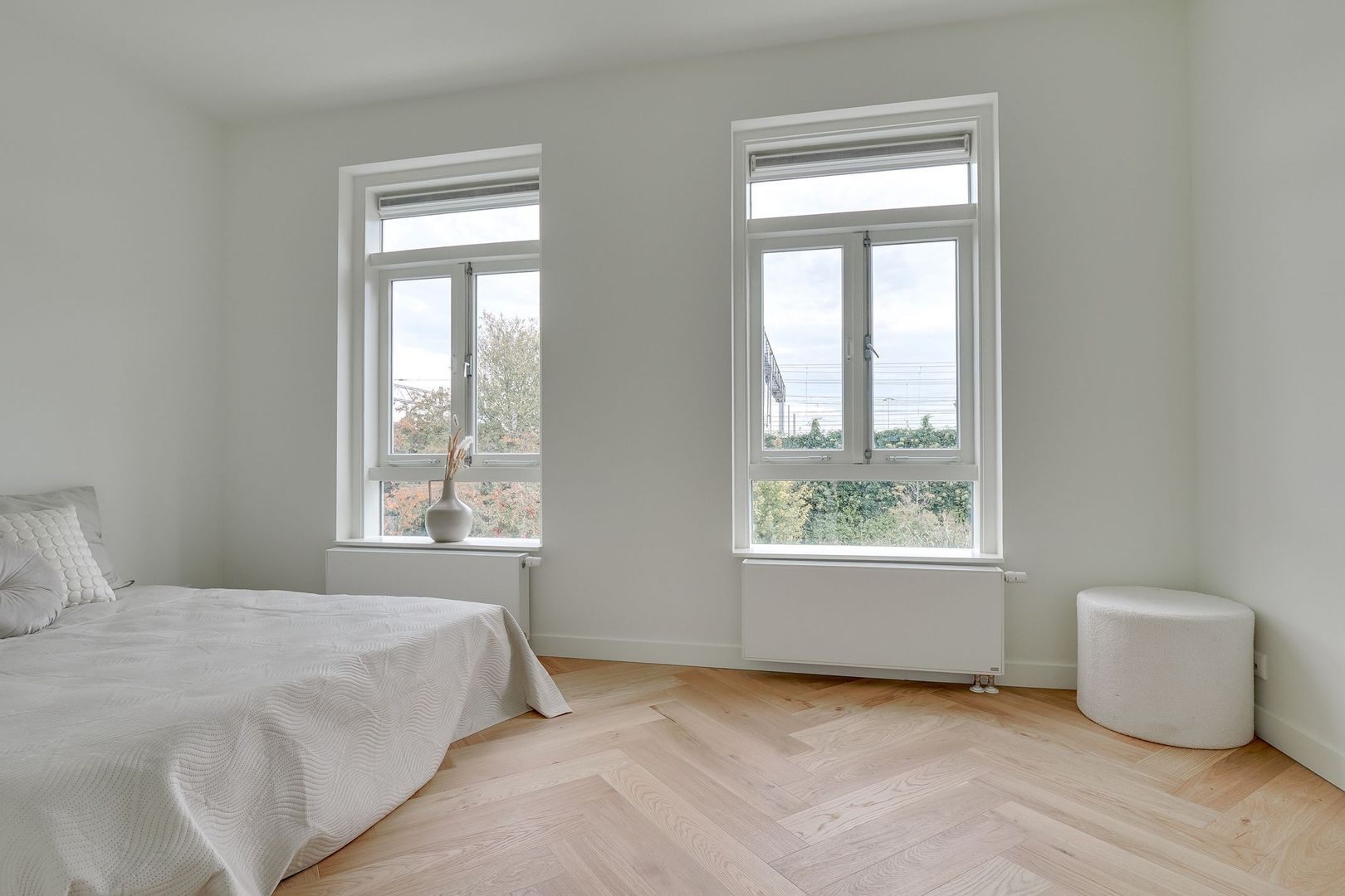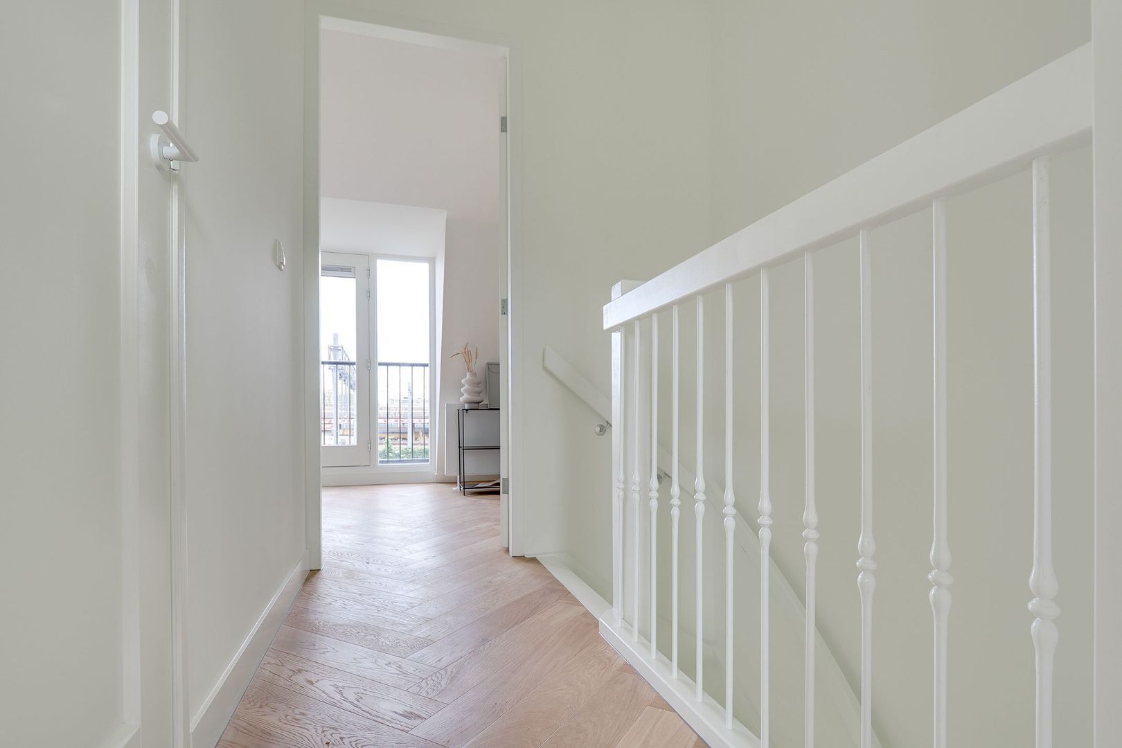 De eerste verdieping is eveneens afgewerkt met een nette houten visgraatvloer en hoogwaardige materialen. Dankzij de recente renovatie is de indeling praktisch en goed doordacht. De moderne badkamer is strak vormgegeven en voorzien van een dubbele regendouche, toilet, een brede wastafel met stijlvol wastafelmeubel en een designradiator.
