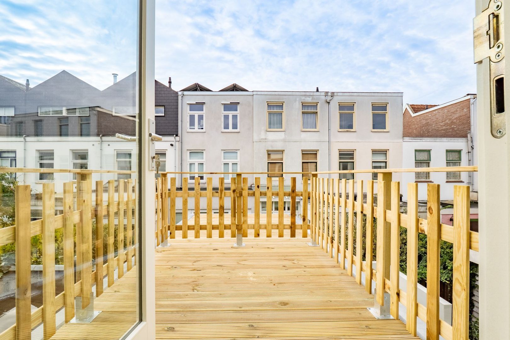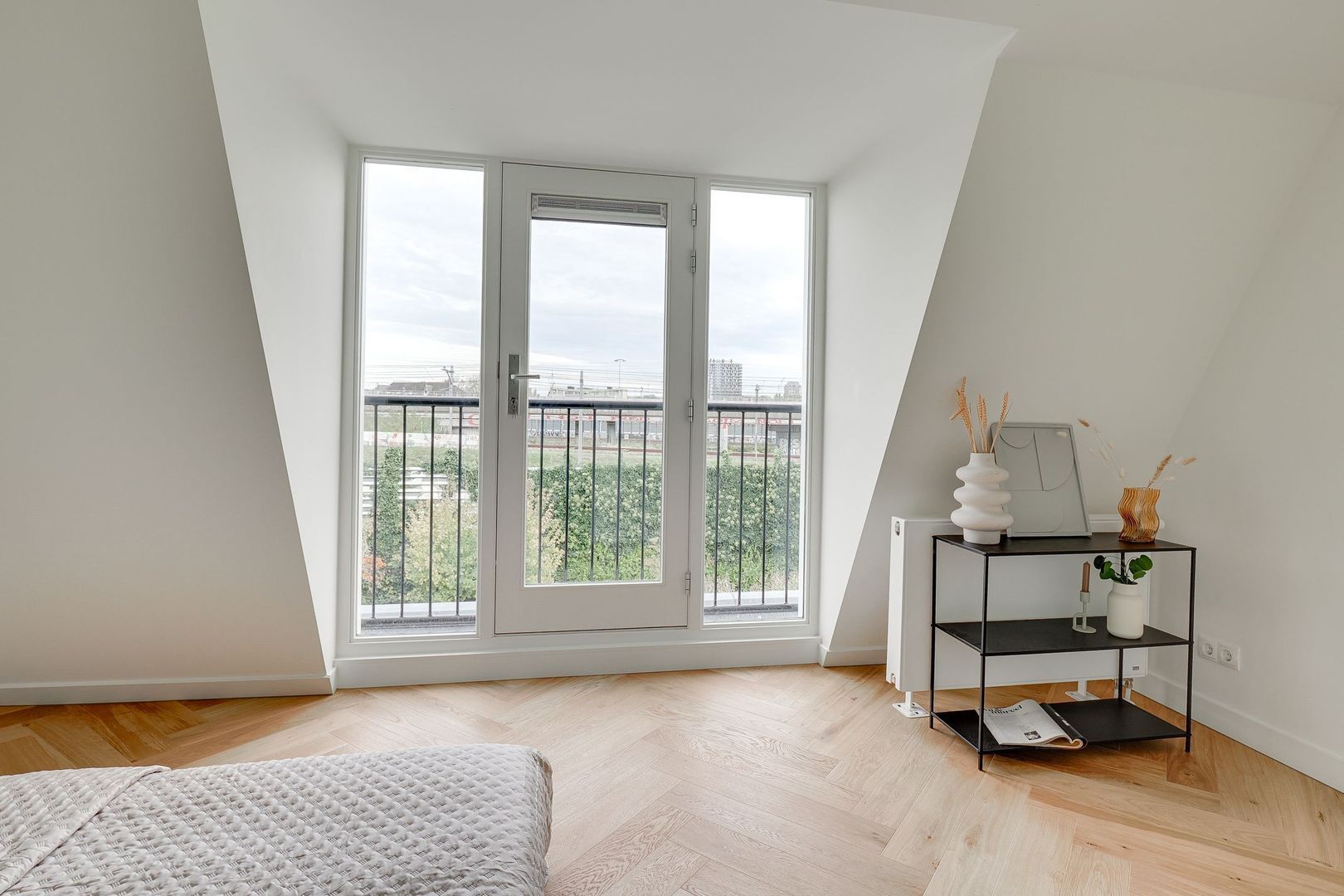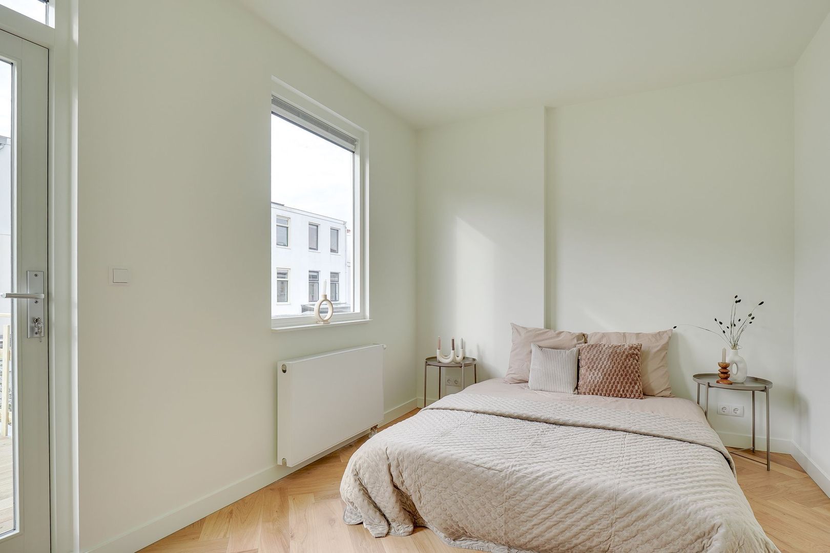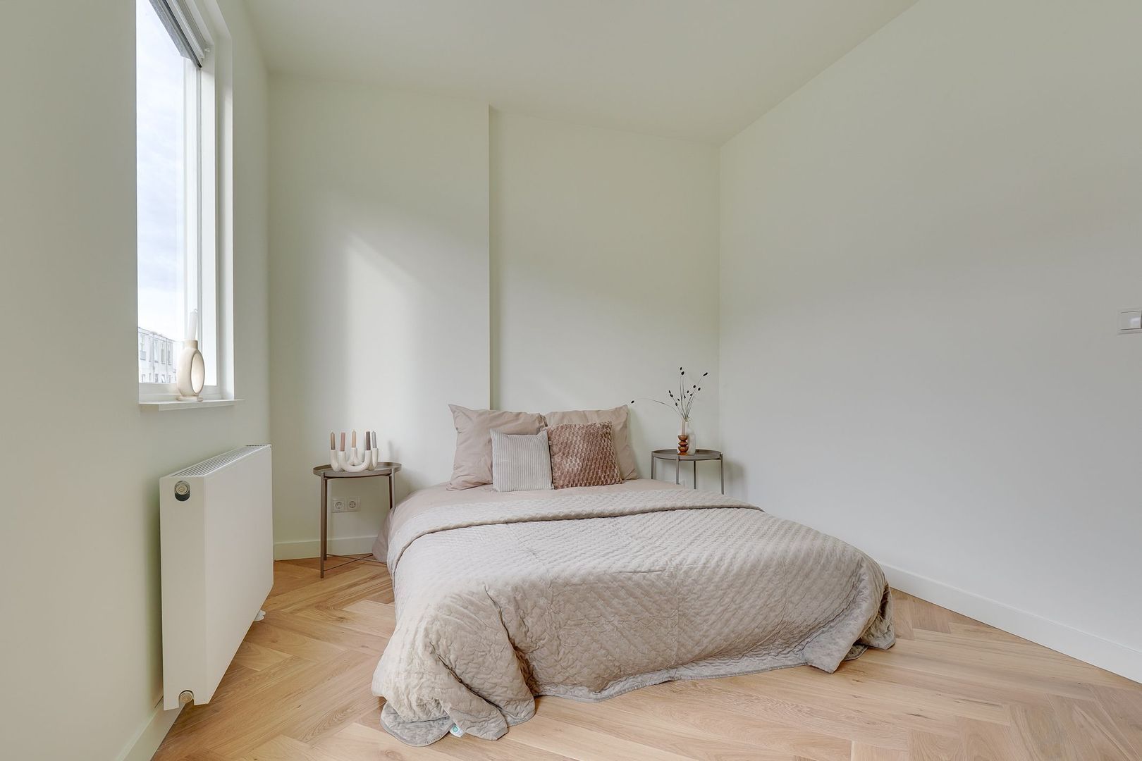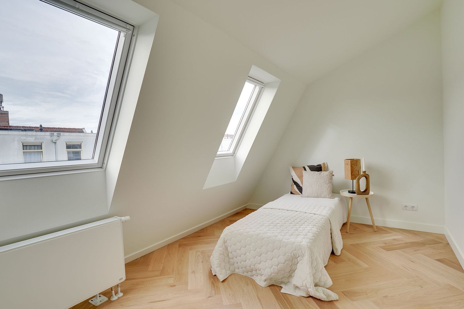 De slaapkamer aan de achterzijde is eveneens ruim en ideaal te gebruiken als slaapkamer, logeerkamer of thuiswerkplek. Aangrenzend bevindt zich een dakterras — een heerlijke plek om in de ochtend van een kopje koffie te genieten.