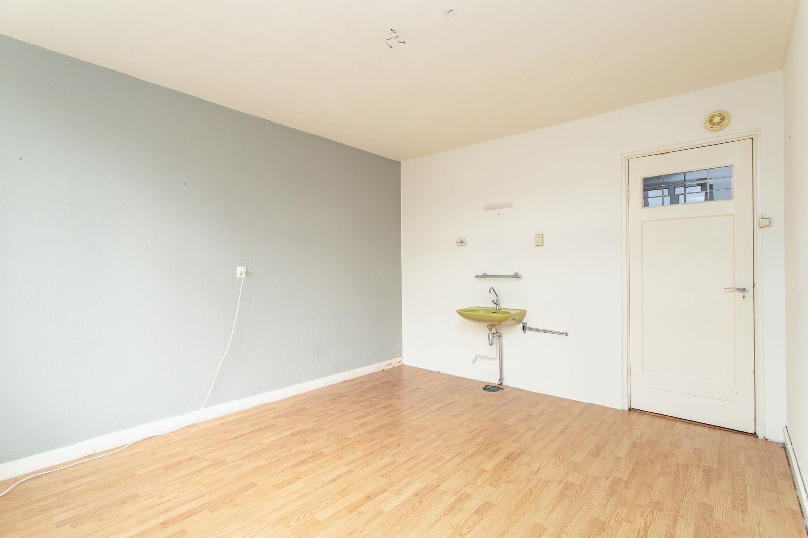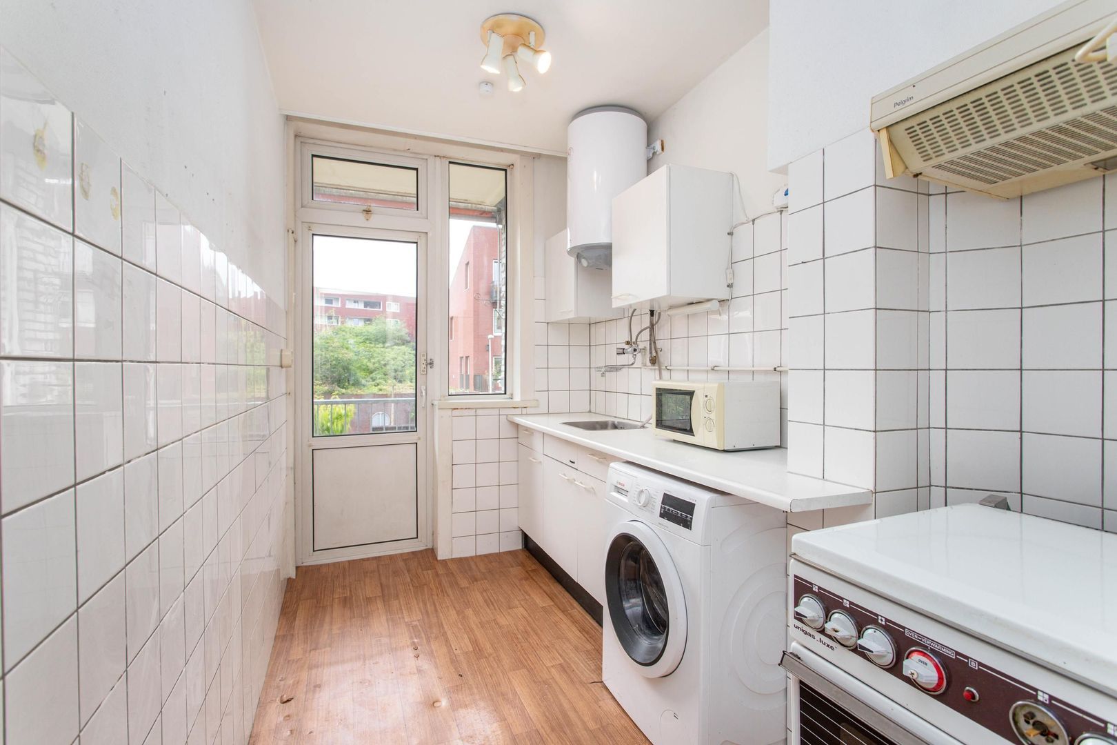De keuken bevindt zich aan de achterzijde en is voorzien van een aansluiting voor de wasmachine en de elektrische boiler. Vanuit de hal is tevens de badkamer bereikbaar, uitgerust met een douche en wastafel.