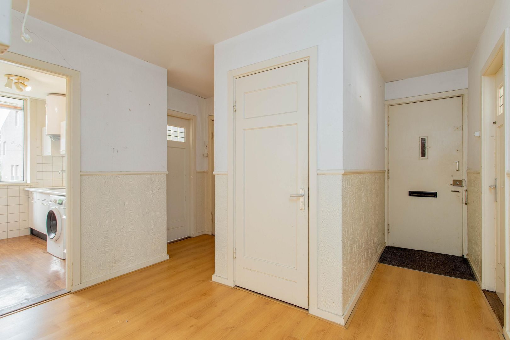 Je komt de woning binnen via de karakteristieke portiek en betreedt het appartement via de eigen entree. De centrale hal geeft toegang tot de verschillende vertrekken, de keuken, het separaat toilet en de badkamer.