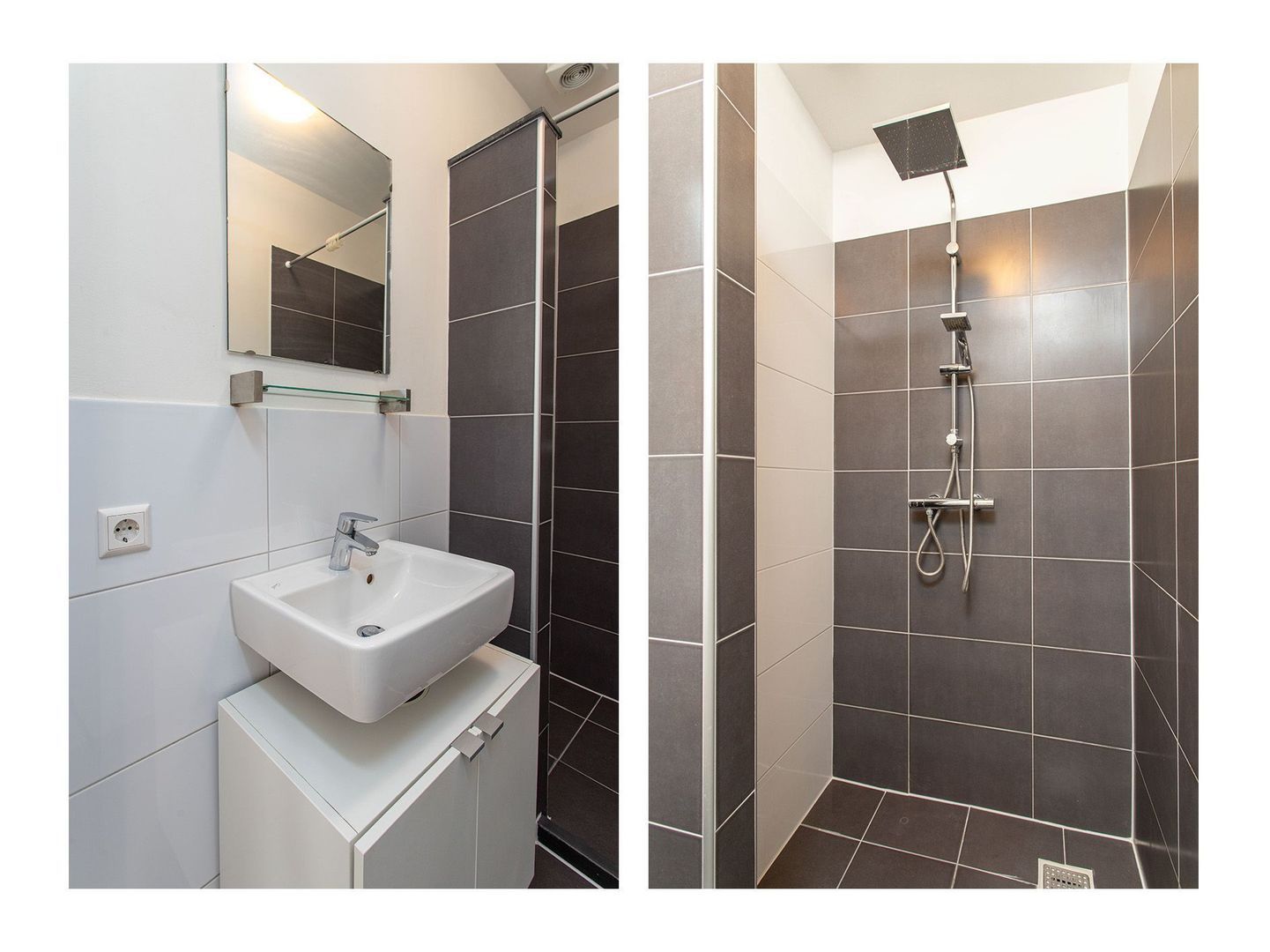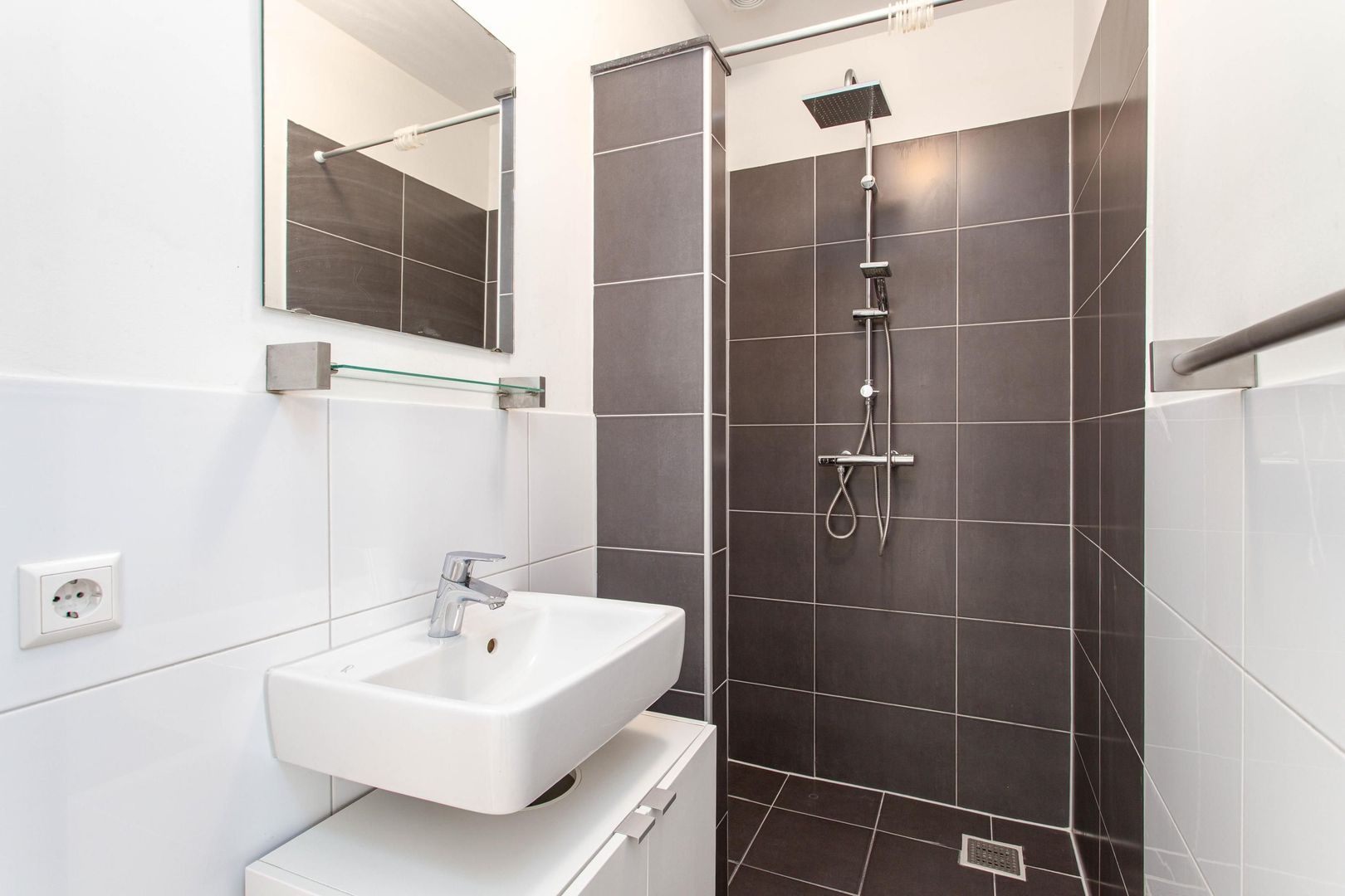 De badkamer is netjes afgewerkt en uitgerust met een wastafel en een inloopdouche.