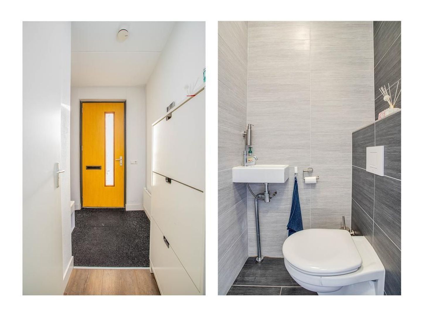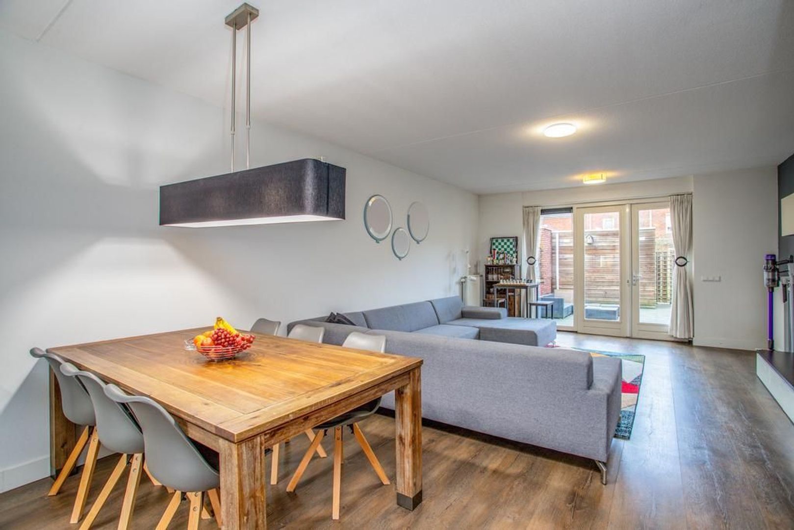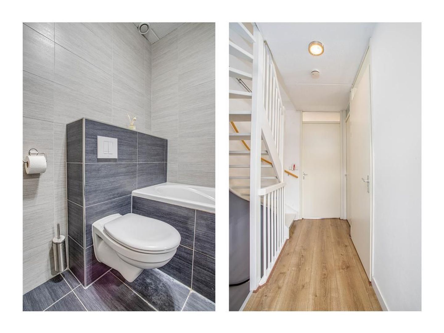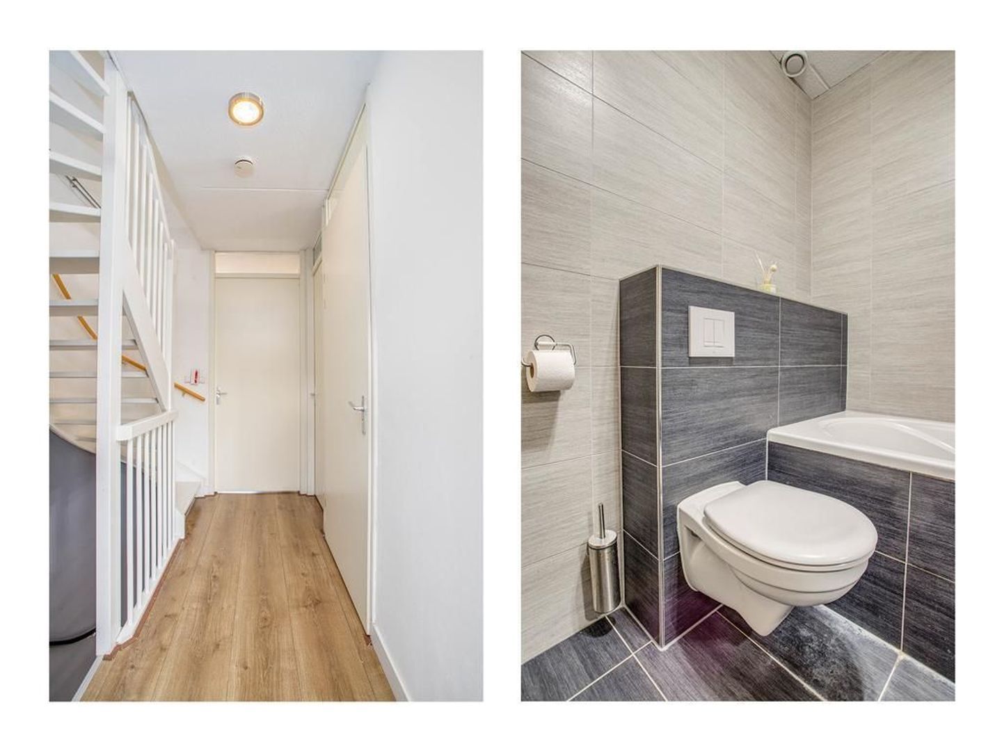 Je betreedt de woning via de vrolijke, kleurrijke gele deur en komt terecht in de hal. Deze hal biedt toegang tot het toilet en de woonkamer. De ruime woonkamer biedt voldoende plek voor een grote hoekbank en een lange eettafel. Aangrenzend vind je de open keuken, die een prettige indeling heeft en van alle gemakken is voorzien. De keuken is uitgerust met inbouwapparatuur zoals een koffiezetapparaat, oven, vaatwasser, inductiekookplaat, afzuigkap, koelkast en vriezer. Via de openslaande deuren in de woonkamer kom je in de heerlijke, volledig betegelde tuin, die beschikt over een handige houten berging en een achterom. In de woonkamer bevindt zich een open trap die leidt naar de eerste verdieping.