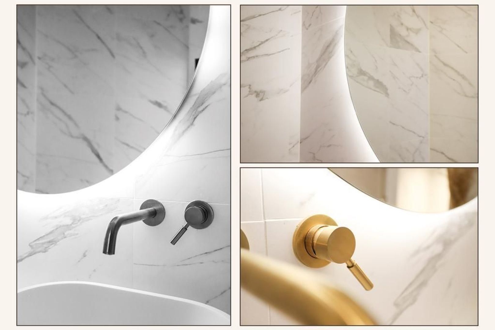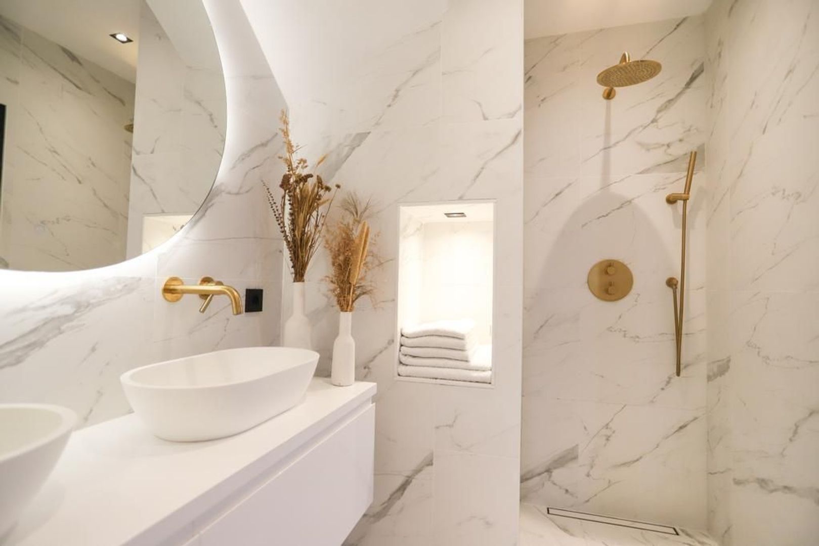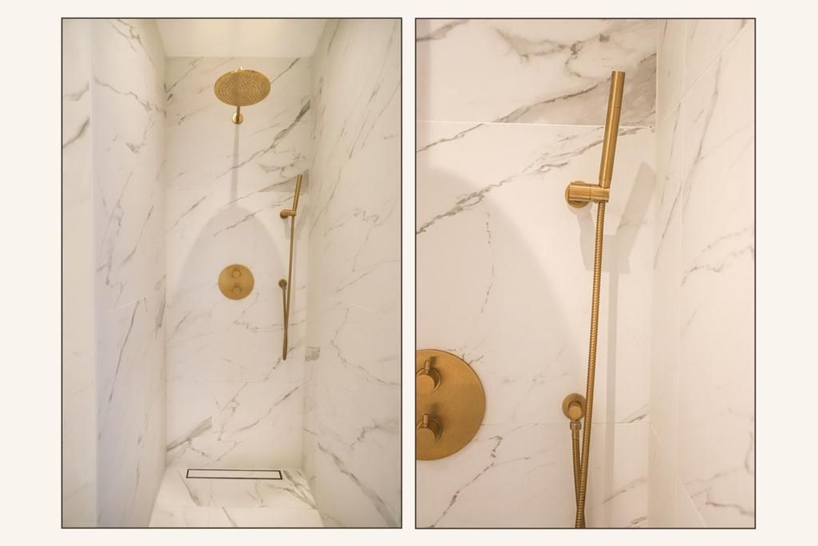 Vanuit de woonkamer is de luxe badkamer toegankelijk. De badkamer is voorzien van tegelwerk en uitgevoerd met een dubbele wastafel met meubel en een inloopdouche.