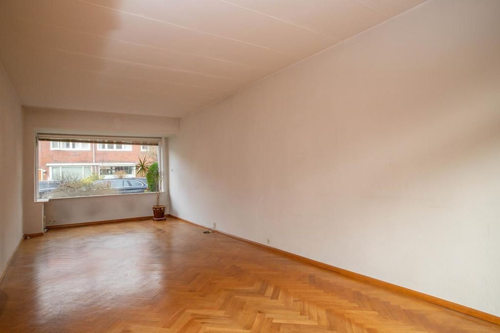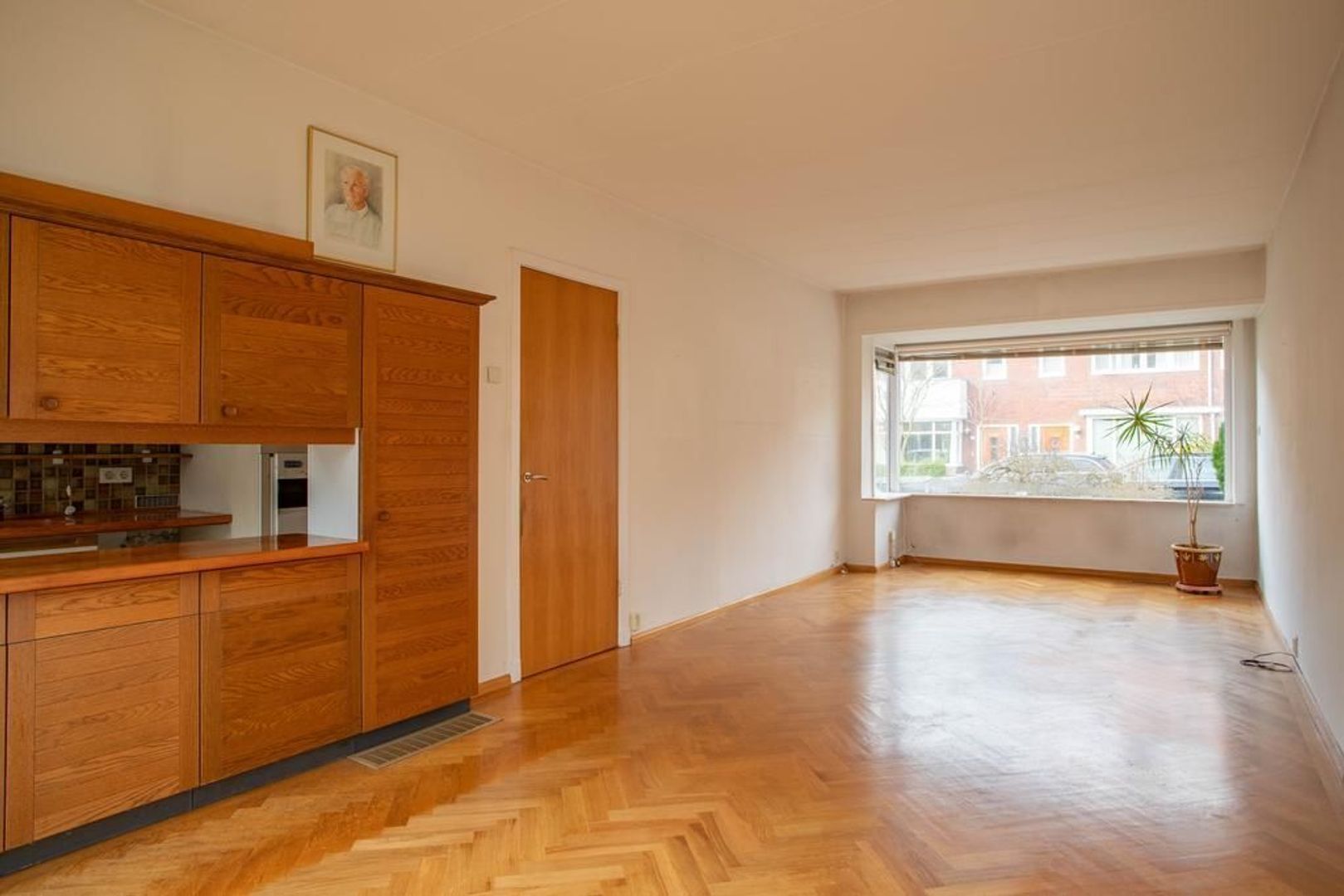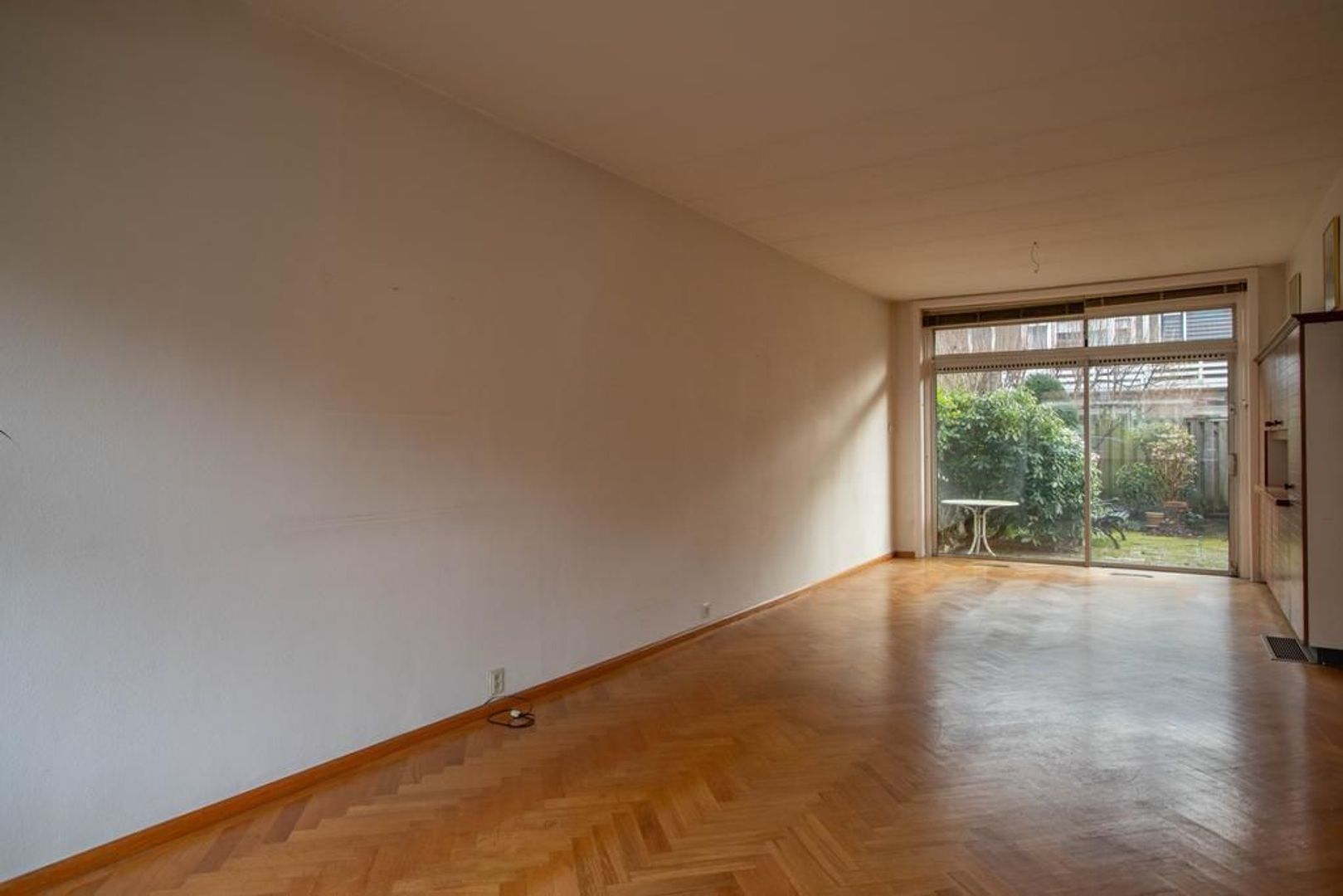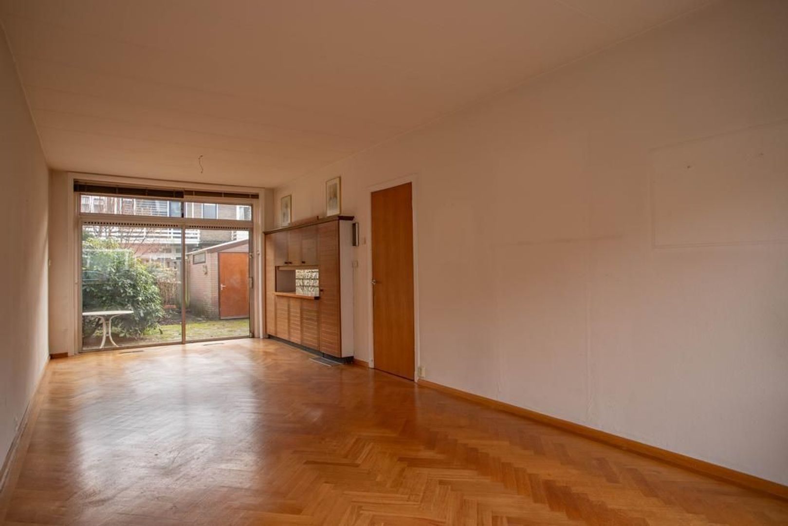 Entree met separaat toilet, inbouwkast en trapopgang naar de eerste verdieping. Via de hal betreedt je de woonkamer. De woonkamer is met een lengte van bijna 9 meter ruim van formaat te noemen. Dankzij de raampartijen aan beide zijdes van de woonkamer heeft de ruimte een fijne lichtinval. In de woonkamer is voldoende ruimte voor het creëren van een gezellig zithoek en het plaatsen van een royale eettafel. De woonkamer is voorzien van een houten visgraatvloer.